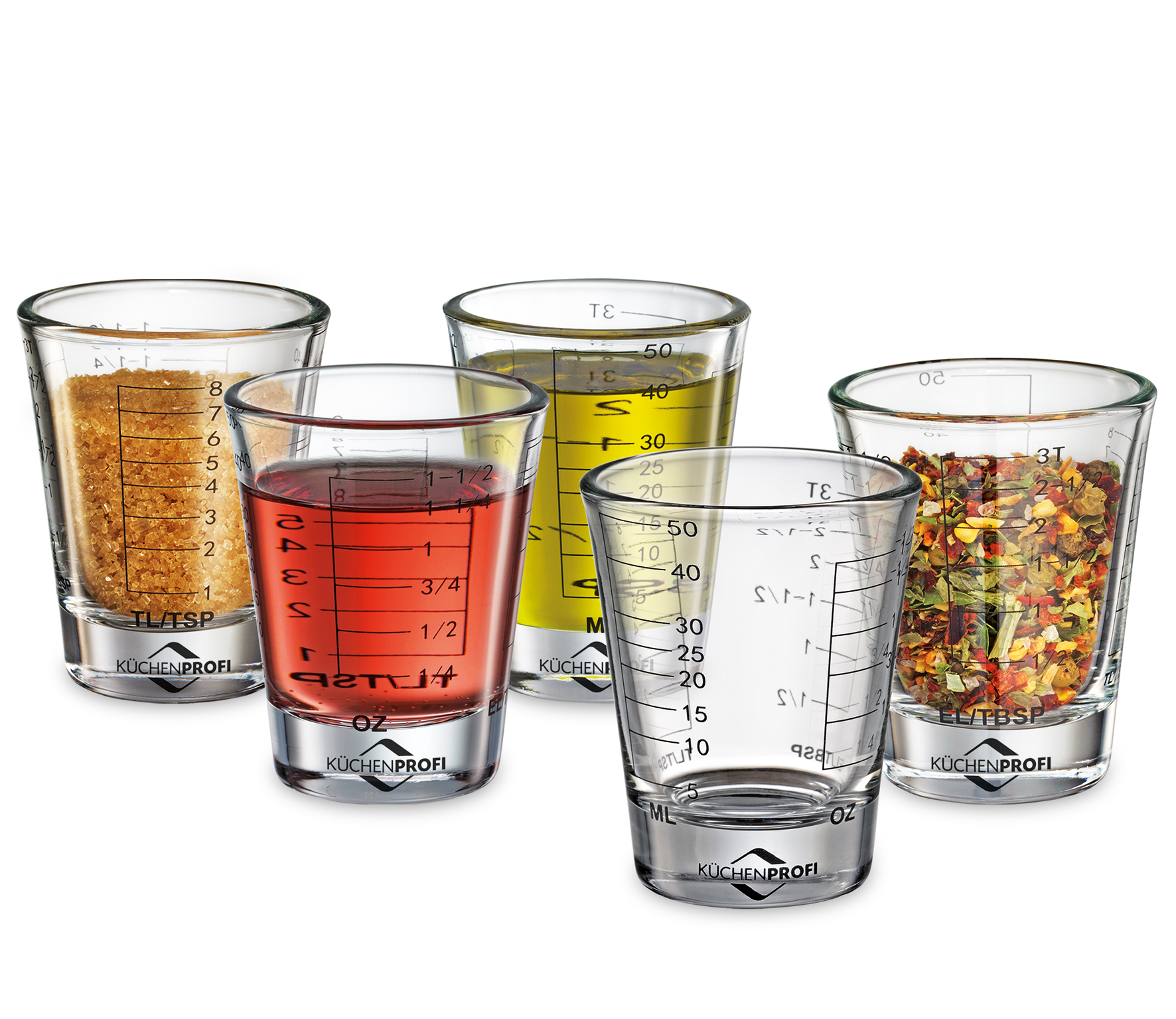 Für maximalen Durchblick beim Kochen und Backen. Die Mini-Messbecher von KÜCHENPROFI helfen beim Dosieren kleiner Mengen bis 50 ml. Perfekt für Öl, Essig, Milch oder Gewürze. Praktisch: Für feste und flüssige Lebensmittel gibt es eine separate Skala. Endlich hat das Rätselraten, wie hoch der Teelöffel beladen werden soll, ein Ende. Die Minis sind aus Glas, leicht zu reinigen und praktisch stapelbar. Manchmal helfen sie auch an der Cocktailbar aus.