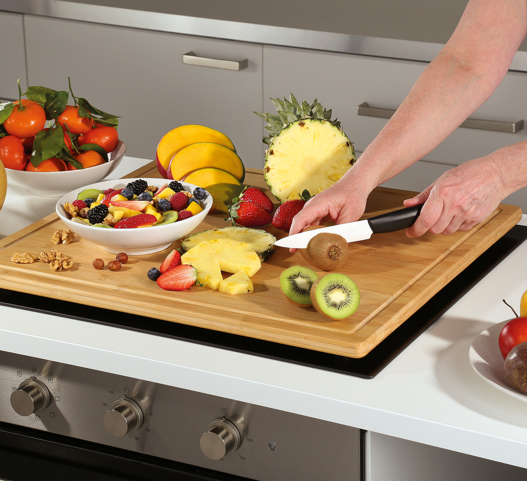 Für alle, die mehr Koch-Ideen als Platz in der Küche haben. Die Arbeits-/Herdabdeckplatte von ZASSENHAUS erweitert Ihren Spielraum im Nu. Legen Sie die Platte aus schnell nachwachsendem Bambus einfach auf Ihren Glaskeramikherd – fertig ist die zusätzliche Arbeitsfläche. Die rutschfesten Füße sorgen für ein sicheres Handling, das Filet oder das knackige Gemüse gelangen auf kurzem Weg in die Pfanne. Auch abseits des Herds ist die Platte mit der praktischen Saftrille als Schneidbrett ideal. Und wenn Sie Ihre neue kulinarische Kreation servieren, steht sie schon bereit.