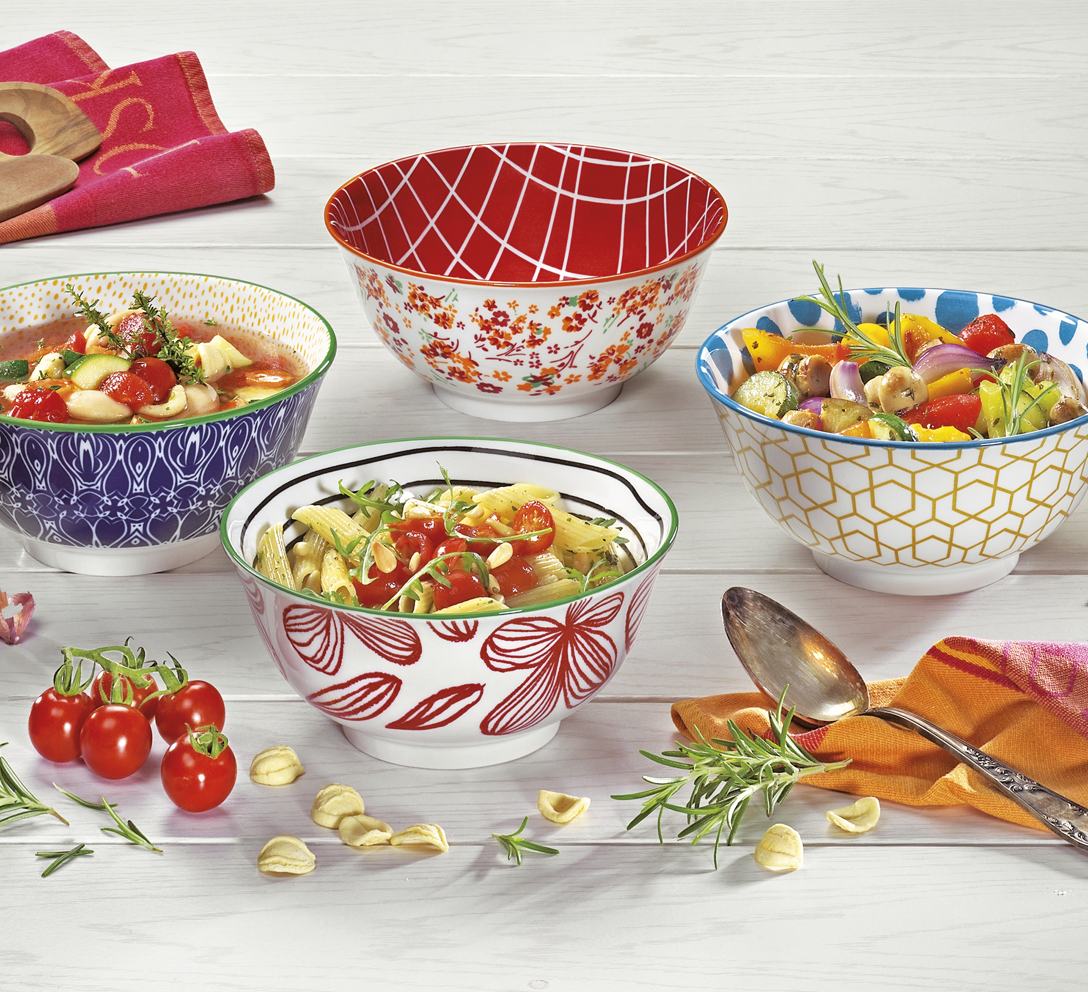 Für Freunde frischer Dekore. Die Bowls AMICI von cilio verbreiten rund um die Uhr gute Laune. Mit Obst oder Cerealien gefüllt starten Sie mit den bunten Schalen perfekt in den Tag. Am Schreibtisch halten sie Nüsse für die schnelle Energie zwischendurch bereit. Beim italienischen Abend mit Freunden besinnen sie sich auf ihre Wurzeln und servieren mediterrane Köstlichkeiten von Aubergine bis Zucchini. Oder Sie füllen die fröhlichen Schalen mit Salat, Ramen, Pasta oder Knabbereien für den Fernsehabend. Wie auch immer der Anlass ist, von nun an haben Sie für jede Gelegenheit die richtigen Schalen im Schrank. Das bei circa 1.300 °C gebrannte Porzellan ist dank des glasierten Bodens leicht zur reinigen und geeignet für Spülmaschine und Mikrowelle. Und falls Sie mal ein Mitbringsel suchen - die Bowls eignen sich auch hervorragend als Geschenk zur Einweihung, zum Umzug, zum Geburtstag oder einfach so.