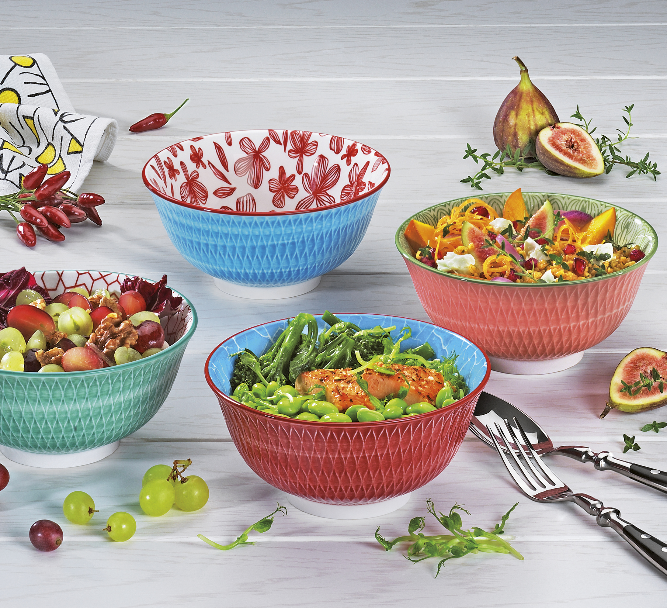 Für Freunde frischer Dekore. Die Bowls AMICI von cilio verbreiten rund um die Uhr gute Laune. Mit Obst oder Cerealien gefüllt starten Sie mit den bunten Schalen perfekt in den Tag. Am Schreibtisch halten sie Nüsse für die schnelle Energie zwischendurch bereit. Beim italienischen Abend mit Freunden besinnen sie sich auf ihre Wurzeln und servieren mediterrane Köstlichkeiten von Aubergine bis Zucchini. Oder Sie füllen die fröhlichen Schalen mit Salat, Ramen, Pasta oder Knabbereien für den Fernsehabend. Wie auch immer der Anlass ist, von nun an haben Sie für jede Gelegenheit die richtigen Schalen im Schrank. Das bei circa 1.300 °C gebrannte Porzellan ist dank des glasierten Bodens leicht zur reinigen und geeignet für Spülmaschine und Mikrowelle. Und falls Sie mal ein Mitbringsel suchen - die Bowls eignen sich auch hervorragend als Geschenk zur Einweihung, zum Umzug, zum Geburtstag oder einfach so.