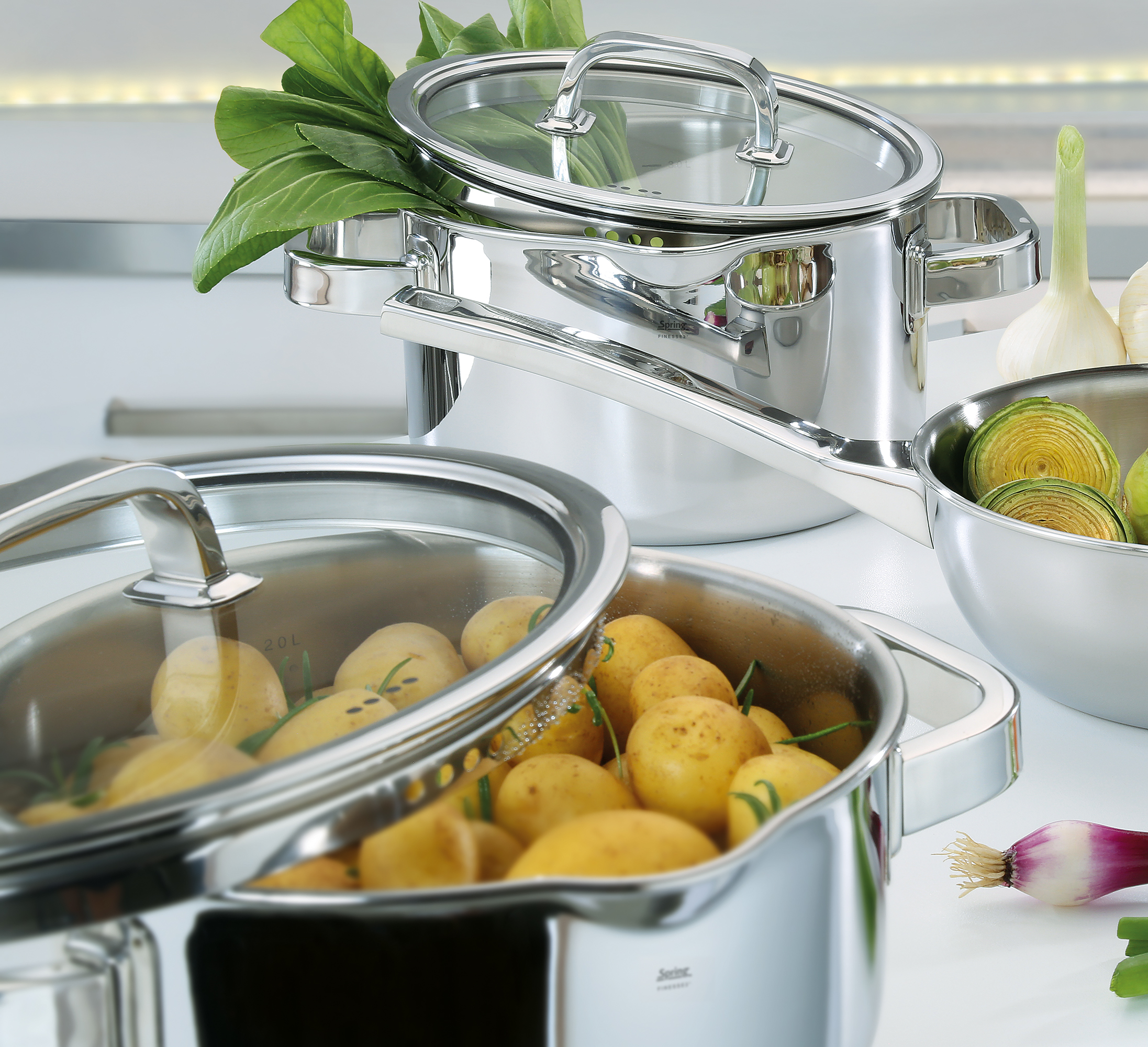 Eine feine Idee! SPRING serviert Ihnen mit der Topf-Serie FINESSE2+ die perfekte Mischung aus zeitlosem Design und hoher Funktionalität. Die vielseitigen Töpfe bewähren sich Tag für Tag, sowohl zu Hause als auch in der Sterneküche. Ihre köstlichen Kreationen garen gleichmäßig, zugleich sparen Sie Zeit und Energie. Das 5-Lagen Mehrschichtmaterial leitet die Wärme optimal vom Boden bis in die Topfwand. Der robuste Glasdeckel schließt dank Silikondichtung besonders dicht und ermöglicht ein schonendes Garen auf Sicht mit wenig Wasser, und die Topf-Innenskala macht den Messbecher überflüssig. Die ergonomisch geformten, wärmeisolierenden Griffe liegen gut in der Hand, und eine speziell geformte Schüttmulde sorgt dafür, dass beim Ausgießen nichts danebengeht. Die Töpfe sind für alle Herdarten inklusive Induktion geeignet und spülmaschinenfest. Das Anbraten und sanfte Schmoren größerer Fleischstücke ist die Spezialität des Bratentopfs. Genügend Platz für die Sauce hat er natürlich auch.
