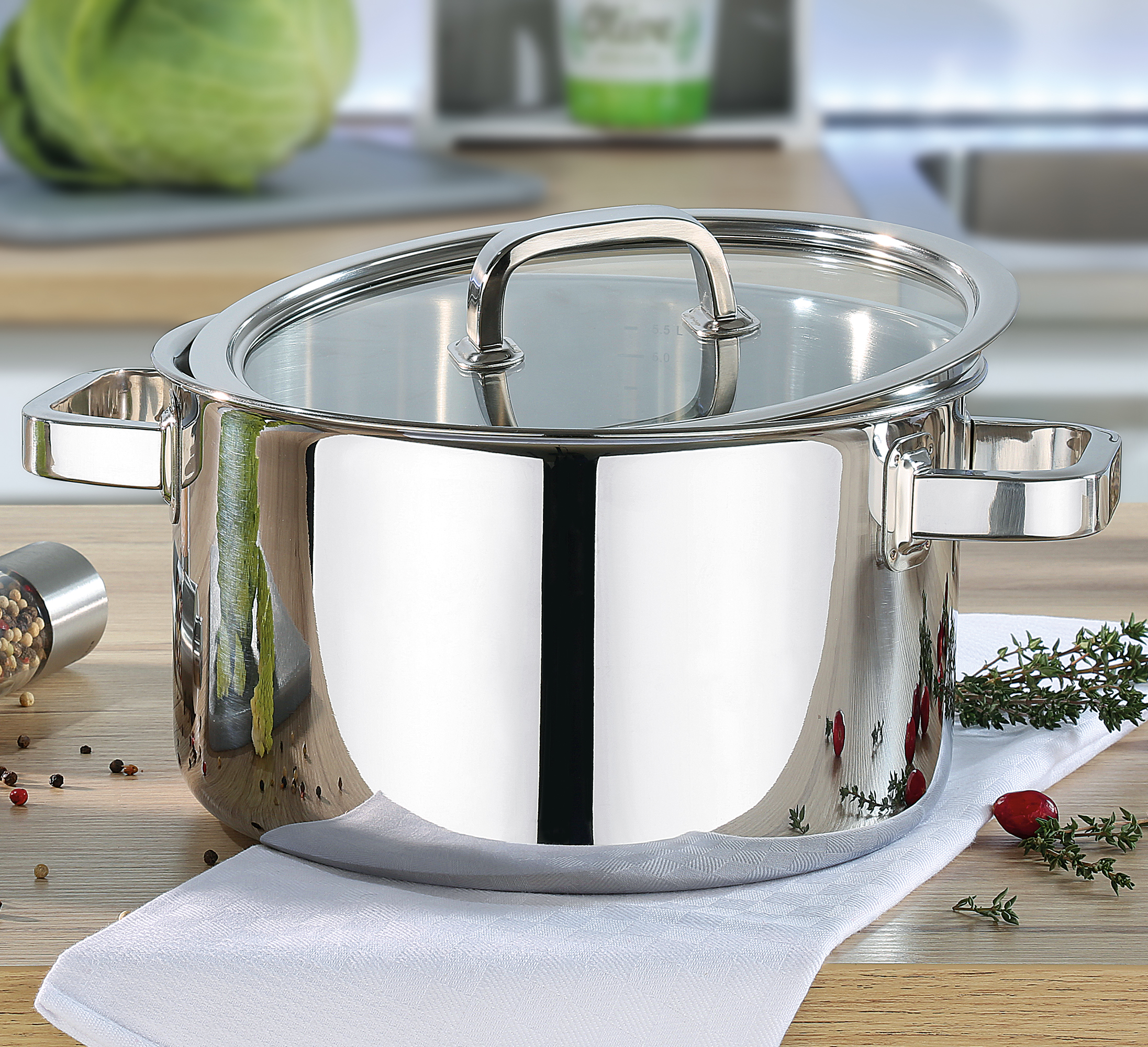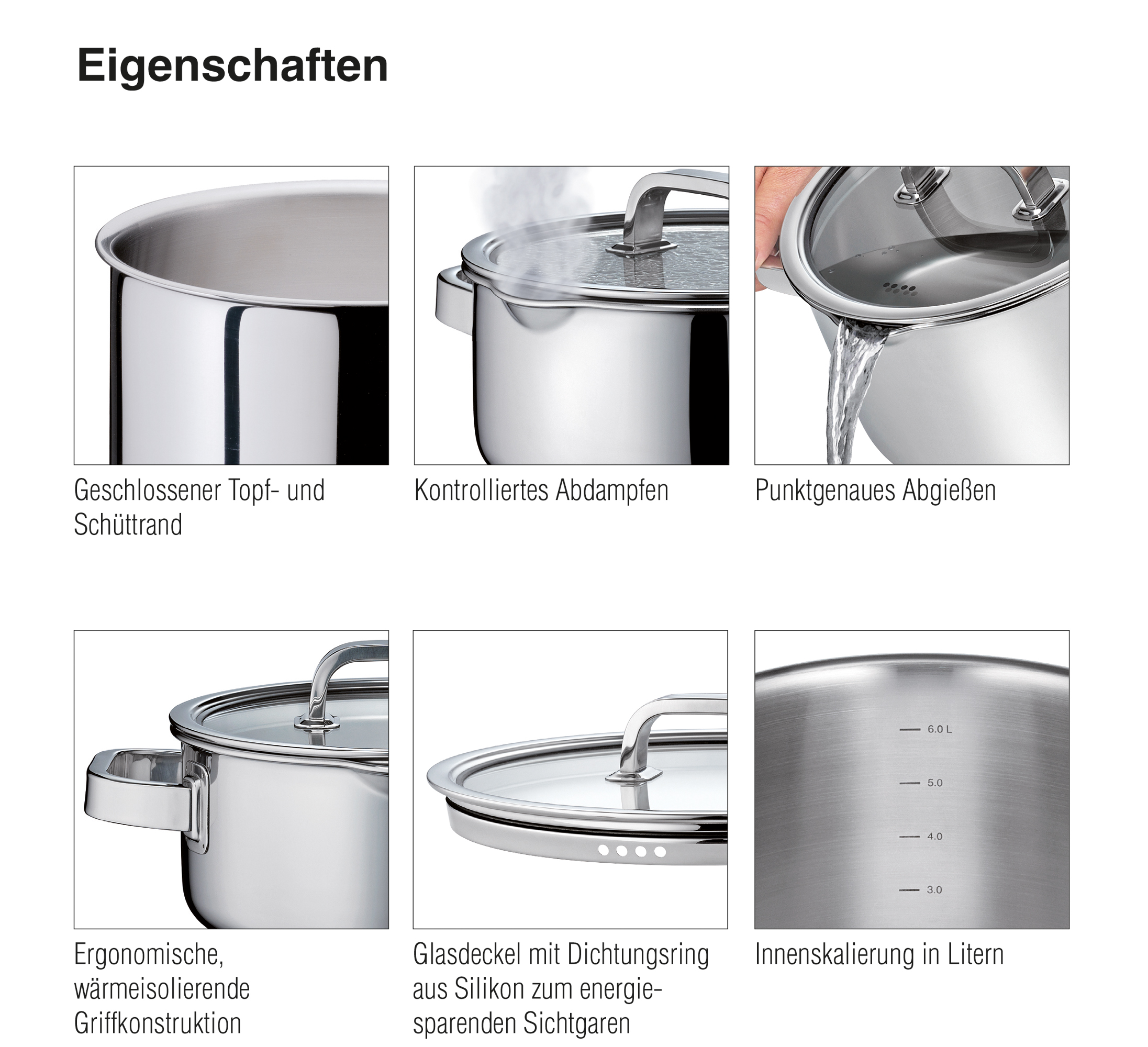 Material: 5-Lagen-Mehrschichtmaterial mit Außenschicht aus induktionstauglichem Edelstahl 18/0, innen Edelstahlschicht 18/10 und dreifachem Aluminiumkern. Geeignet für sämtliche Herdarten inklusive Induktion. Spülmaschinenfest.
