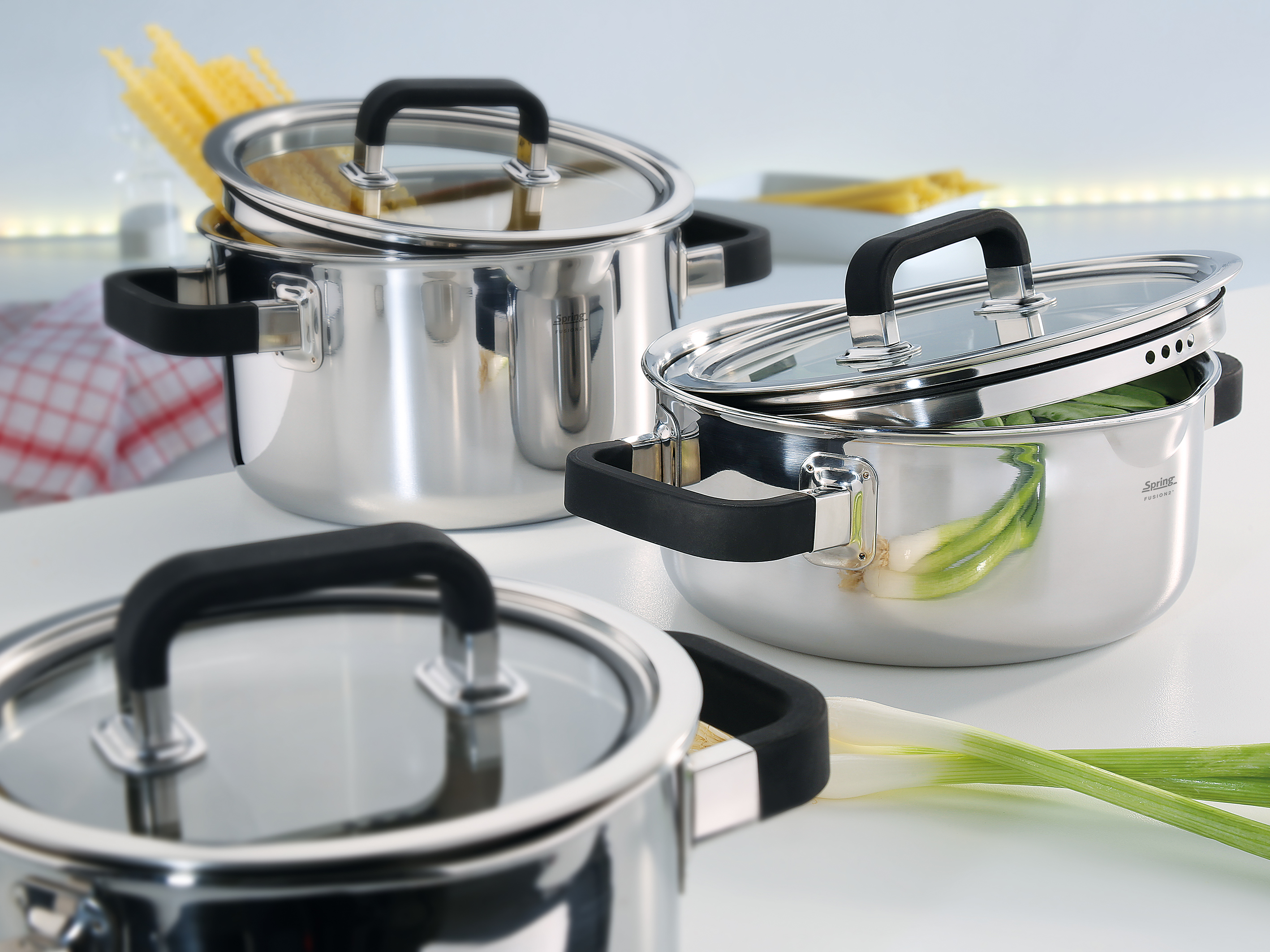 Edelstahl trifft Silikon. Die Griffe der Topfserie FUSION2+ von SPRING sind silikonummantelt. Das unterscheidet sie von den übrigen Serien des Traditionsunternehmens mit Schweizer Wurzeln. Bekannt und bewährt ist das 5-Lagen-Mehrschichtmaterial. Es leitet die Wärme schnell und gleichmäßig vom Boden bis in die Topfwand. Küchenchefs der Spitzengastronomie und ambitionierte Hobbyköche schätzen diese zeitsparende Art des Kochens. Weiterer Pluspunkt: Geschmack und Biss der Lebensmittel bleiben voll erhalten. Die Innenskalierung in Litern hilft bei der Zubereitung von Nudeln, Reis oder Gemüse, der Glasdeckel gewährt Ihnen beim wasserarmen Garen den Durchblick. Der speziell geformte, geschlossene Schüttrand ermöglicht das punktgenaue und kleckerfreie Abgießen von Flüssigkeiten und das Abdampfen gekochter Lebensmittel.