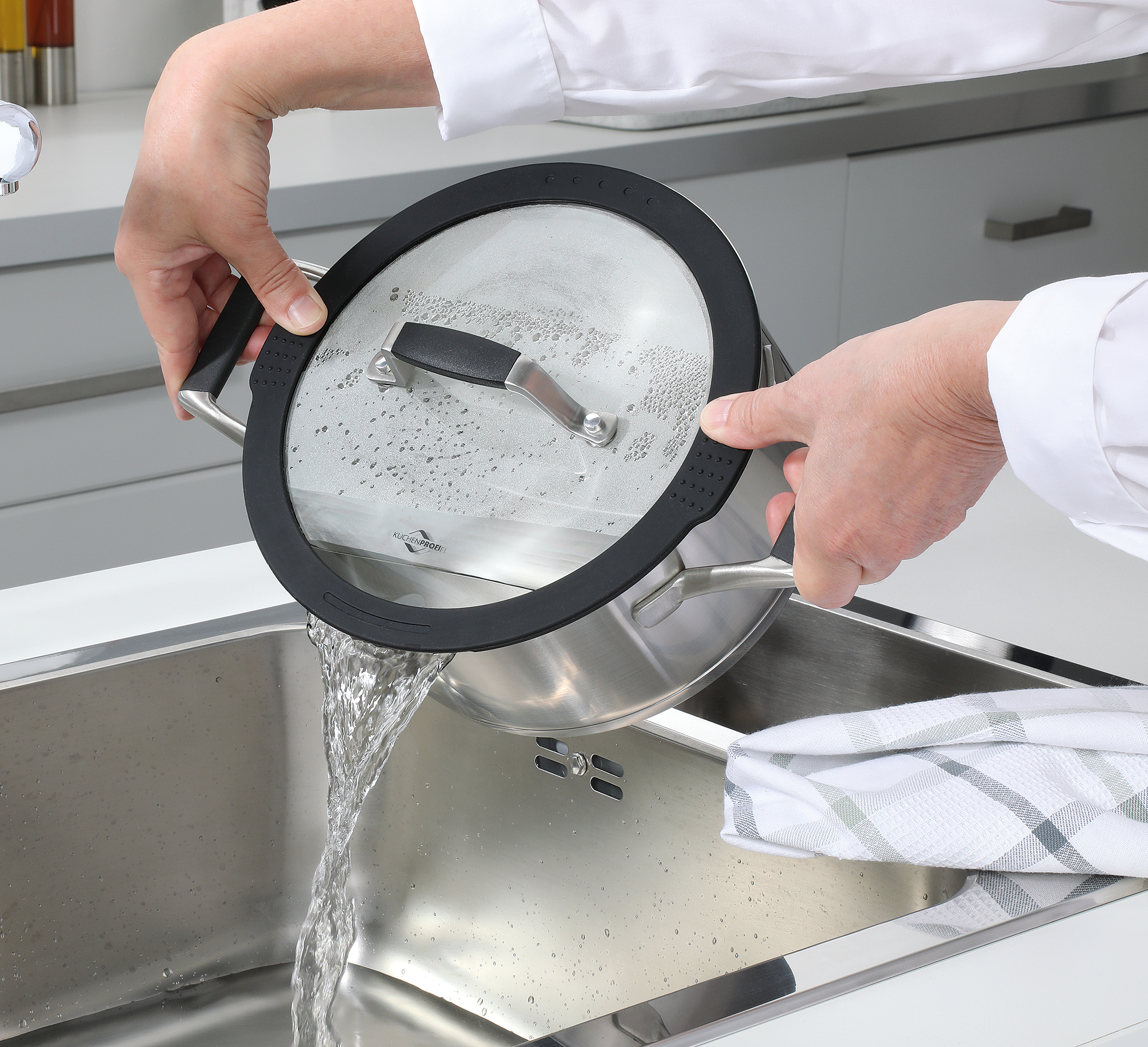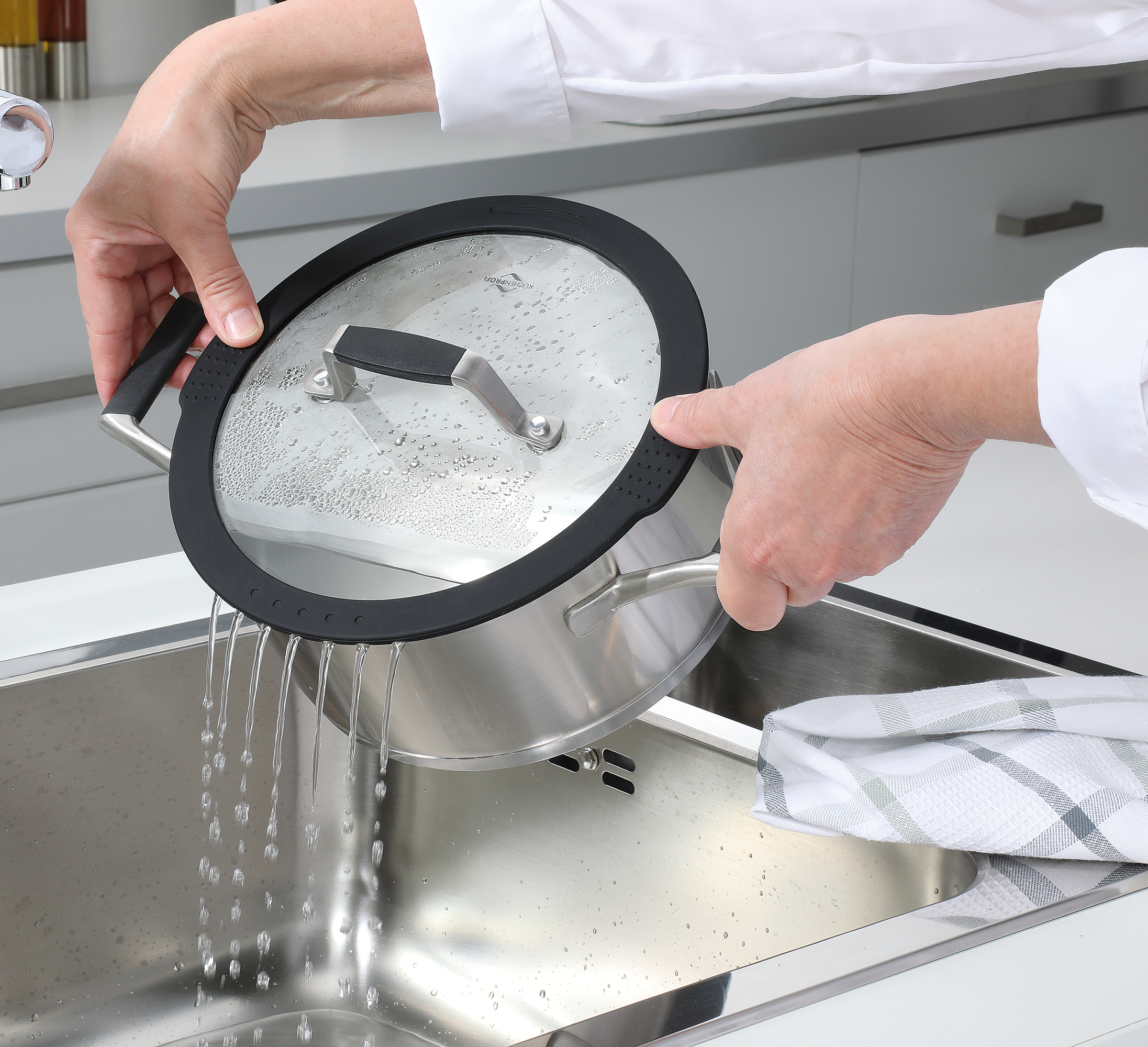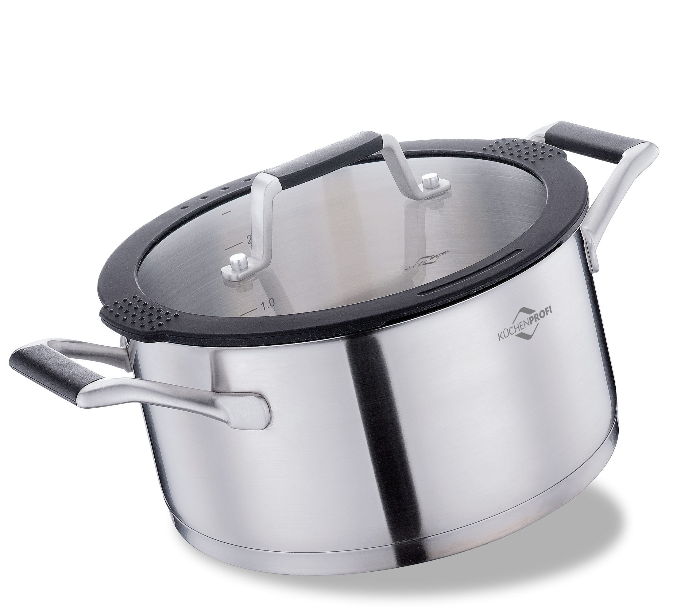 Material: rostfreier Edelstahl, Deckel aus Sicherheitsglas mit Silikonrand. Extrastarker Mehrschichtboden. Wärmeisolierende, silikonummantelte Griffe. Mit praktischer Innenskala. Geeignet für sämtliche Herdarten.