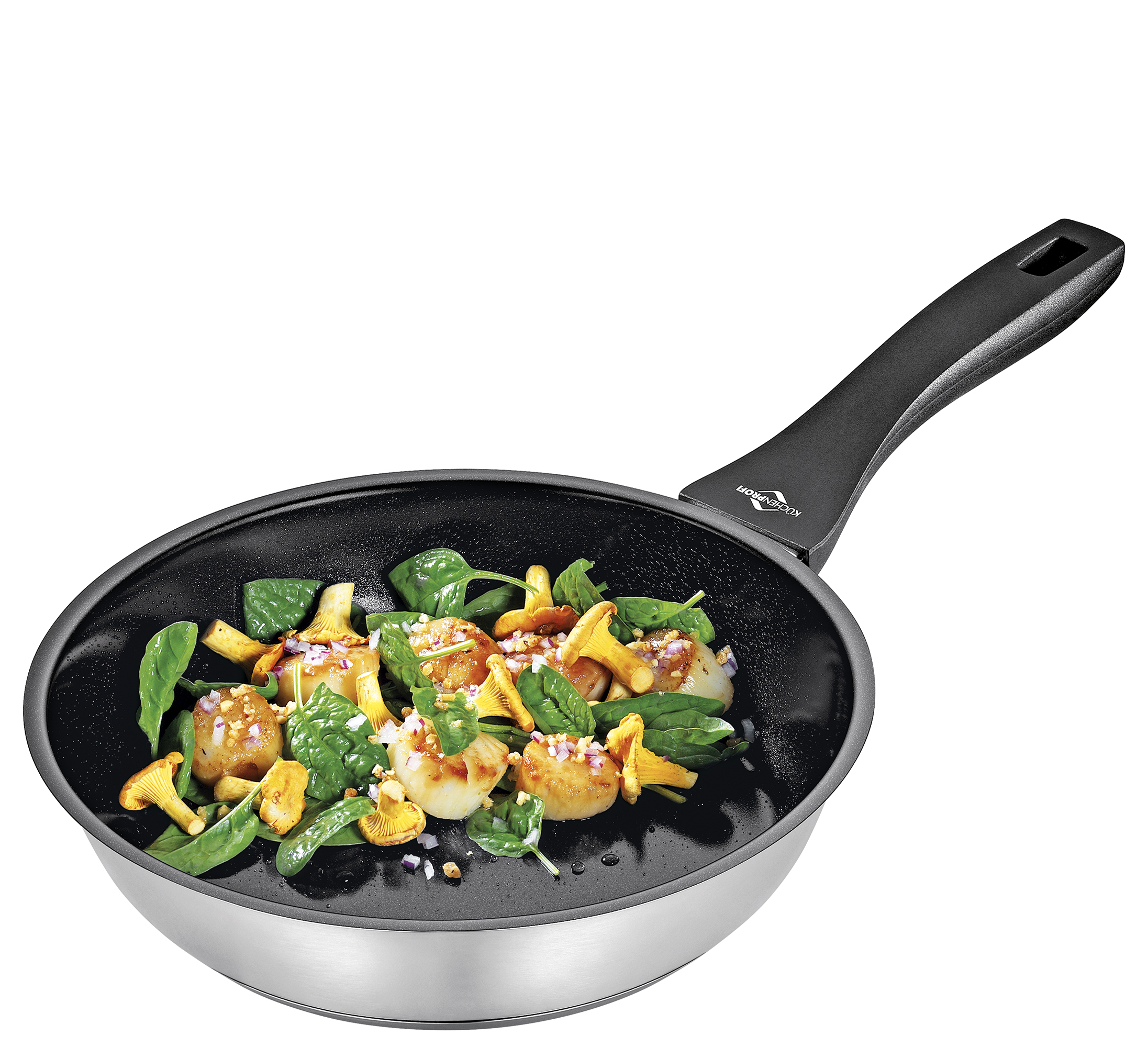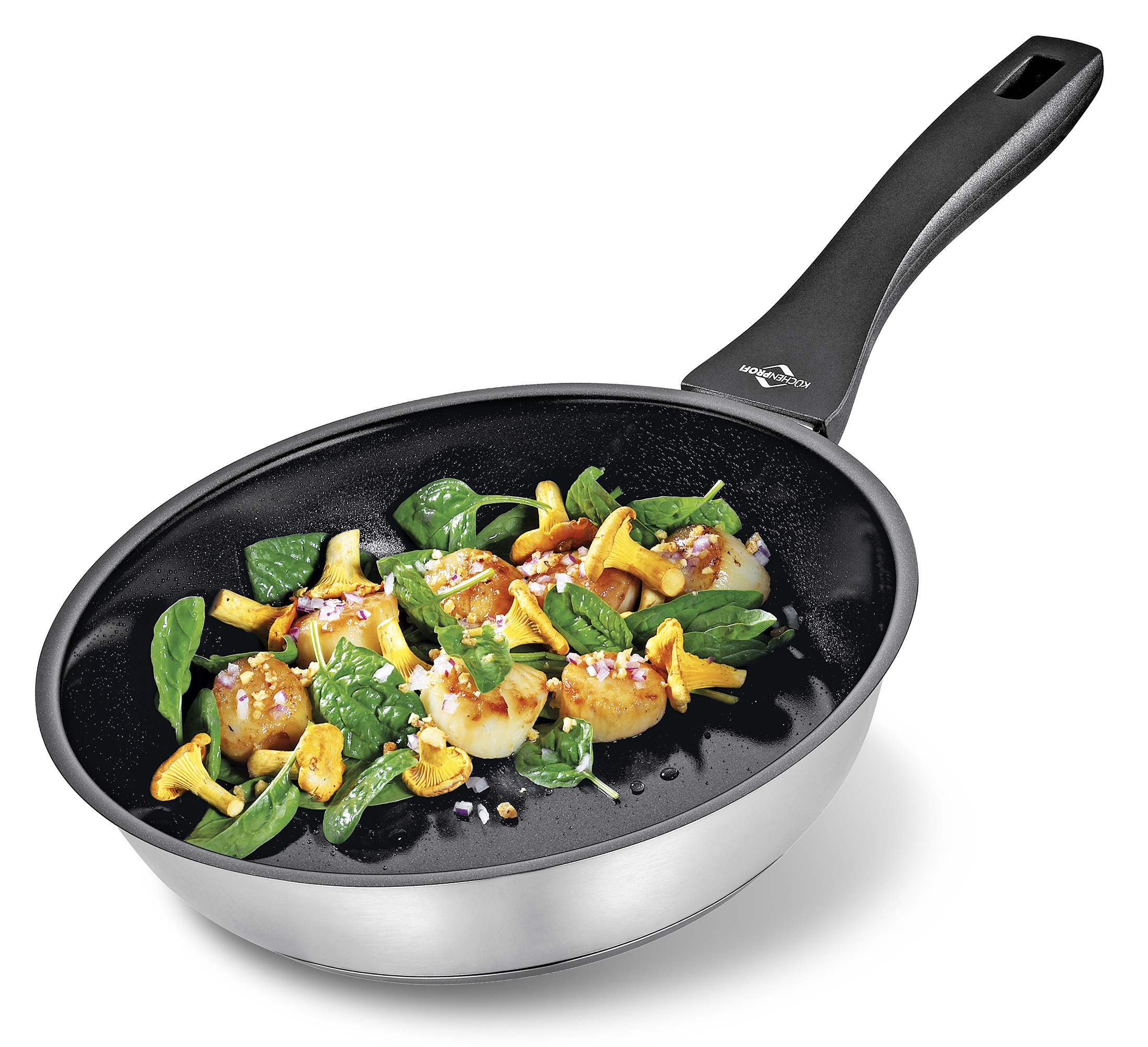 Material: Edelstahl rostfrei/hochwertiger Kunststoff. Hochwertige Antihaftbeschichtung, PFAS-frei. Extra starker Mehrschichtboden. Geeignet für alle Herdarten inkl. Induktion. Backofenfest bis 180 °C.