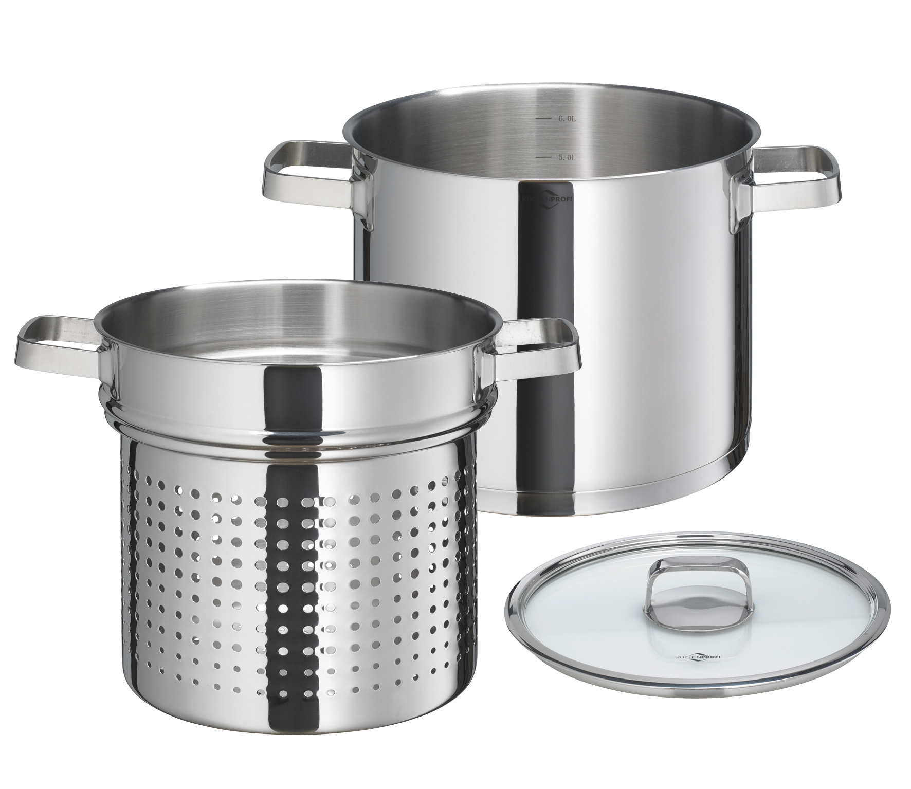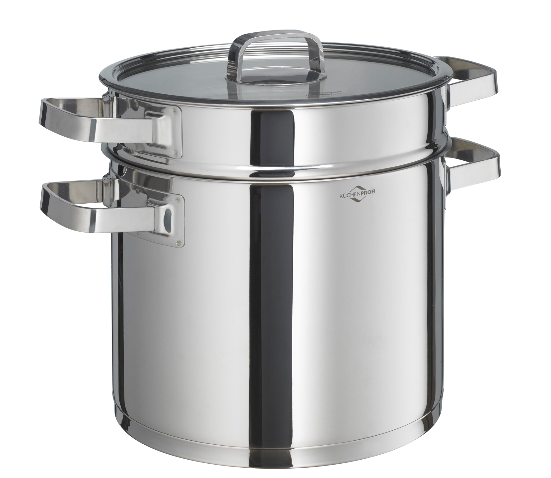 Ein echtes Allround-Talent. Suppen, Eintöpfe, große Mengen Kartoffeln und Gemüse sind in dem Kochtopf mit Pastaeinsatz SAN REMO von KÜCHENPROFI bestens aufgehoben. Denn mit seinem Fassungsvermögen von sieben Litern steckt er einiges weg. Perfekt, wenn Sie für viele Personen oder auf Vorrat kochen möchten. Für noch mehr Abwechslung in Ihrer Küche sorgt der Pastaeinsatz. Pro 100 Gramm Teigwaren messen Sie einen Liter Wasser mit der praktischen Topf-Innenskala ab. Dann garen Sie die Nudeln in dem Sieb und nehmen sie sicher aus dem heißen Wasser. Gut durchdacht ist auch der Rest des Topfes. Der extra starke Mehrschichtboden ist für alle Herdarten inklusive Induktion geeignet und verteilt die Hitze gleichmäßig. Der Deckel aus Sicherheitsglas gewährt Ihnen den vollen Durchblick und an den wärmeisolierten Griffen bringen Sie den Erbseneintopf direkt auf den Tisch.