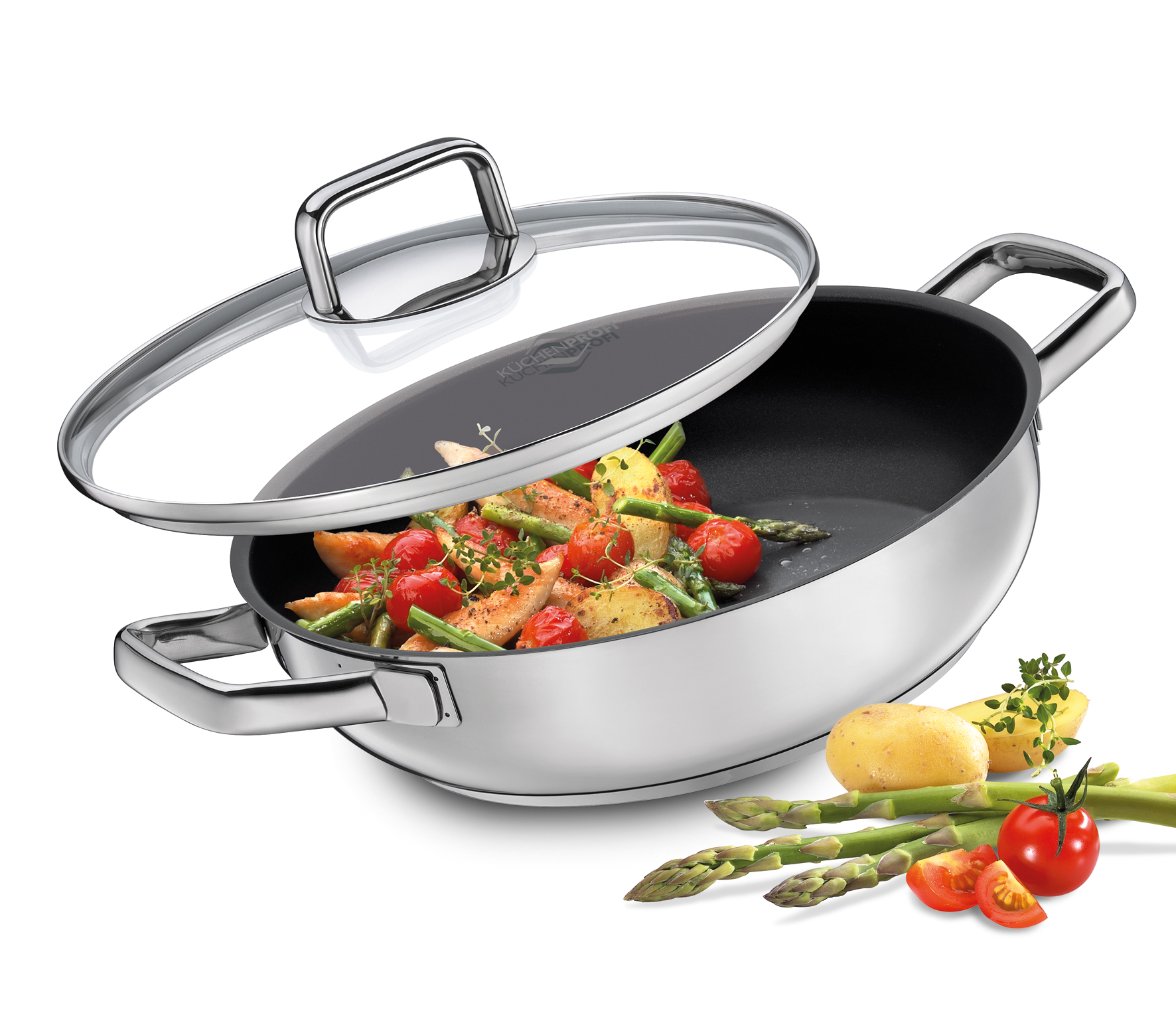 Material: rostfreier Edelstahl, Deckel aus Sicherheitsglas. Extra starker Mehrschichtboden. Hochwertige Antihaftbeschichtung. Geeignet für sämtliche Herdarten inklusive Induktion. Backofenfest bis 220 °C.