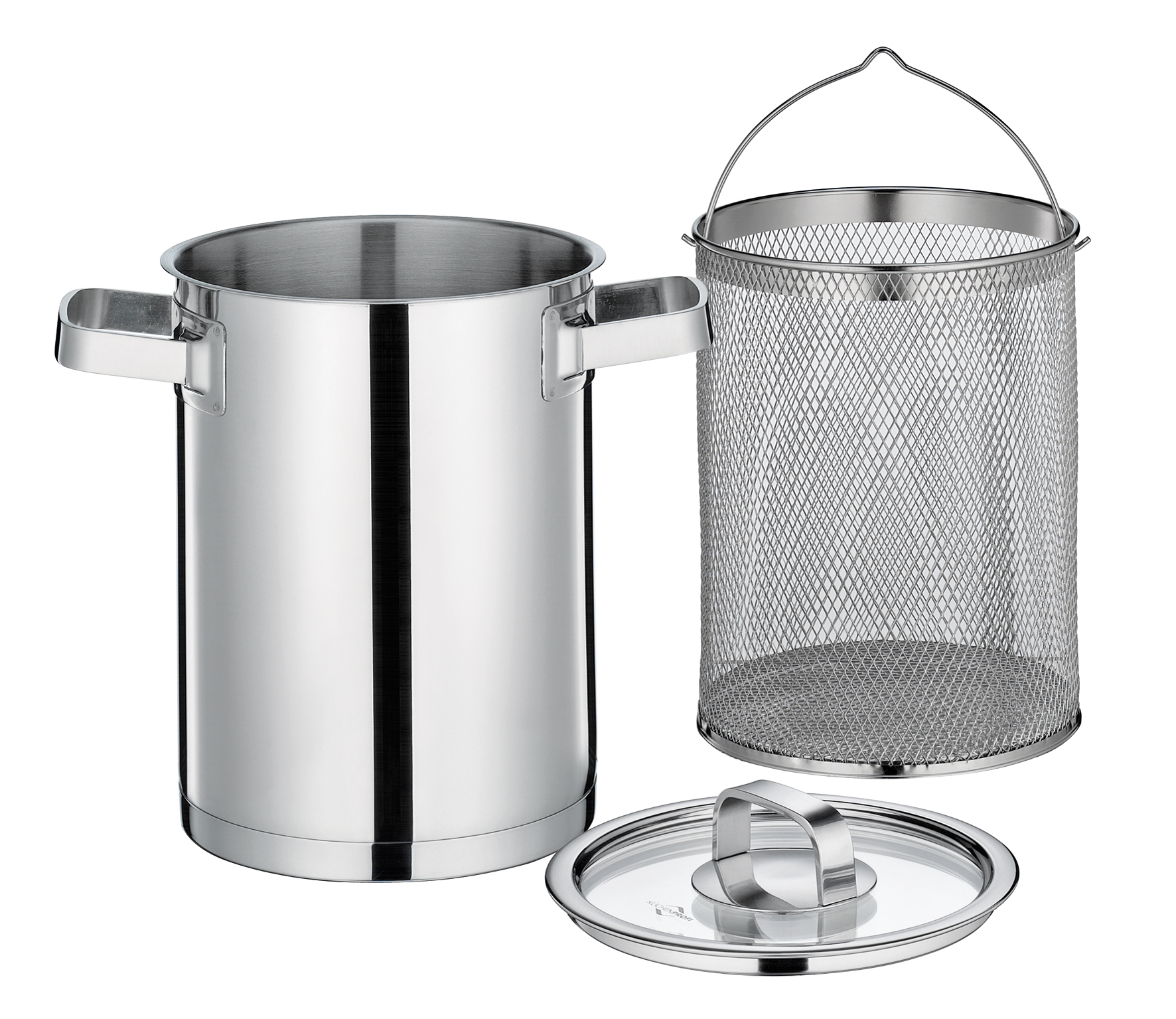 Material: rostfreier Edelstahl, mit Edelstahleinsatz, Sandwichboden, Glasdeckel. Für Elektro, Gas, Glaskeramik und Induktion.