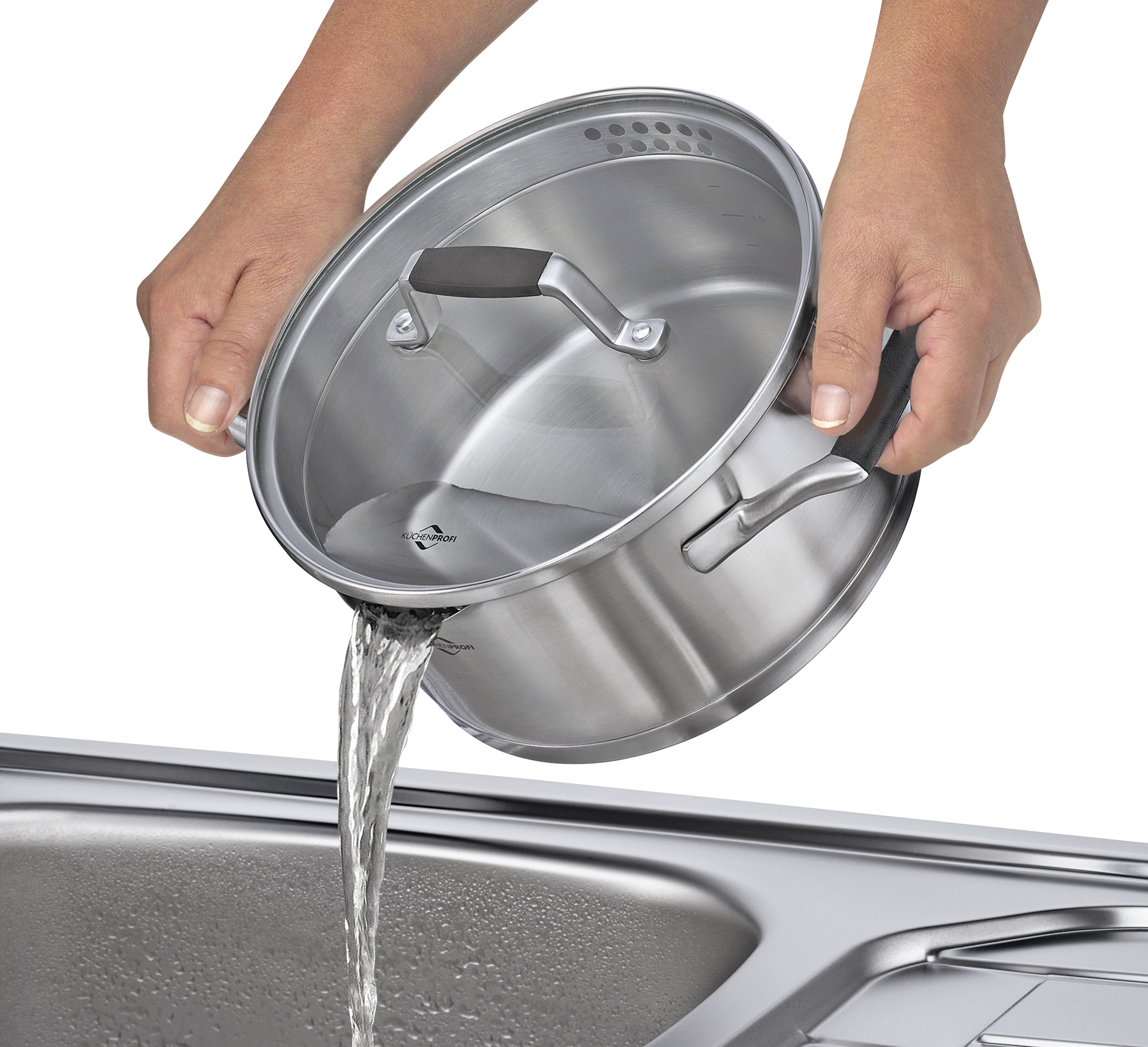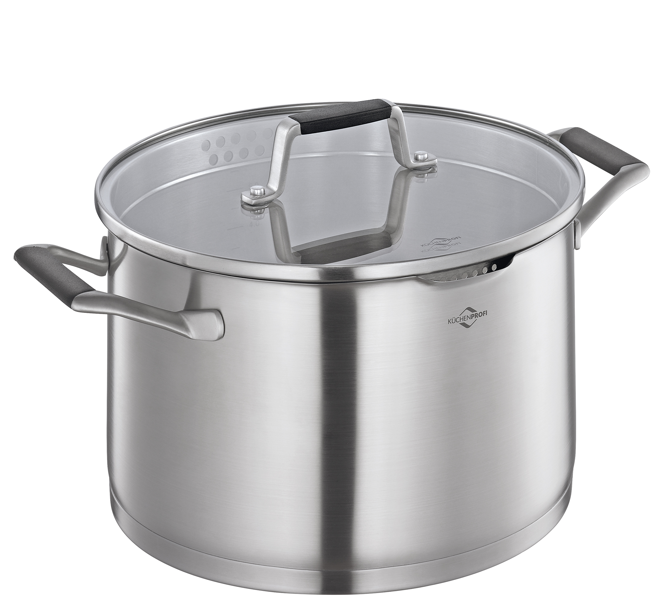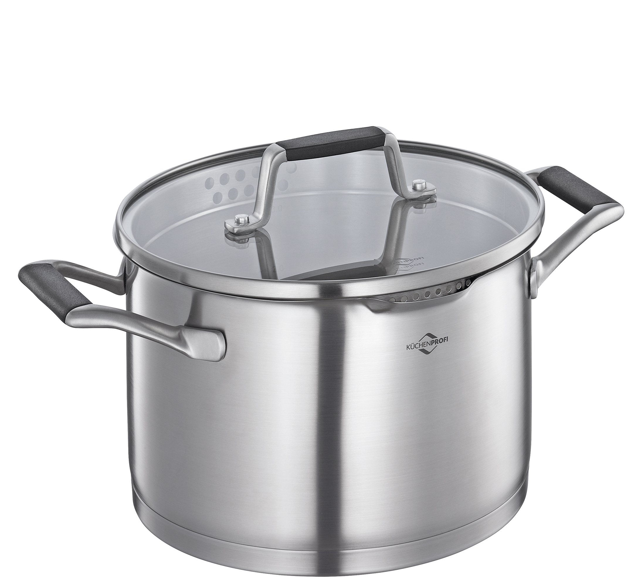 Mehrschichtboden, Deckel aus Sicherheitsglas inklusive feinem und grobem Sieb zum Abgießen. Mit praktischer Innenskala und Ausgießer. Geeignet für alle Herdarten inklusive Induktion.