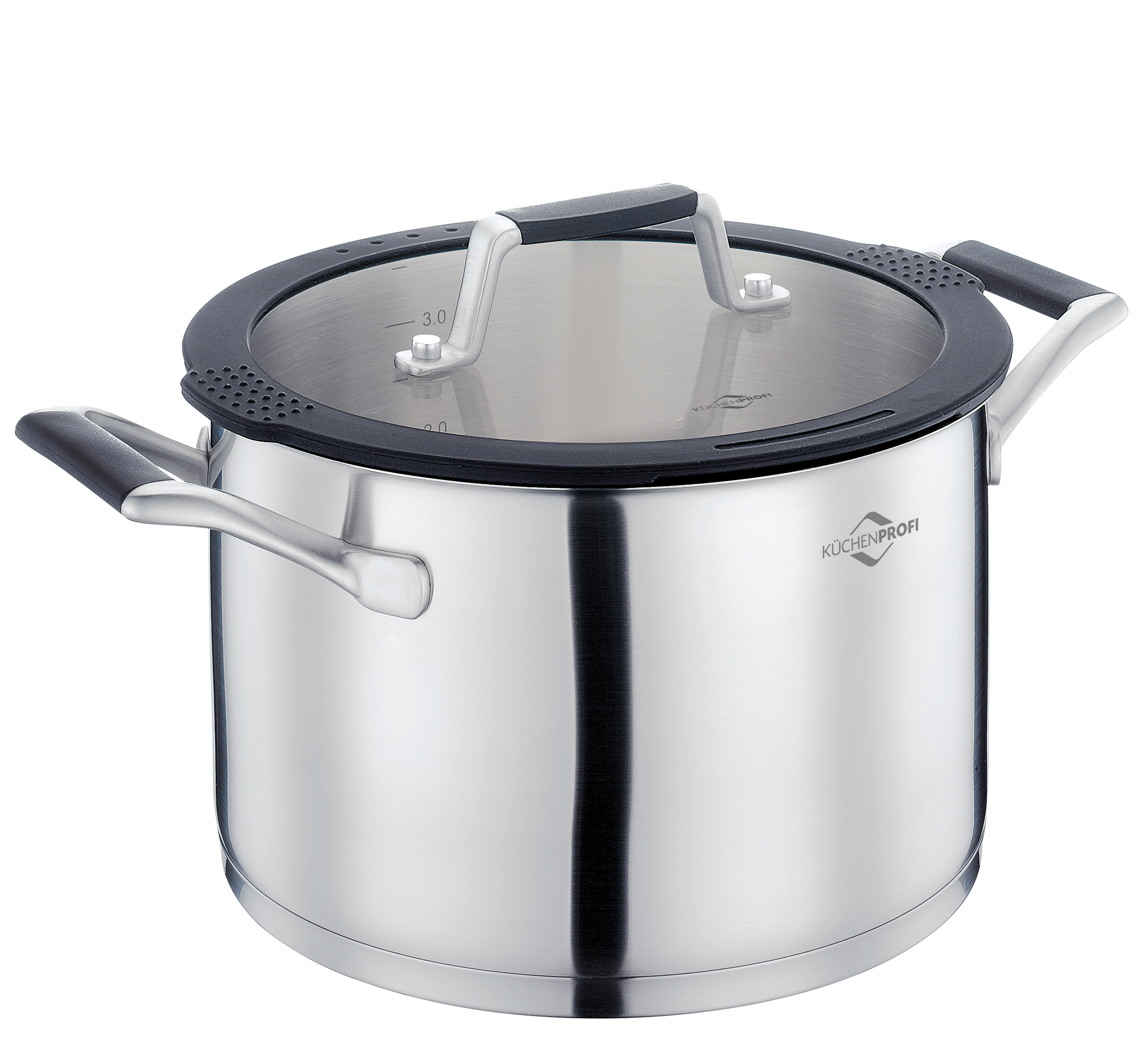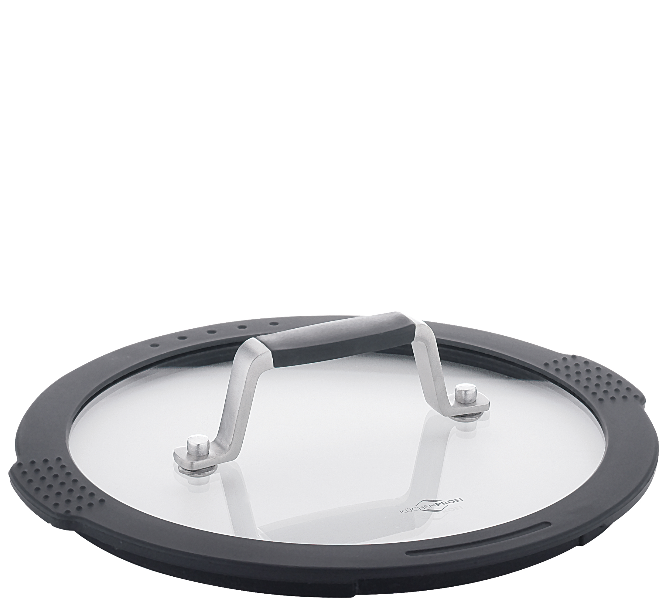 Material: rostfreier Edelstahl, Deckel aus Sicherheitsglas mit Silikonrand. Extrastarker Mehrschichtboden. Wärmeisolierende, silikonummantelte Griffe. Mit praktischer Innenskala. Geeignet für sämtliche Herdarten.
