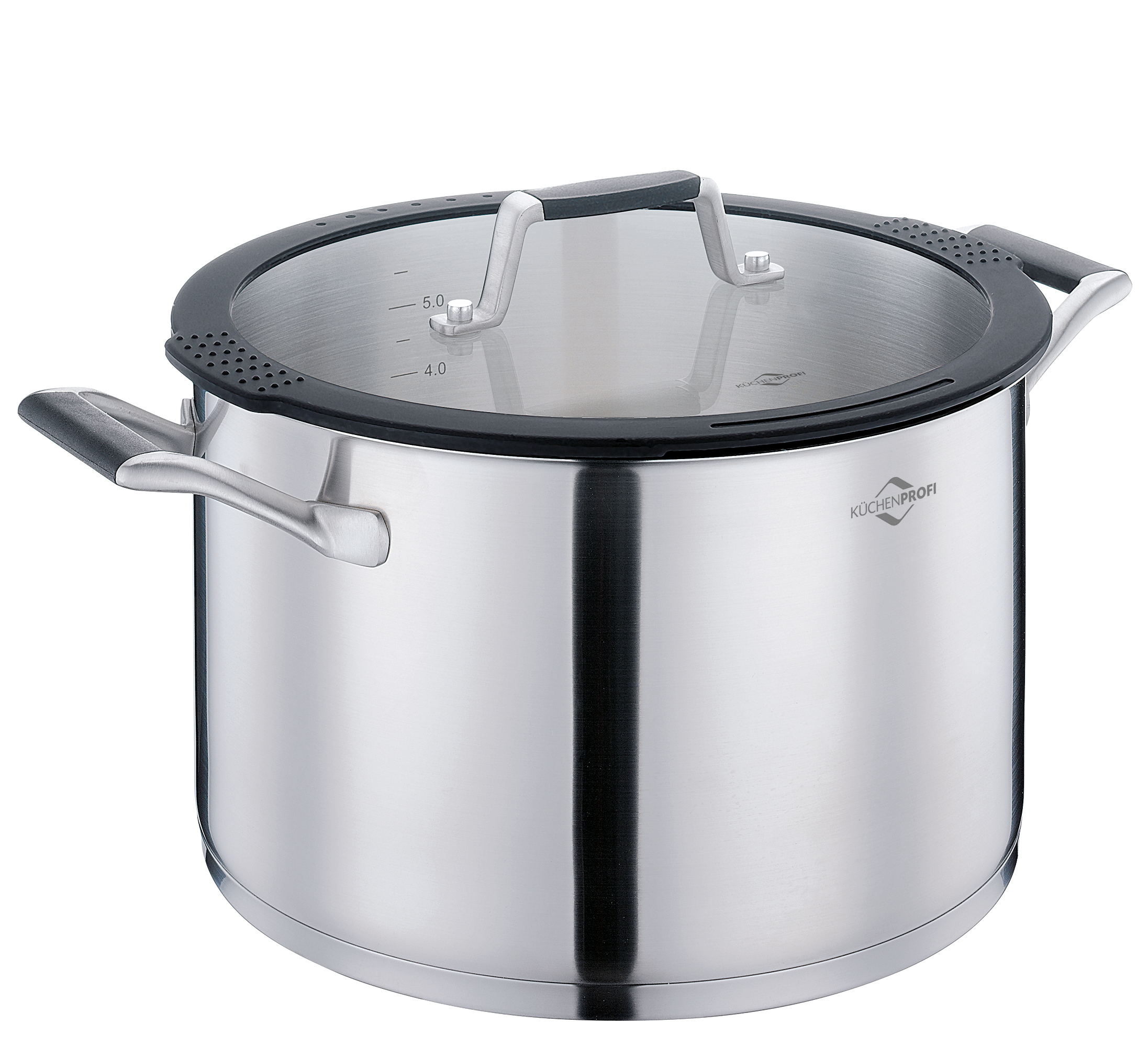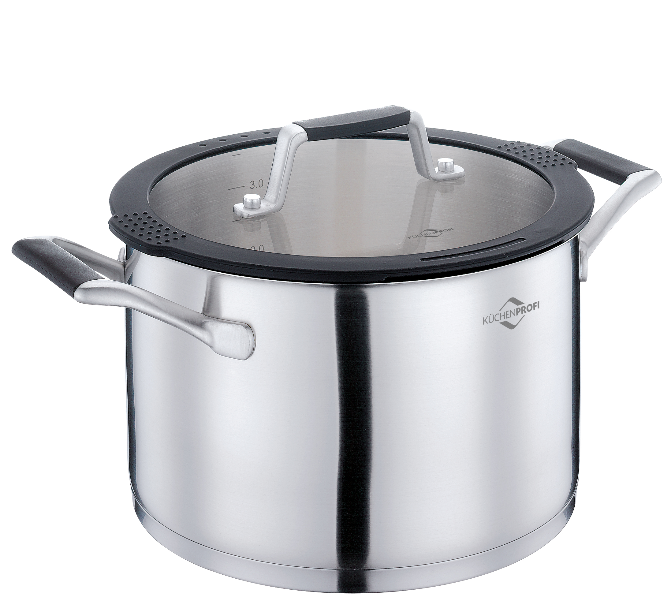 Wenn Sie für Ihre Freunde oder die Familie kochen, ist das KÜCHENPROFI Topfset COMO Feuer und Flamme. Die drei Kochtöpfe und der Bratentopf geben alles, damit Ihre Speisen gelingen. Bei vier verschiedenen Größen ist für jeden Anlass und für jede Herdplatte das richtige Maß dabei. Der extrastarke Mehrschichtboden leistet ganze Arbeit beim gleichmäßigen Garen von Fleisch, Fisch und Gemüse. Er verteilt die Hitze rasch im ganzen Topf. Der Deckel aus Sicherheitsglas mit praktischer Abgieß- und Siebfunktion ermöglicht eine effiziente Zubereitung Ihrer Speisen. Dank seiner Silikonumrandung liegt der Deckel sanft auf dem Topf auf, störende Klappergeräusche beim Kochen gehören der Vergangenheit an. Die wärmeisolierenden Griffe liegen sicher in der Hand. So bringt das Topfset alles mit, was Sie für den täglichen Gebrauch benötigen, und Sie können sich voll und ganz auf Ihre kreativen Kreationen konzentrieren.