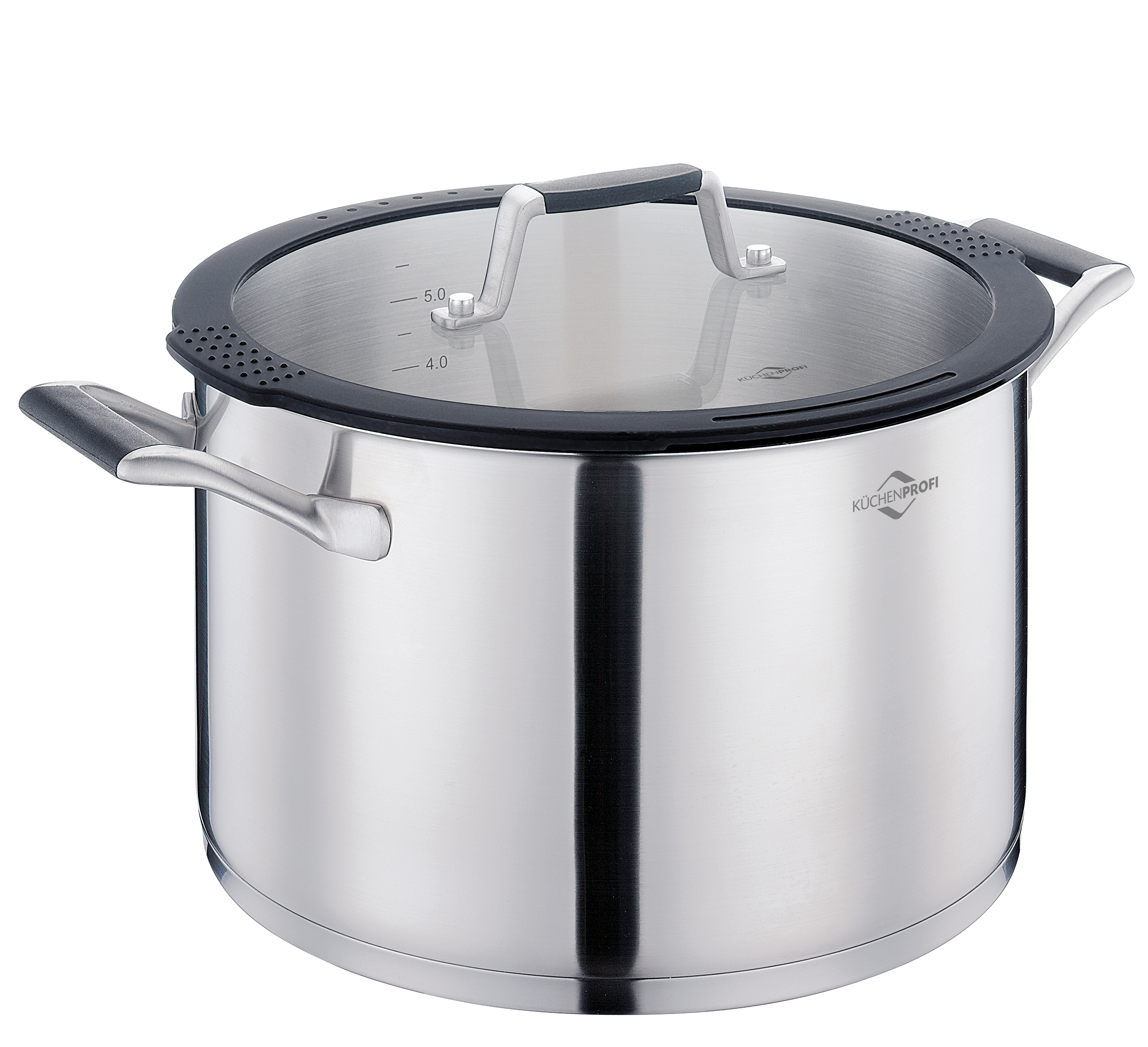 Wenn Sie für Ihre Freunde oder die Familie kochen, ist das KÜCHENPROFI Topf-Set COMO Feuer und Flamme. Die drei Kochtöpfe und der Bratentopf geben alles, damit Ihre Speisen gelingen. Bei vier verschiedenen Größen ist für jeden Anlass und für jede Herdplatte das richtige Maß dabei. Der extrastarke Mehrschichtboden leistet ganze Arbeit beim gleichmäßigen Garen von Fleisch, Fisch und Gemüse. Er verteilt die Hitze rasch im ganzen Topf. Der Deckel aus Sicherheitsglas mit praktischer Abgieß- und Siebfunktion ermöglicht eine effiziente Zubereitung Ihrer Speisen. Dank seiner Silikonumrandung liegt der Deckel sanft auf dem Topf auf, störende Klappergeräusche beim Kochen gehören der Vergangenheit an. Die wärmeisolierenden Griffe liegen sicher in der Hand. So bringt das Topf-Set alles mit, was Sie für den täglichen Gebrauch benötigen, und Sie können sich voll und ganz auf Ihre kreativen Kreationen konzentrieren.