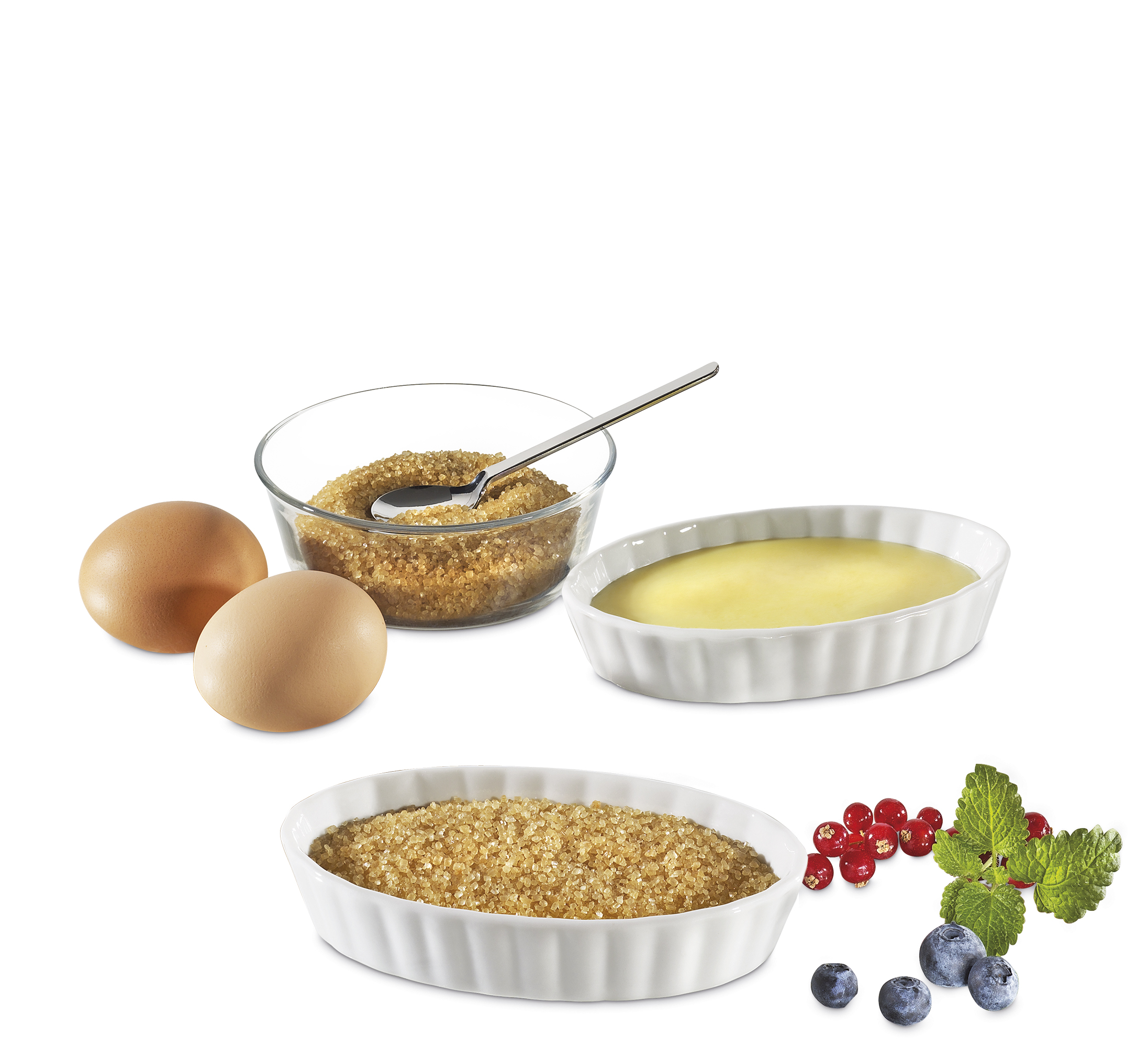 Sie gehören zusammen wie die Schlagsahne und die Vanilleschote. Mit dem Crème Brûlée-Set von KÜCHENPROFI haben Sie den Experten für das beliebte französische Dessert zur Hand. Der Brenner zaubert die leicht herbe Karamellkruste, die den perfekten Kontrast zu der süßen Vanillecreme bietet. Das Gerät lässt sich mit einer Hand bedienen, die Größe der Flamme ist regulierbar, für punktgenaues Karamellisieren, Überkrusten, Bräunen oder auch Häuten von Paprika. Funktioniert auch bei Crema Catalana, der spanischen Spezialität, die mit Milch zubereitet wird. Beide Süßspeisen servieren Sie stilecht in den Porzellanschälchen. Sie vertragen die Hitze im Wasserbad und Backofen und wandern köstlich gefüllt in den Kühlschrank. Von da ist es nur noch ein kurzer Weg zum Esstisch, wo die zeitlos schönen Förmchen mit großem Hallo empfangen werden.