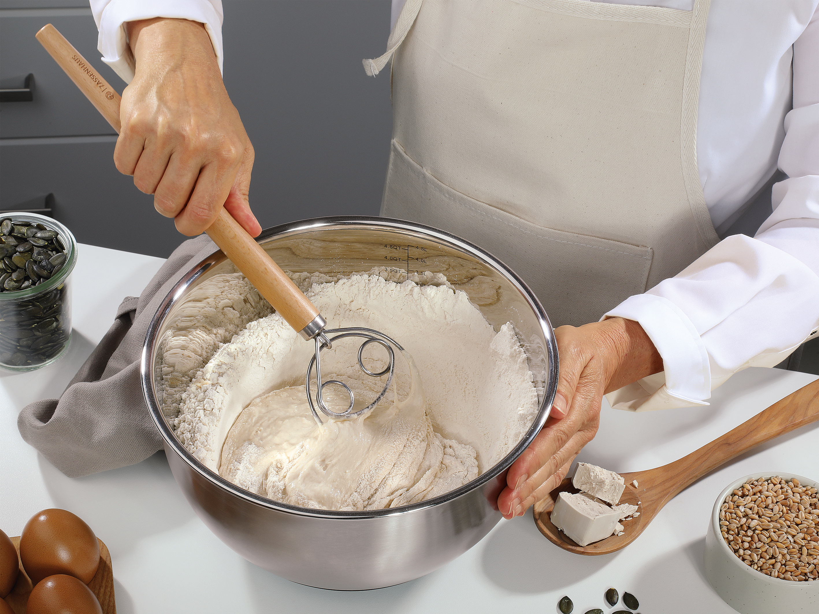 Selbstgebackenes Brot, frischer Pizzateig oder hauseigene Pasta: ein Genuss für alle, aber auch ein Kraftakt beim Verrühren des Teiges. Für dieses Problem hatte man in Dänemark eine praktische Lösung erdacht. Der Dänische Schneebesen von ZASSENHAUS hat einen speziell geformten Draht, an welchem sich der Teig nicht festsetzen kann und gleichmäßig verrührt wird. Dank des langen Griffes aus Buchen-Holz wird der Kraftaufwand minimiert. Die Reinigung ist ebenfalls leichter als beim klassischen Schneebesen. Verwöhnen Sie die Familie mit Ihren Kreationen, während das elektrische Rührgerät im Schrank verbleibt.