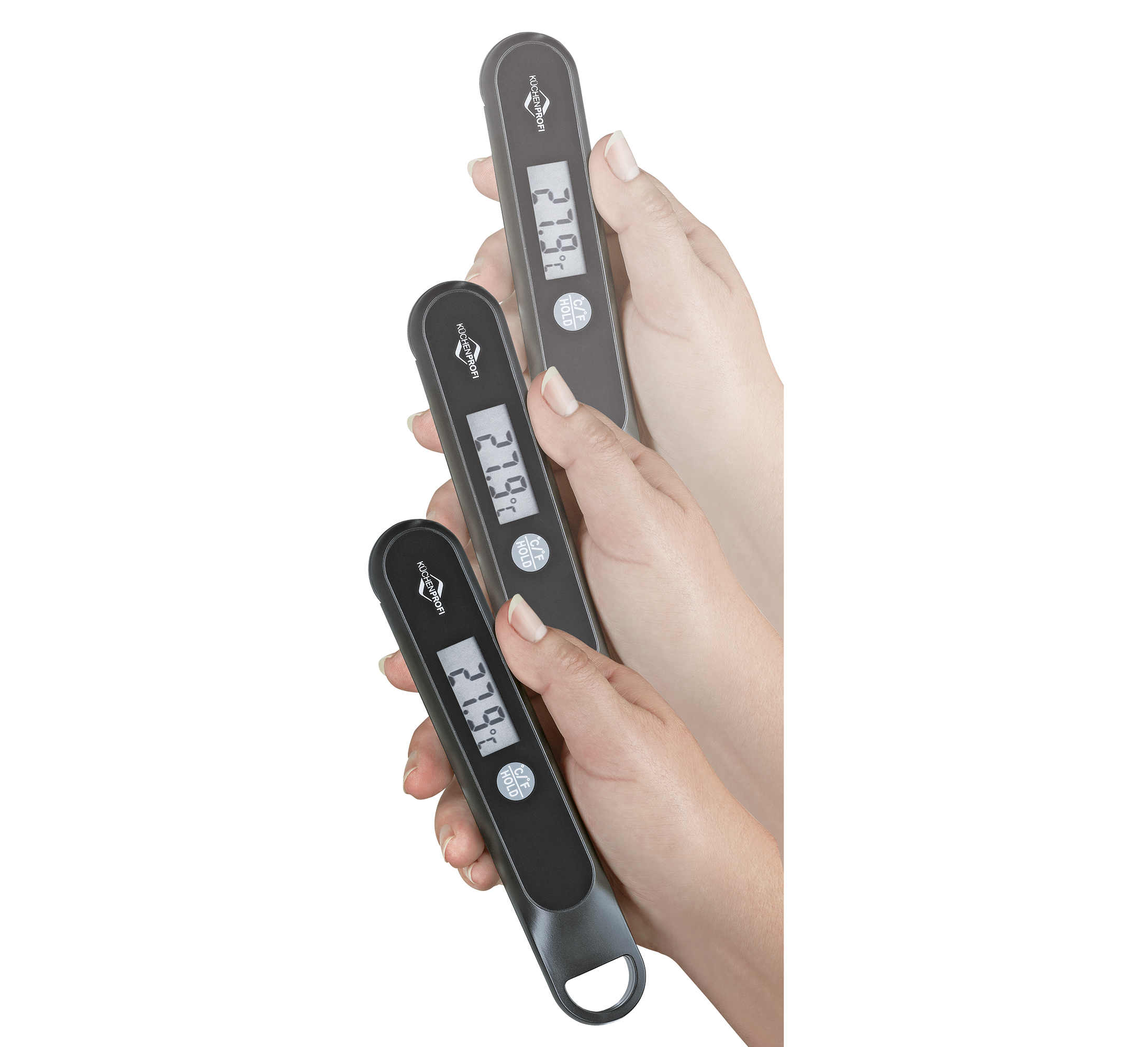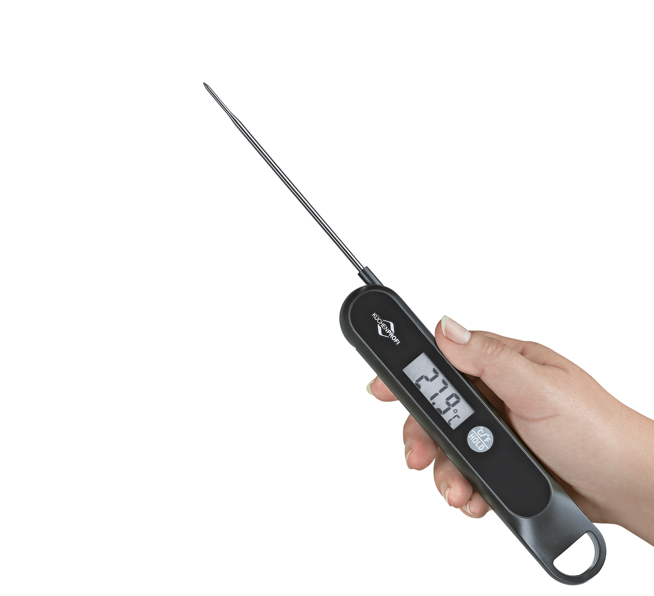 Den perfekten Braten schütteln Sie ab sofort aus dem Handgelenk. Das Digital-Thermometer SHAKE von KÜCHENPROFI kommt ohne Batterien aus, es wird durch Schütteln aufgeladen. Und dann überwacht es die Kerntemperatur von Roastbeef, Steak oder Geflügel. Sie haben die Gewissheit, dass Ihr Fleisch in der gewünschten Garstufe auf den Tisch kommt, ohne es anschneiden zu müssen. Der Saft und die Optik bleiben erhalten. Der Messfühler kann in verschiedenen Winkeln eingestellt werden, die Kerntemperatur ist auf dem LC-Display mit großen Ziffern gut ablesbar.