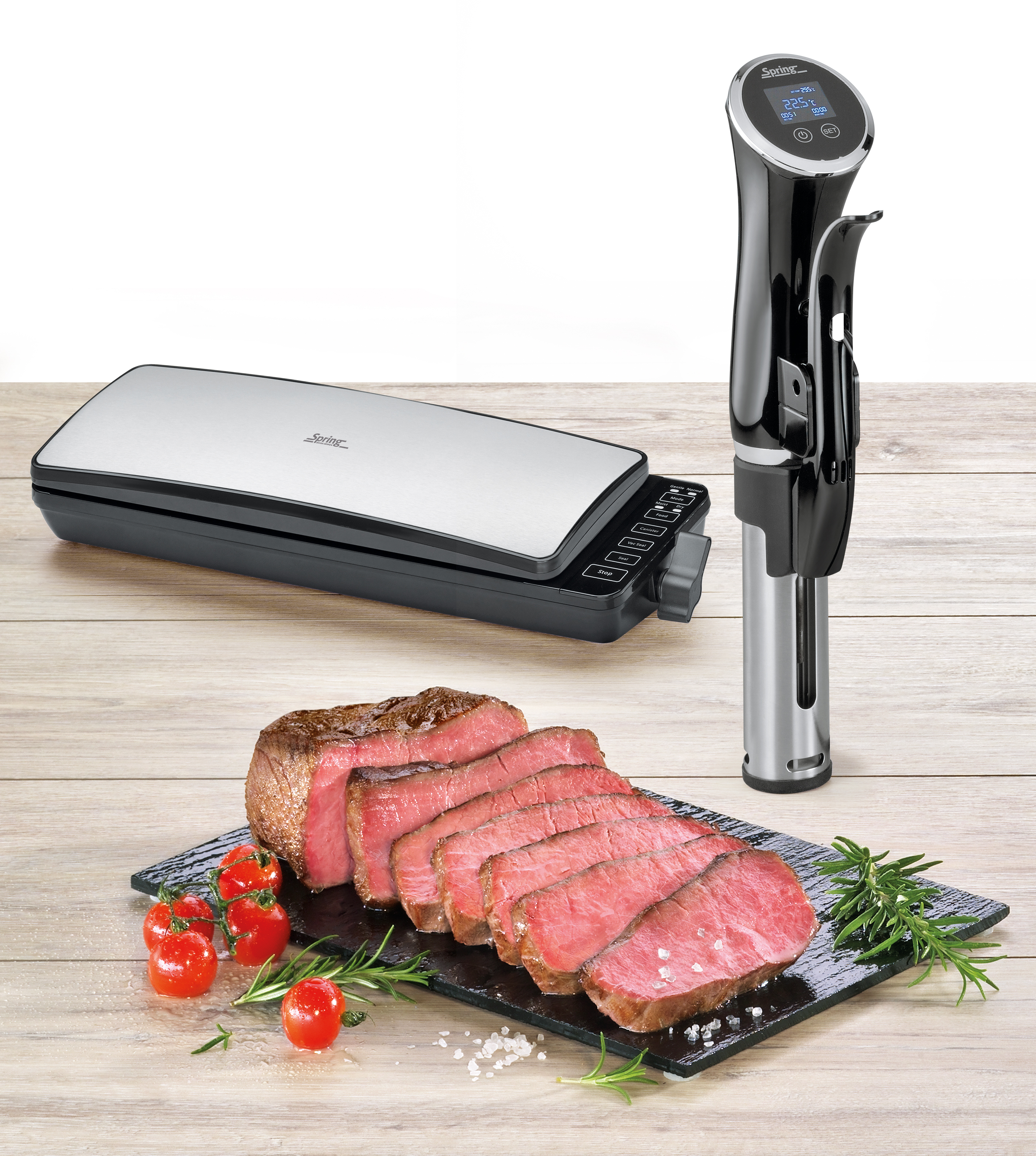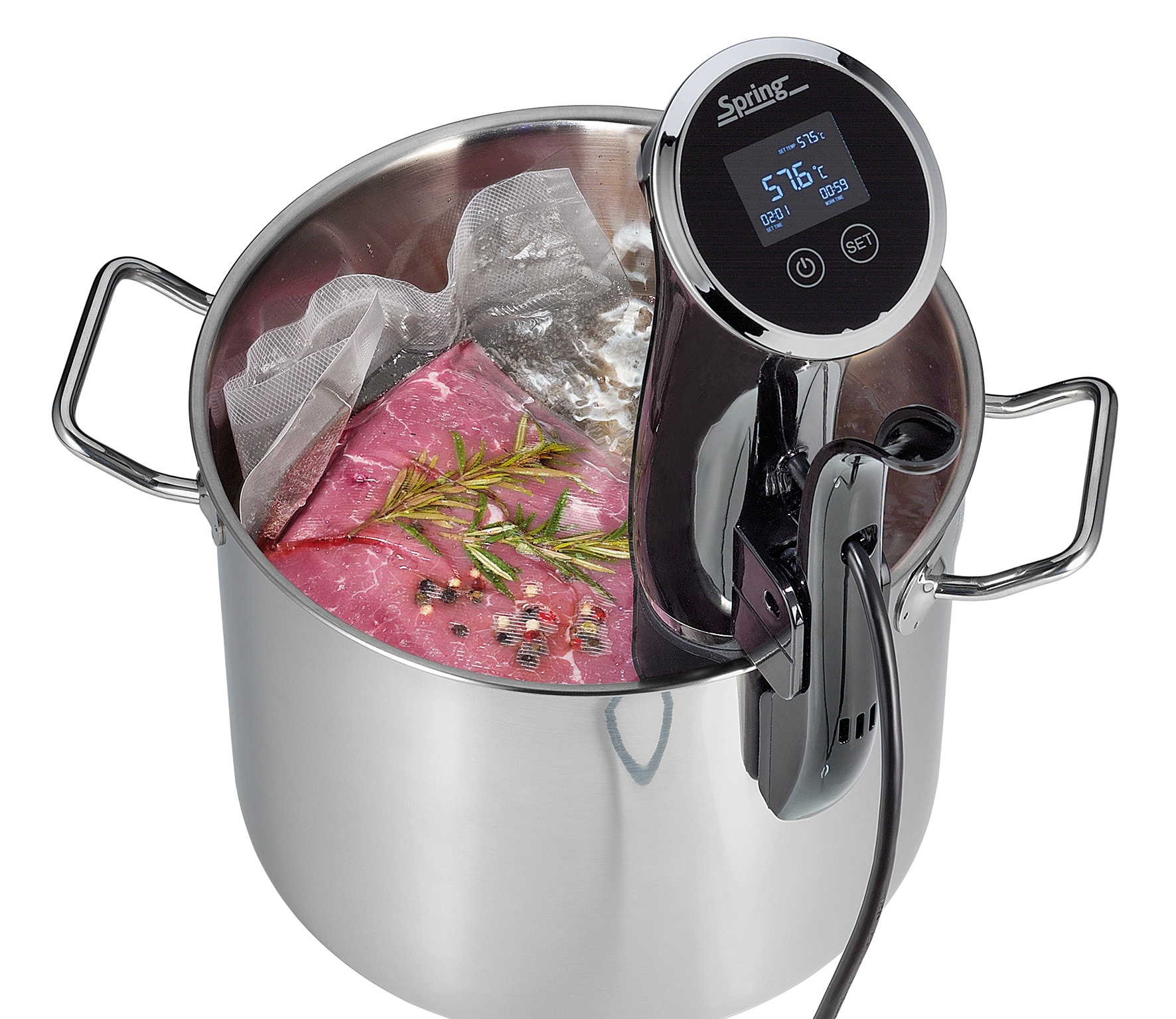 Sous Vide-Garen klingt nach Sterne-Restaurant und schmeckt auch so. Die in einem Vakuumbeutel verschweißten Lebensmittel werden bei niedriger Temperatur schonend im Wasserbad gegart. Steaks bleiben saftig-rosa, Gemüse knackig und vitaminreich, zarter Fisch zergeht auf der Zunge. Sogar der Dessert-Klassiker Crème Brûlée ist für die aus Frankreich stammende Garmethode geeignet. Der Vorteil gegenüber der konventionellen Zubereitung im Backofen liegt darin, dass die Masse aus Sahne, Zucker und Eigelb nicht überhitzen kann. Mit dem Sous Vide-Garer PROFESSIONAL von SPRING gelingen all diese Köstlichkeiten bei Ihnen zu Hause. Das Gerät ist einsetzbar in Gefäßen bis zu 20 Litern Fassungsvermögen. Die Temperatur bis 95 °C lässt sich präzise einstellen, die starke Federhaltung fixiert den Garer sicher am Topfrand. Und wenn der Timer sich meldet, ist das der Startschuss für ein neues Geschmackserlebnis.
