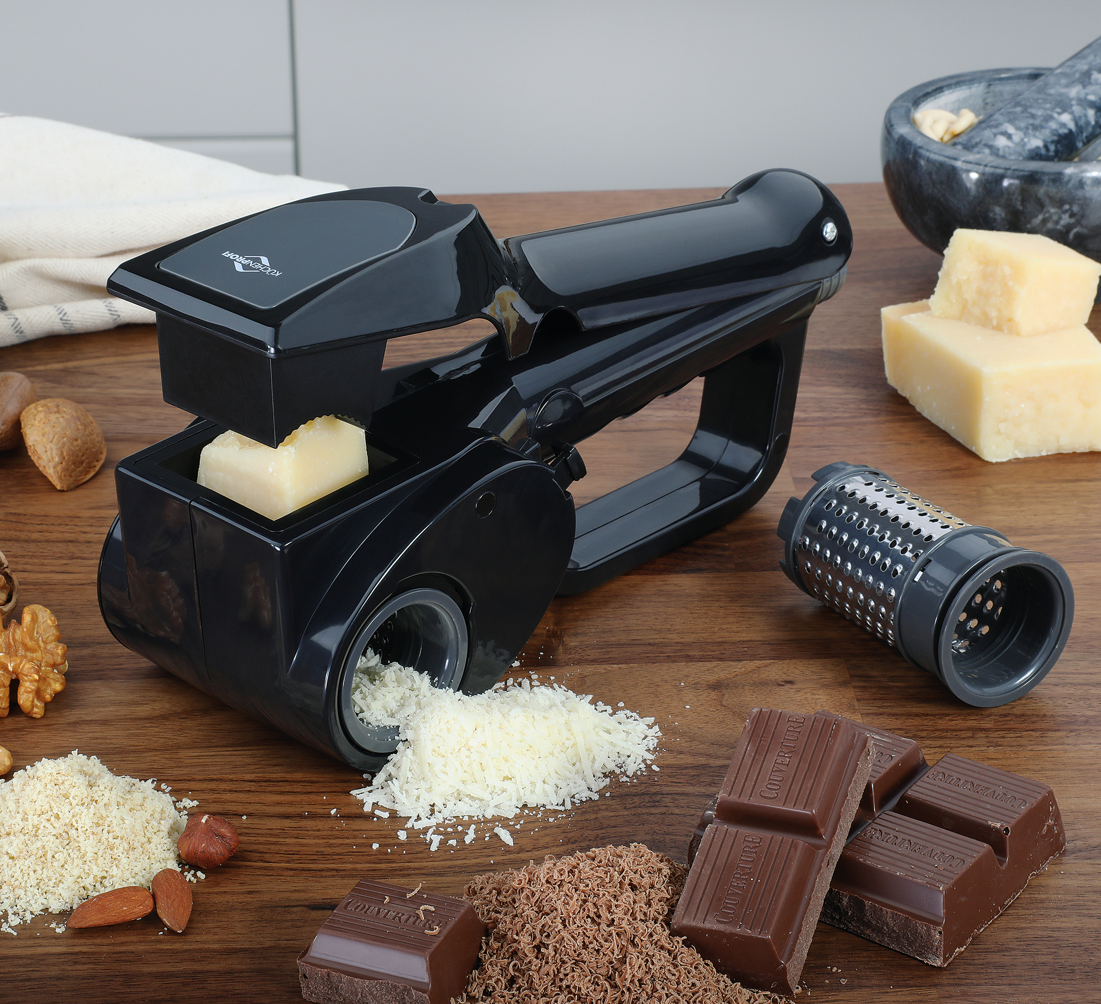 + wechselbare Reibtrommeln für grobe und feine Ergebnisse