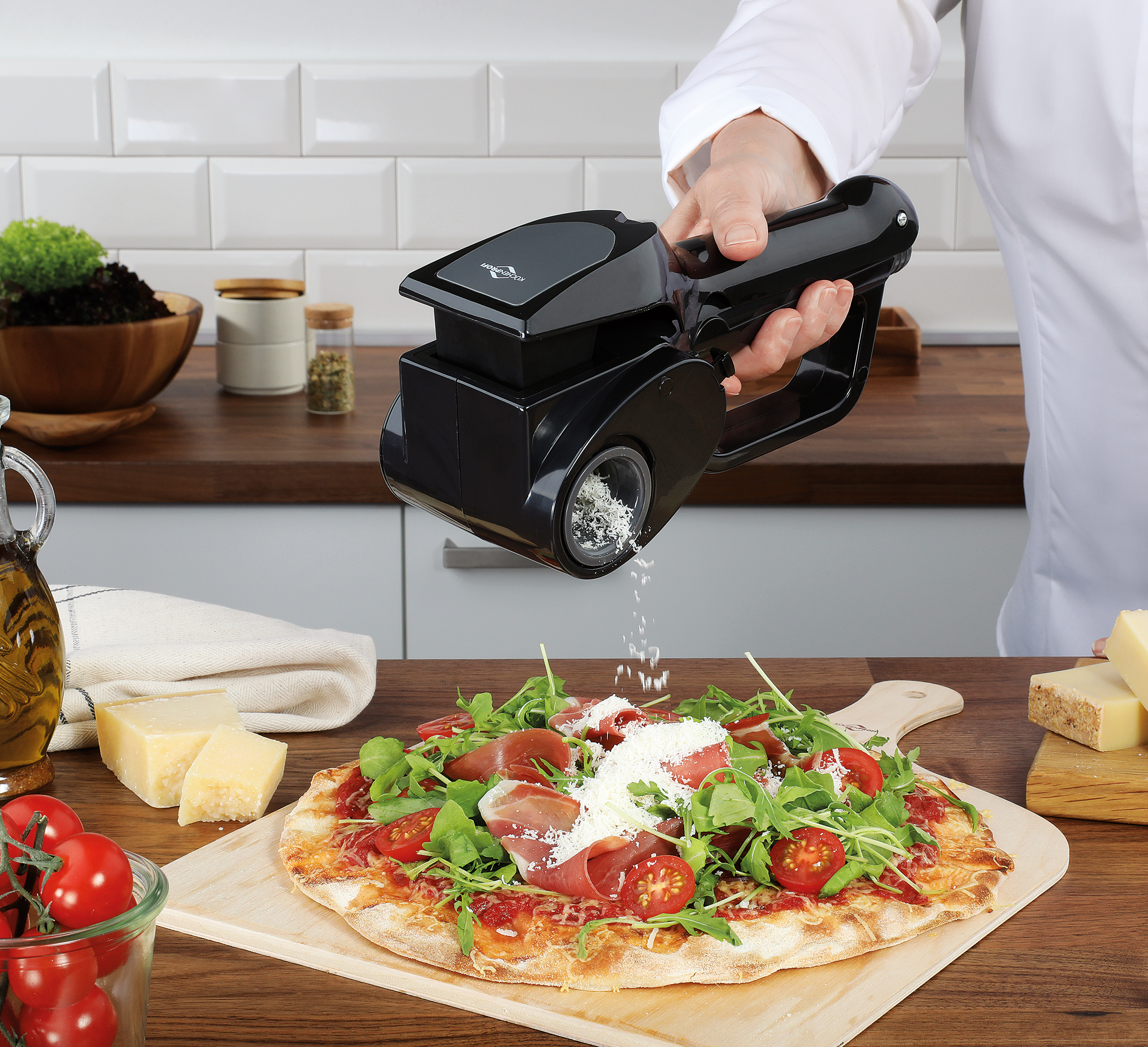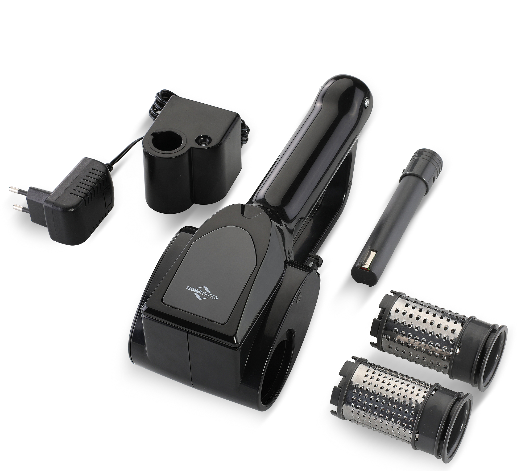 Frisch gerieben entfaltet Käse sein volles Aroma – und genau dafür ist die KÄSEREIBE EMILIA von KÜCHENPROFI gemacht. Sie verleiht Pasta, Pizza und Aufläufen die besondere Note und setzt bei Salaten oder Carpaccio den letzten Schliff. Auf Knopfdruck werden Käse oder bei Bedarf auch Nüsse, Mandeln oder Schokolade gleichmäßig gerieben. Die wechselbaren Reibtrommeln – wahlweise für grobe oder feine Ergebnisse – sorgen für die passende Textur – ganz nach Rezept und Vorliebe. Dank des kabellosen Akkubetriebs ist die Handhabung bequem und flexibel. Ausgestattet mit einem starken 3,6 V-Akku und Reibtrommeln aus rostfreiem Edelstahl, überzeugt die Käsereibe durch eine kraftvolle und zuverlässige Performance. Ideal für alle, die Wert auf Komfort legen und ihre Speisen frisch veredeln möchten. Der austauschbare NiMH-Akku wird über die mitgelieferte Ladestation mit Netzteil geladen.