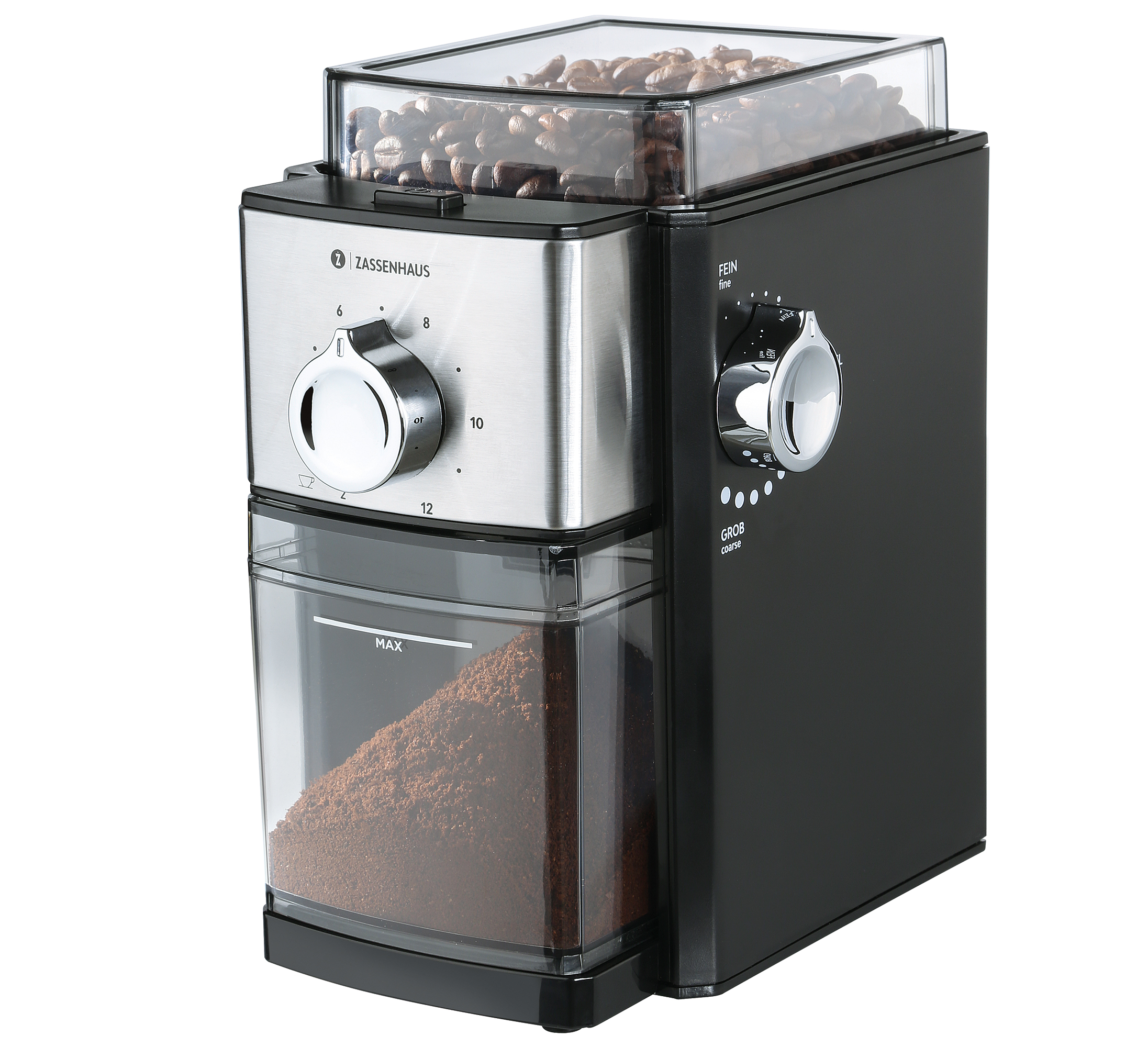 Die Zubereitung von Kaffee ist ein sinnliches Erlebnis. Es beginnt mit den Kaffeebohnen, die frisch gemahlen den besten Genuss bieten. ZASSENHAUS hat die elektrische Kaffeemühle KINGSTON STEEL mit einem Scheibenmahlwerk aus gehärtetem Stahl ausgestattet. Es mahlt die Kaffeebohnen besonders schonend, sämtliche Aroma- und Vitalstoffe bleiben erhalten. Wir als führender Hersteller von Kaffeemühlen seit 1867 wissen, dass die Kaffee-Geschmäcker unterschiedlich sind. Daher können Sie bei der Mahlgradeinstellung zwischen 17 Stufen wählen. Die Kaffeemühle mit Abschaltautomatik mahlt Pulver für 2-12 Tassen. Der Bohnenbehälter hat einen Aroma-Schutzdeckel, die obere Mahlwerksscheibe ist zur leichten Reinigung herausnehmbar.