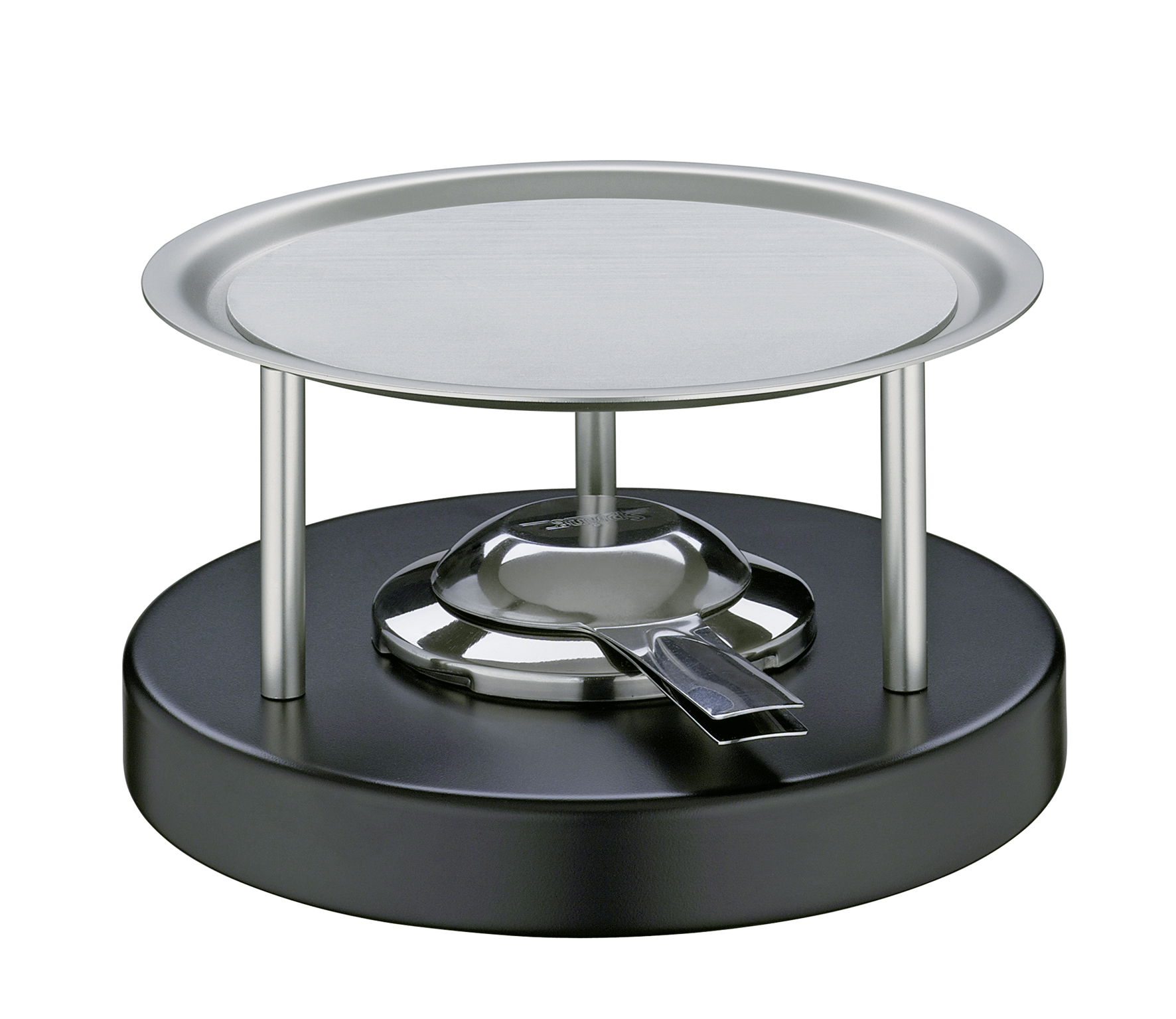 Edelstahl, Rechaudunterteil aus Metall schwarz lackiert, inklusive Pastenbrenner und Aluminium Rondell