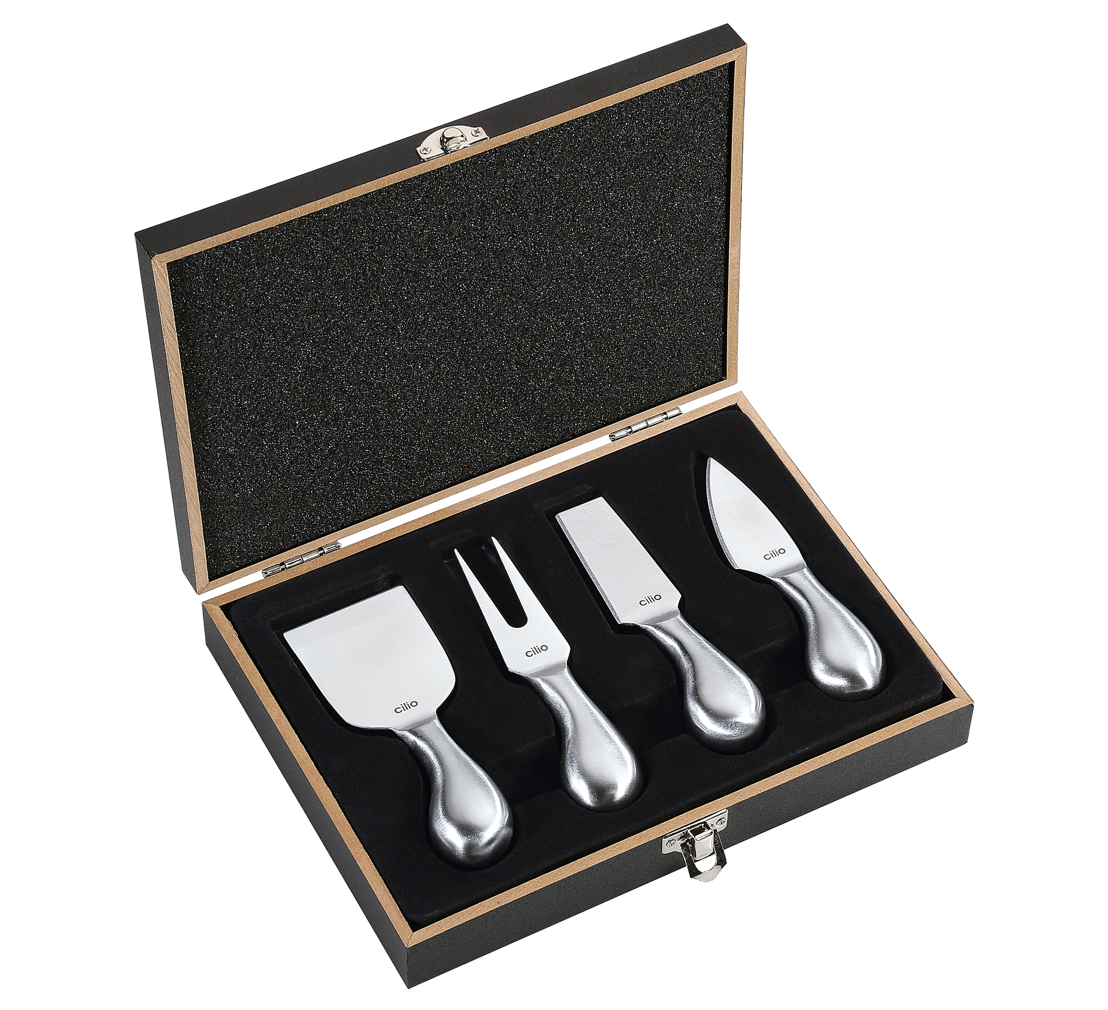 Material: Edelstahl matt, mit Weichkäsemesser, Käsegabel, Hartkäsemesser und Hartkäsebrecher (Länge jeweils 12,5 cm) in Holz-Geschenkdose (23,5 x 17 x 3,5 cm)