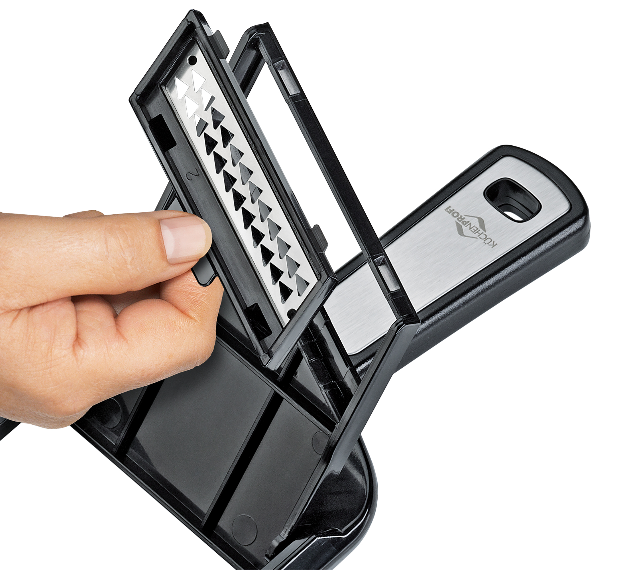 verstellbar. Die scharfen Klingen aus rostfreiem Edelstahl schneiden sauber,