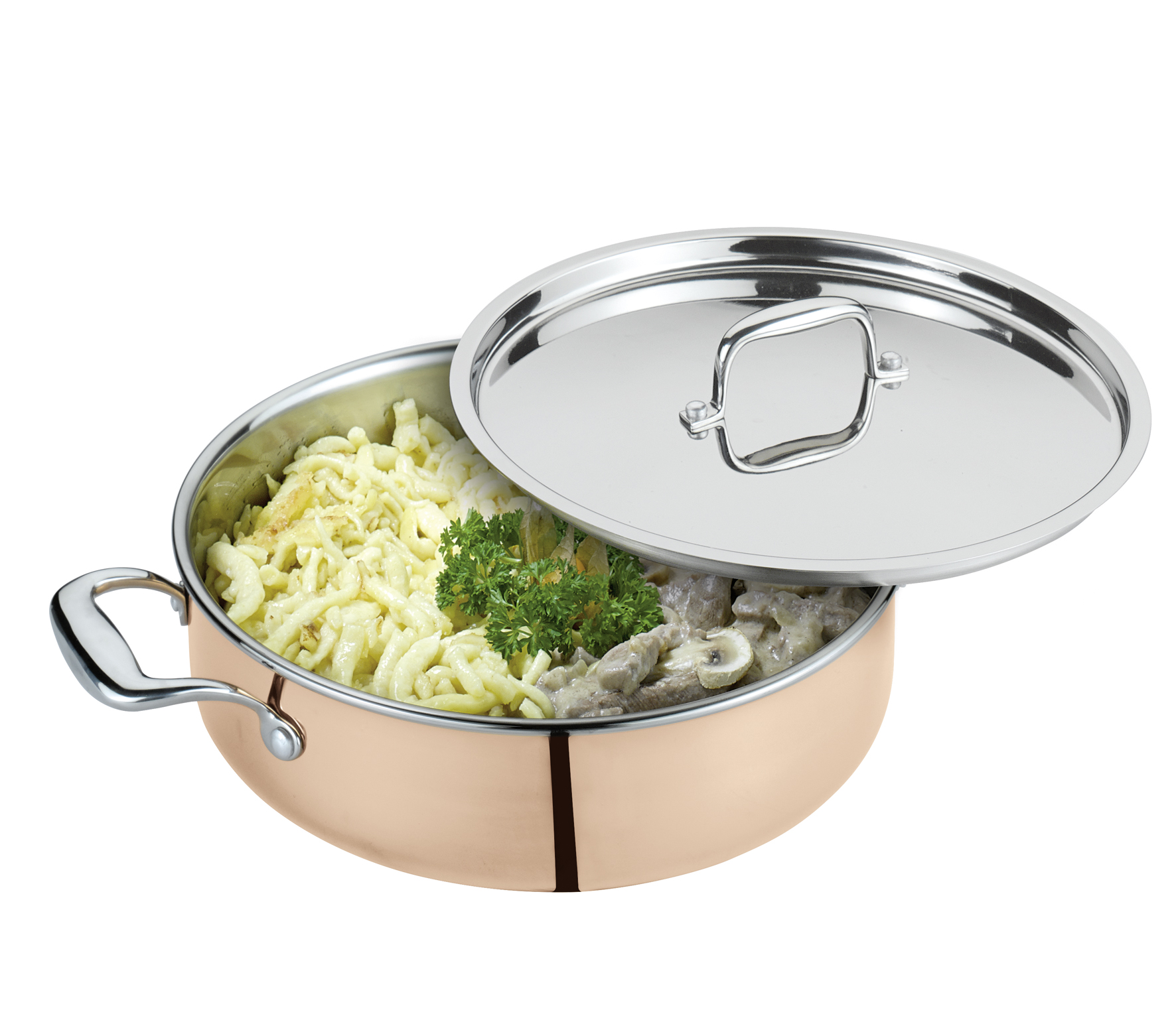 Eine glänzende Idee: Mit der Kupfergeschirr-Serie CULINOX überzeugt Spring mit einem Klassiker aus seinem Sortiment. Aus gutem Grund: Kupfer ist einer der besten Wärmeleiter und wird besonders gleichmäßig heiß. Profi-Köche schwören auf das traditionelle Material, wenn sie Risotto oder Polenta zubereiten, Saucen reduzieren oder ein Ragout schmoren. Spring kombiniert die hervorragenden Eigenschaften von Kupfer mit seinem bewährten 5-Lagen-Mehrschichtmaterial, das sekundenschnell auf Temperaturveränderungen reagiert. Für noch schnelleres, punktgenaues Braten und Kochen. Und außen ist die 0,5 mm starke Kupfer-Lage ein optischer Gewinn. Hochglanzpolierte Edelstahl-Griffbeschläge und Deckel sowie genietete Griffe runden das Bild ab und sprechen für die hohe Qualität der Kochgeschirr-Serie. Damit Sie lange Freude daran haben, empfehlen wir die regelmäßige Reinigung mit dem Spring Copper Cleaner. Die Patina, die sich im Laufe der Zeit bildet, verschwindet und Ihre Töpfe und Pfannen erstrahlen im neuen Glanz.