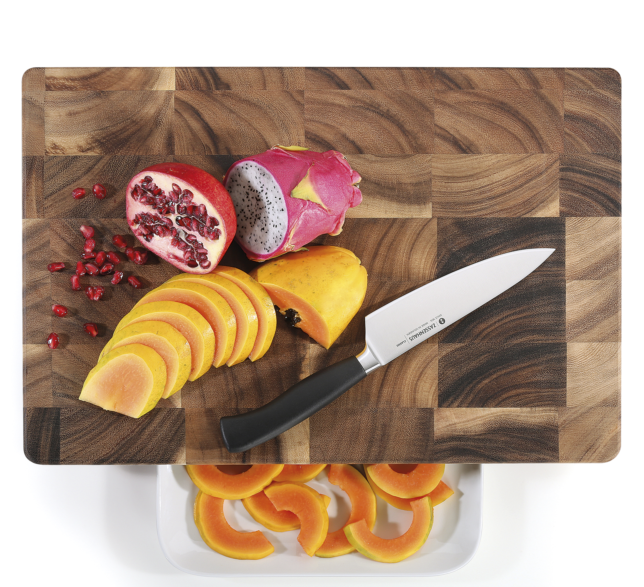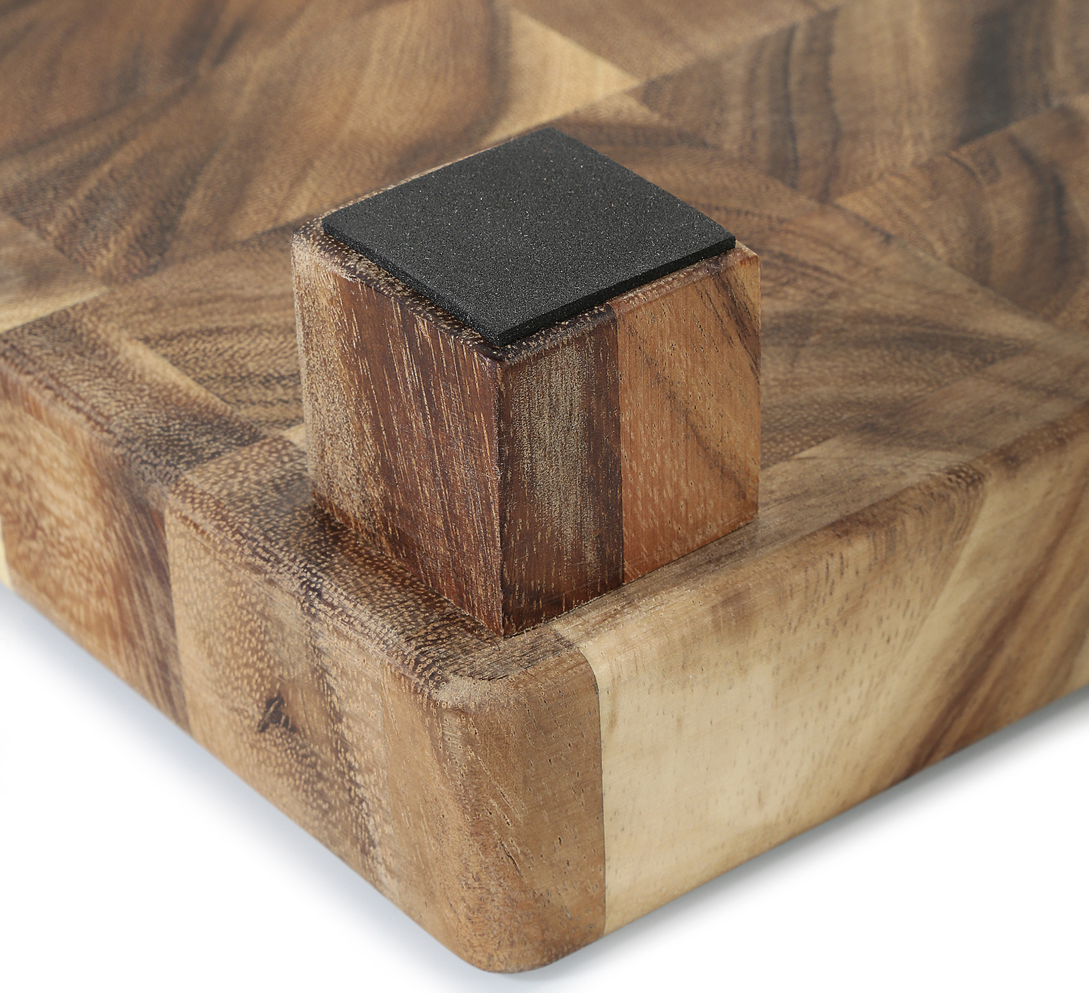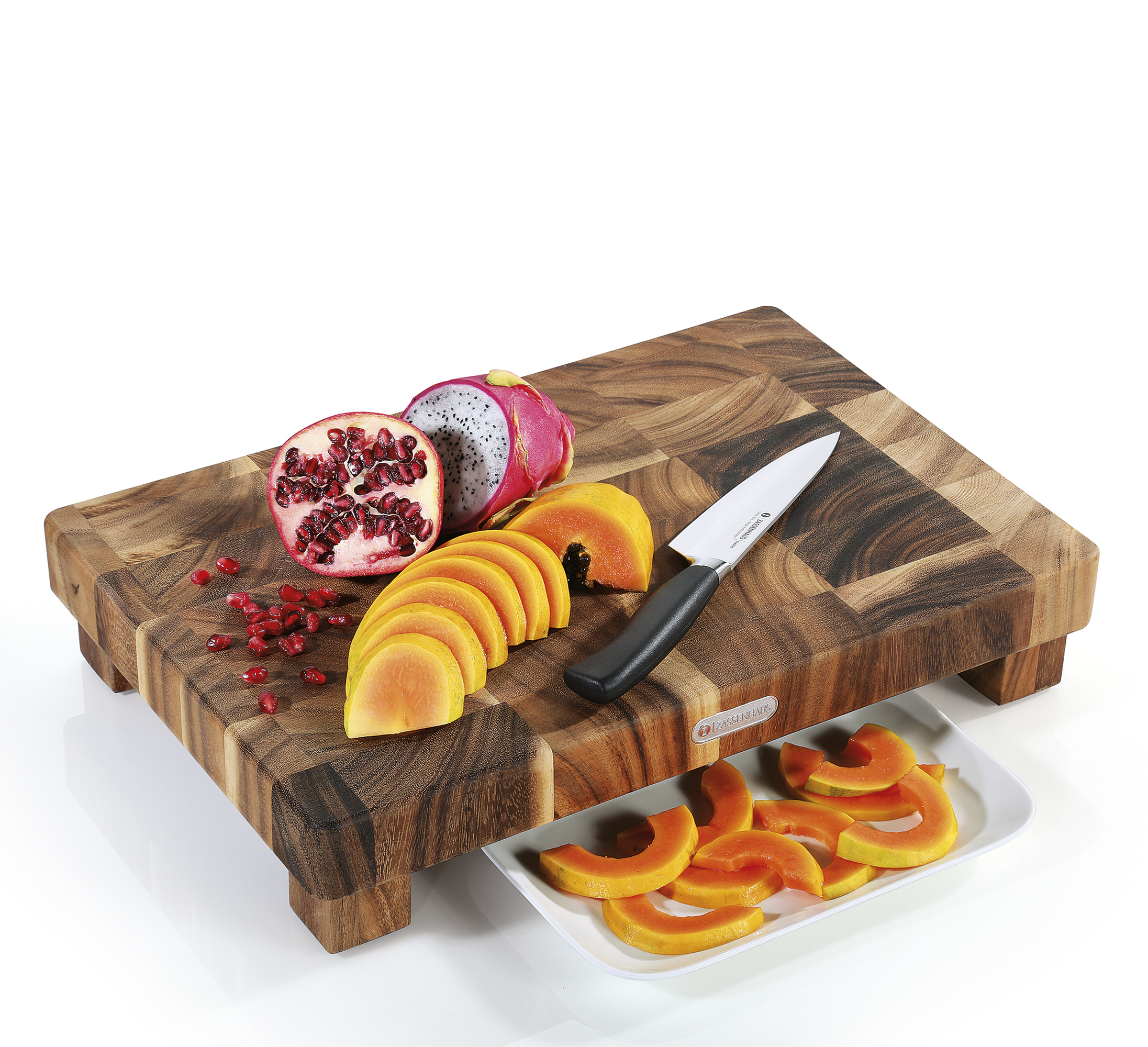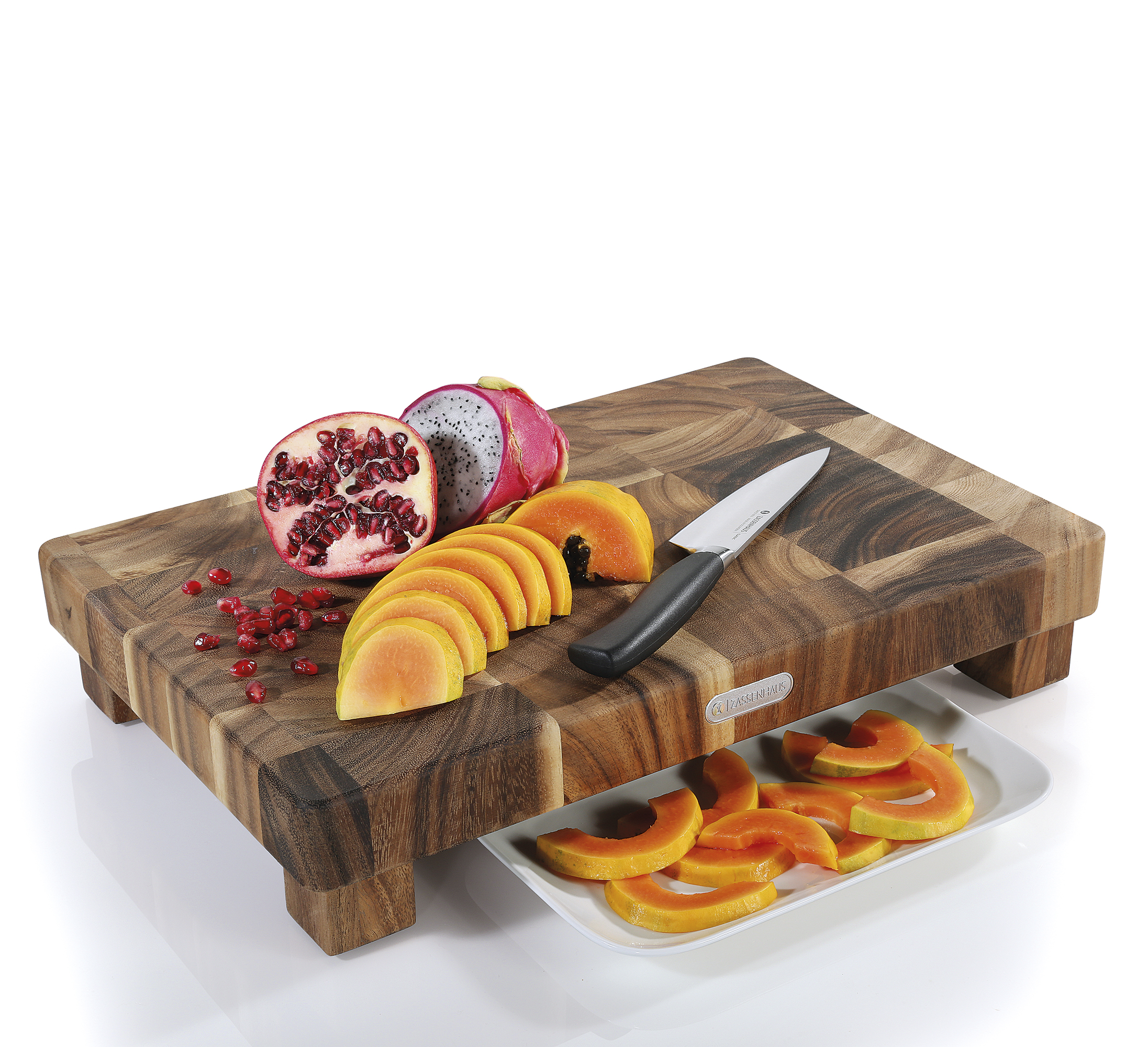 Stattlicher Naturbursche. Der Hackblock von ZASSENHAUS ist ein Statement. Seine Botschaft: Hier steht einer in der Küche, der anpackt. Das robuste Akazienholz mit der schönen Maserung ist als Stirnholz quer zur Faser geschnitten. Durch diese aufwendige Verarbeitung ist der Hackblock besonders stabil, wie Sie beim Schnitzel-Klopfen merken werden. Zudem ist Stirnholz schnittfest und messerschonend. Der Hackblock steht sicher auf rutschfesten Füßen, die so hoch sind, dass Teller und flache Schalen bequem unter das Brett geschoben werden und Schnittgut sowie Abfall direkt auffangen können.