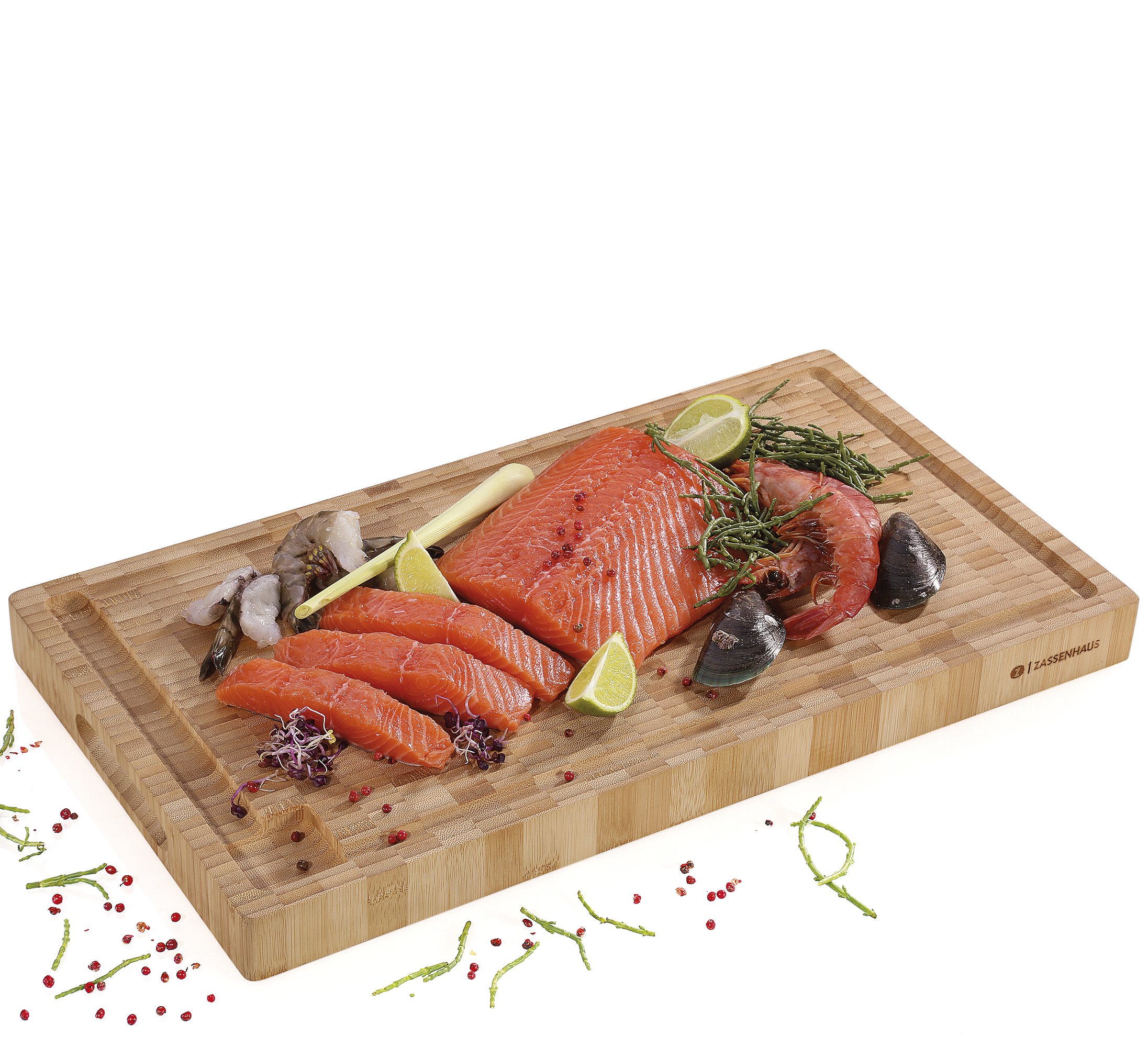 Für jeden Tag und lange Zeit. Bei diesem Hackblock setzt ZASSENHAUS auf Bambus. Dafür sprechen gute Gründe. Das Naturmaterial aus nachhaltigem Anbau ist ein schnell nachwachsender Rohstoff. Bambus ist zudem besonders robust und somit prädestiniert für den täglichen Einsatz. Der Hackblock ist beidseitig nutzbar und mit einer praktischen Saftrille ausgestattet. Sie können auf dem schnittfesten Allrounder übrigens auch Fleisch oder den gebeizten Lachs aufschneiden, ohne dass das Messer Spuren hinterlässt. Auf dem Buffet serviert der Hackblock mit der schönen Struktur die Schinken- oder Käseplatte.