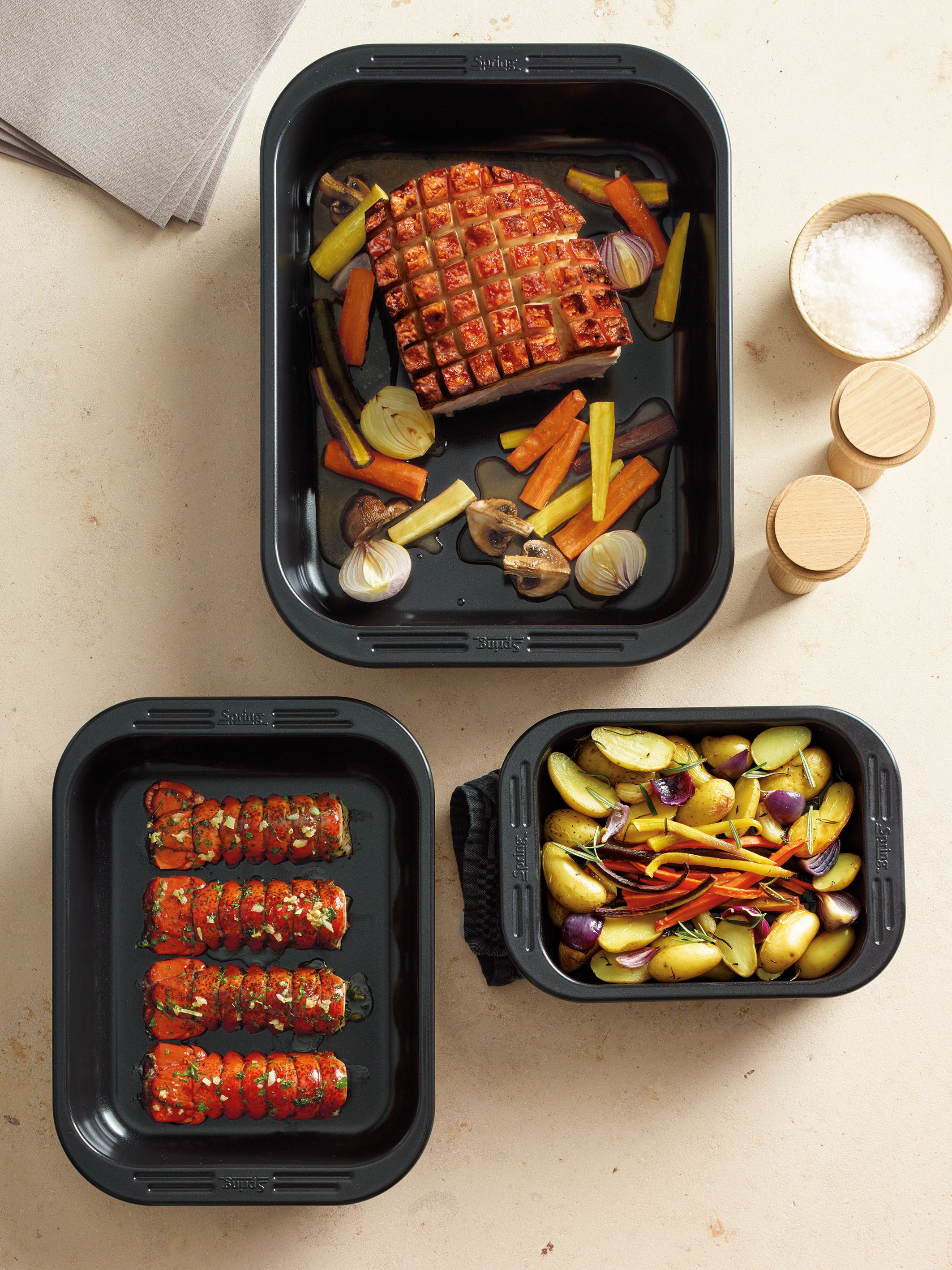 Ob aromatisches Schmoren, sanftes Garen oder überbackene Aufläufe – mit dem Bräter CULINAR von SPRING gelingen alle Backofengerichte mühelos. Die extradicken Wände aus aluminisiertem Stahl speichern die Hitze zuverlässig und geben sie gleichmäßig weiter. So gelingen Fleisch, Gemüse und Gratins in schonender Zubereitung und mit genussvollem Ergebnis. Die breiten, im Rand integrierten Griffe liegen gut in der Hand und ermöglichen ein sicheres Tragen und Servieren vom Ofen direkt an den Tisch.