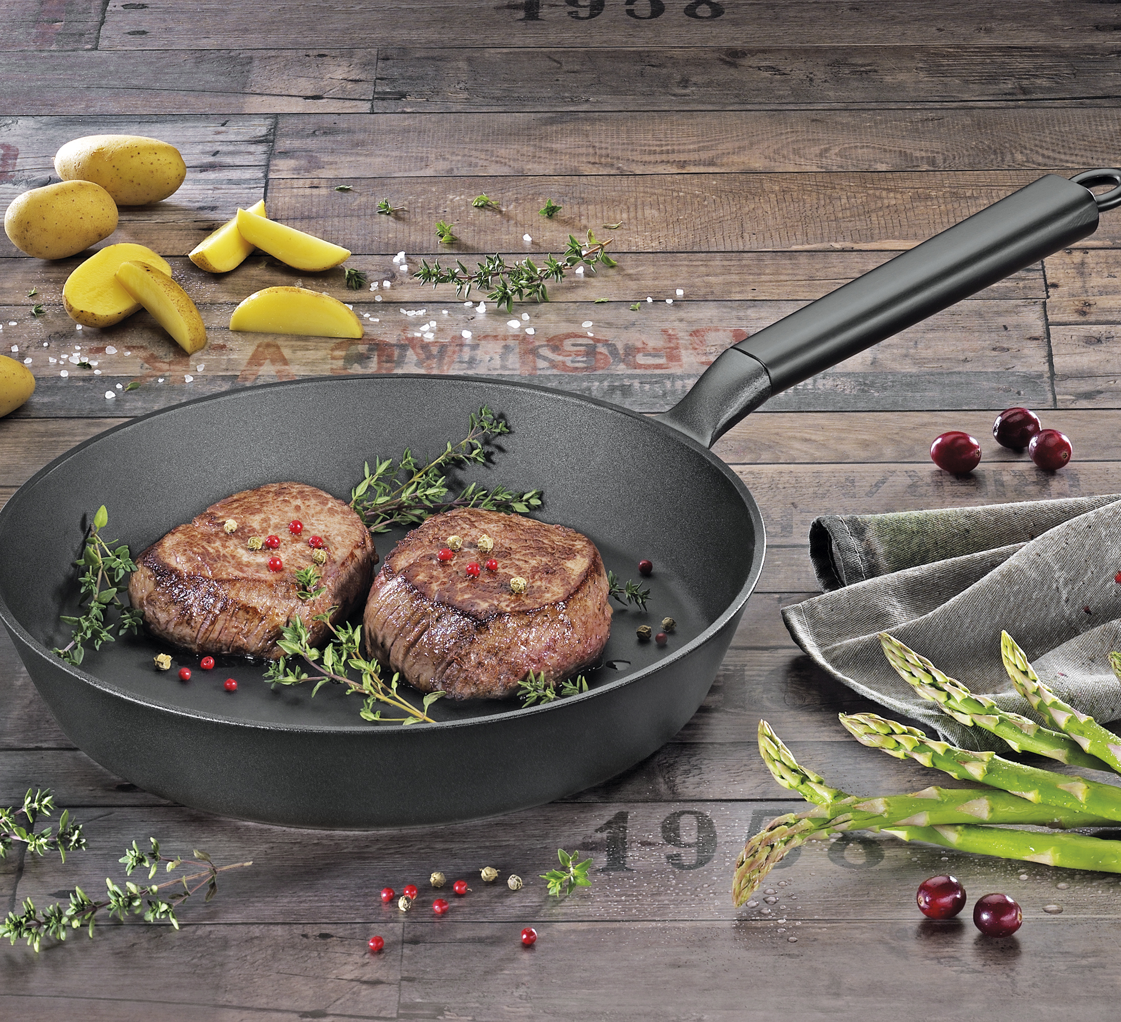 Guss und Genuss sind nicht etwa nur zwei gleich klingende Wörter, bei SPRING sind sie eng miteinander verbunden. Die robusten Bratpfannen ESCALE sind innen wie außen emailliert und haben einen glänzenden, induktionsfähigen Boden. Im Laufe der Benutzung bildet sich eine natürliche Antihaft-Wirkung im Innern, die bei einfacher Pflege dauerhaft erhalten bleibt. Köstlich gebräunte Steaks sind im Nu zubereitet, denn das Gusseisen kommt schnell auf Temperatur und kann diese sogar eine Zeit lang speichern. Der ergonomische Stiel aus Holz bietet ein sicheres Handling, die praktische Aufhängöse macht die Pfanne zum Hingucker an der Küchenwand.