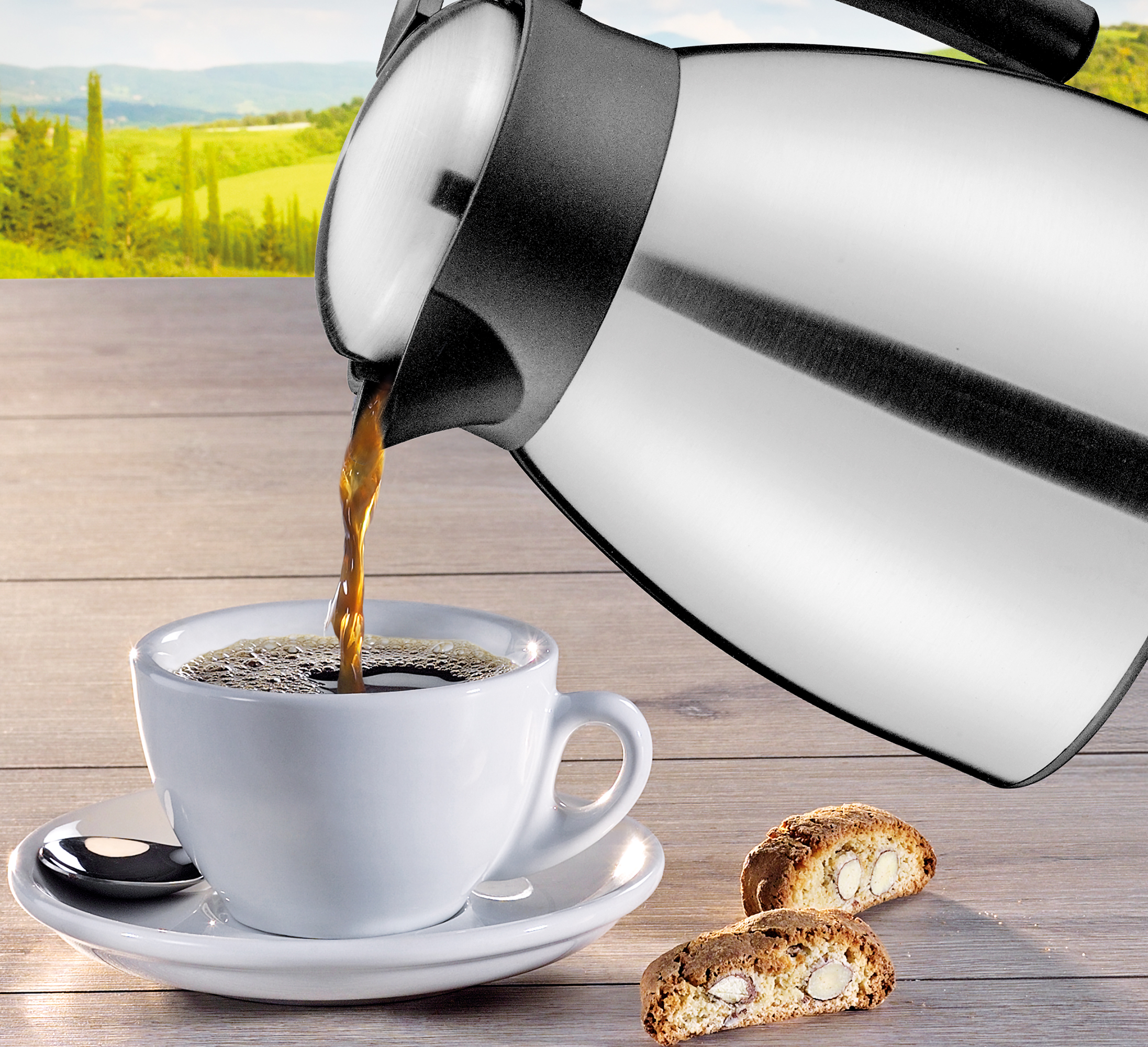 Palmen säumen die Küste der Provinz Savona in Ligurien. Wenn Sie Ihren Schattenplatz auf dem Balkon oder der Terrasse gefunden haben, kühlt die Isolierkanne SAVONA von cilio den Eistee. Während Sie Dolce Vita zu Hause genießen, füllen Sie mit der praktischen Einhand-Ausgießtaste nach. Auf dem Frühstückstisch oder beim Schwelgen in Urlaubserinnerungen mit der Freundin hält die Edelstahlkanne mit Vakuum- Hartglaseinsatz den Kaffee heiß. Und das sogar bis zu 12 Stunden. Das reicht locker, um einige Canestrelli zu naschen. Im Teig der ligurischen Mürbeteigkekse mit der typischen Blumenform steckt hart gekochtes Eigelb. Das macht die Biscotti so herrlich zart.