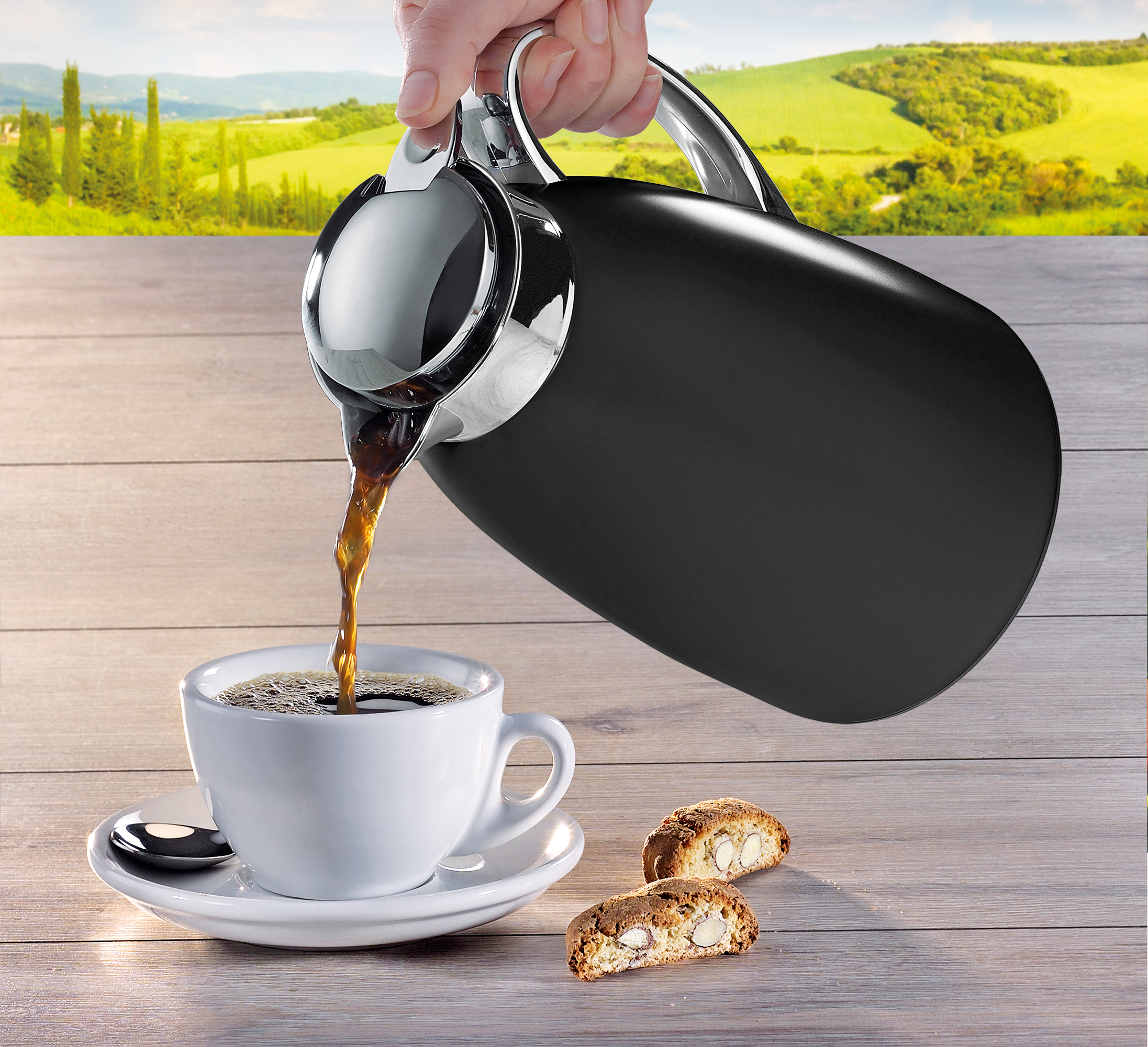 Die richtige Temperatur ist entscheidend. Ist der Kaffee zu sehr abgekühlt, sinkt auch der Genuss. Und bei lauwarmen Kaltgetränken bleibt die Erfrischung auf der Strecke. Dank der Isolierkanne VENEZIA von cilio genießen Sie Ihr Lieblingsgetränk wohltemperiert. Sie hält Kaffee oder Tee bis zu 12 Stunden heiß, Schorle und die selbst gemachte Limonade für das Picknick bleiben sogar 24 Stunden kühl. Der Vakuum-Hartglaseinsatz ist robust, die Einhand-Ausgießtaste kommt allen entgegen, für die Multi-Tasking kein Fremdwort ist. Ganz flexibel sind Sie übrigens auch, falls es in Ihrem Haushalt neben Kaffeefans auch passionierte Tee-Trinker gibt.