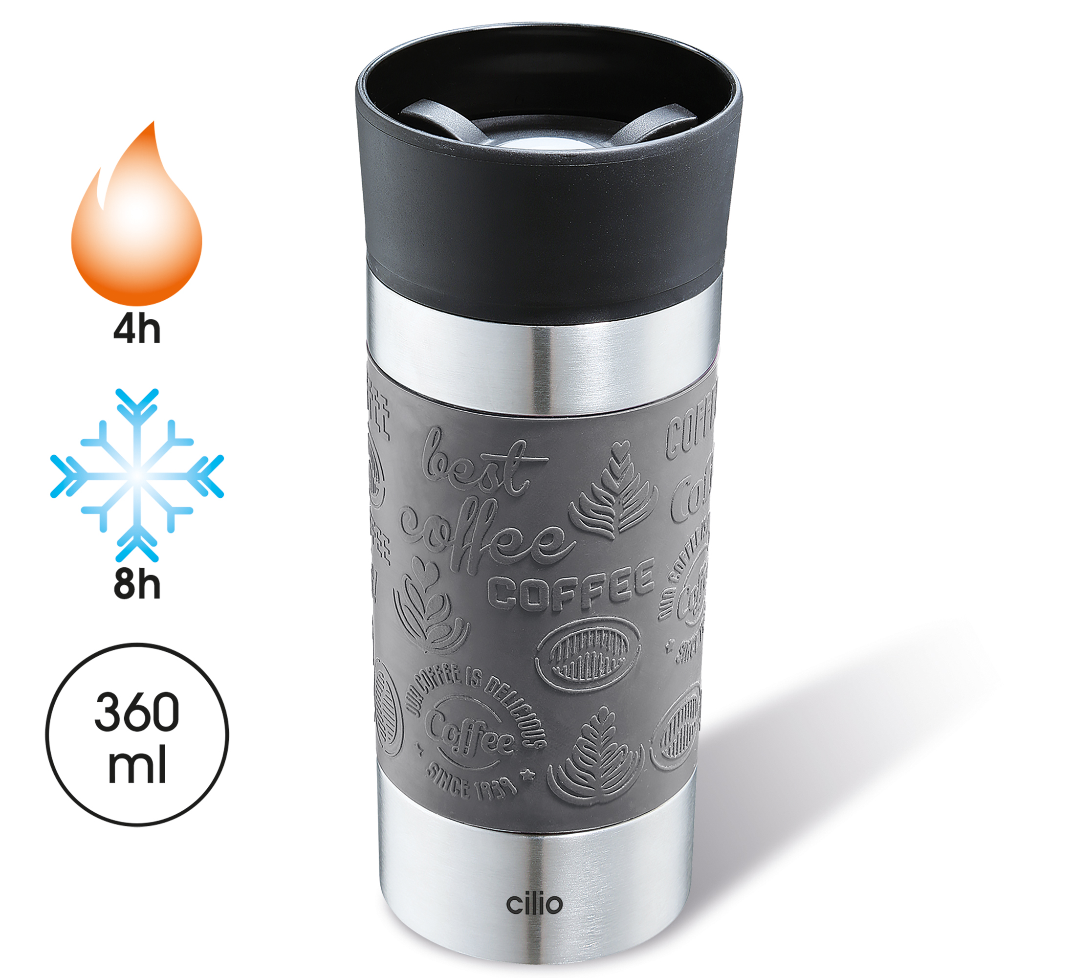 Wohin geht die Reise? Der Isolierbecher VIAGGIO von cilio tankt Kaffee oder Tee, dann geht es los. Mit Ihrem Reisebuddy aus Edelstahl und hochwertigem Kunststoff sind Sie in jedem Fall mit gutem Gewissen unterwegs, da Sie auf Plastikflaschen und Einwegbecher getrost verzichten können. Er ist leicht zu reinigen und begleitet Sie auf vielen Touren. Das Doppelwandsystem hält Ihr Getränk wahlweise vier Stunden heiß oder acht Stunden kühl. Der praktische Becher mit dem schönen Design hat einen 360° Trinkverschluss, ist auslauf- und bruchsicher.