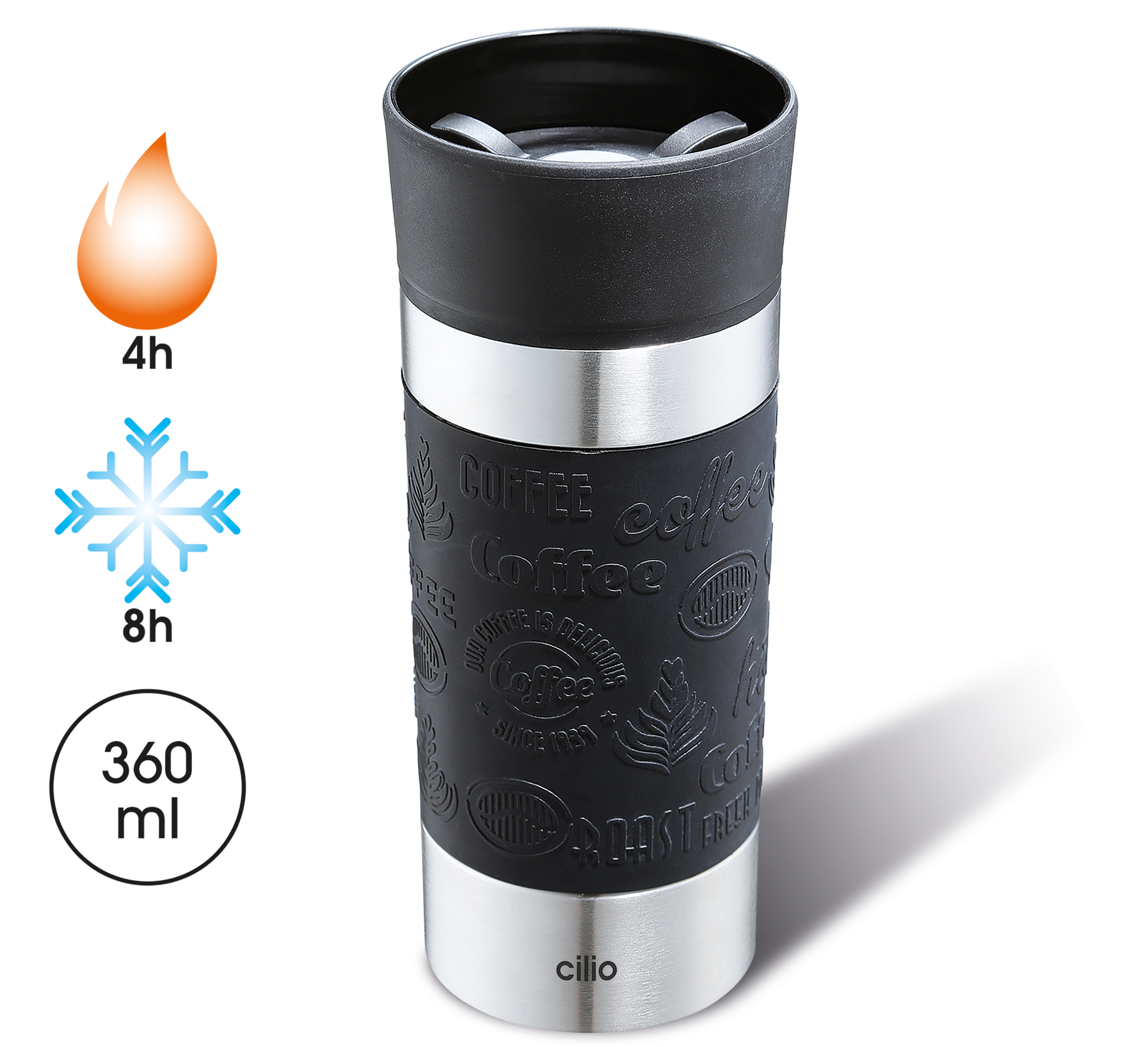 Wohin geht die Reise? Der Isolierbecher VIAGGIO von cilio tankt Kaffee oder Tee, dann geht es los. Mit Ihrem Reisebuddy aus Edelstahl und hochwertigem Kunststoff sind Sie in jedem Fall mit gutem Gewissen unterwegs, da Sie auf Plastikflaschen und Einwegbecher getrost verzichten können. Er ist leicht zu reinigen und begleitet Sie auf vielen Touren. Das Doppelwandsystem hält Ihr Getränk wahlweise vier Stunden heiß oder acht Stunden kühl. Der praktische Becher mit dem schönen Design hat einen 360° Trinkverschluss, ist auslauf- und bruchsicher.