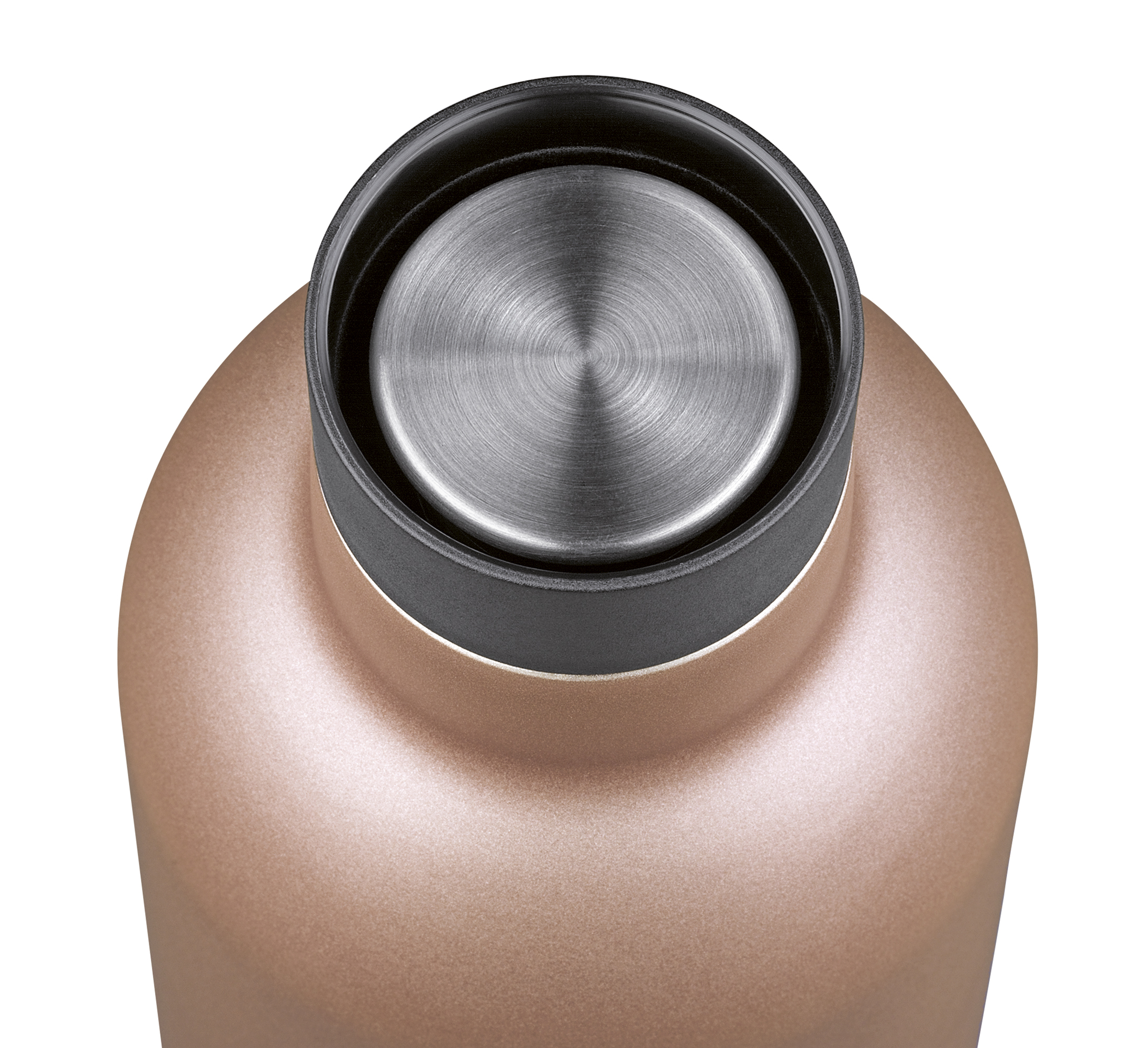 Material: Edelstahl rostfrei satiniert oder lackiert, Doppelwandsystem mit Kupferbeschichtung, bruch- und auslaufsicher, 360° Trinkverschluss, geeignet für kohlensäurehaltige Getränke, Verschluss zum Reinigen zerlegbar