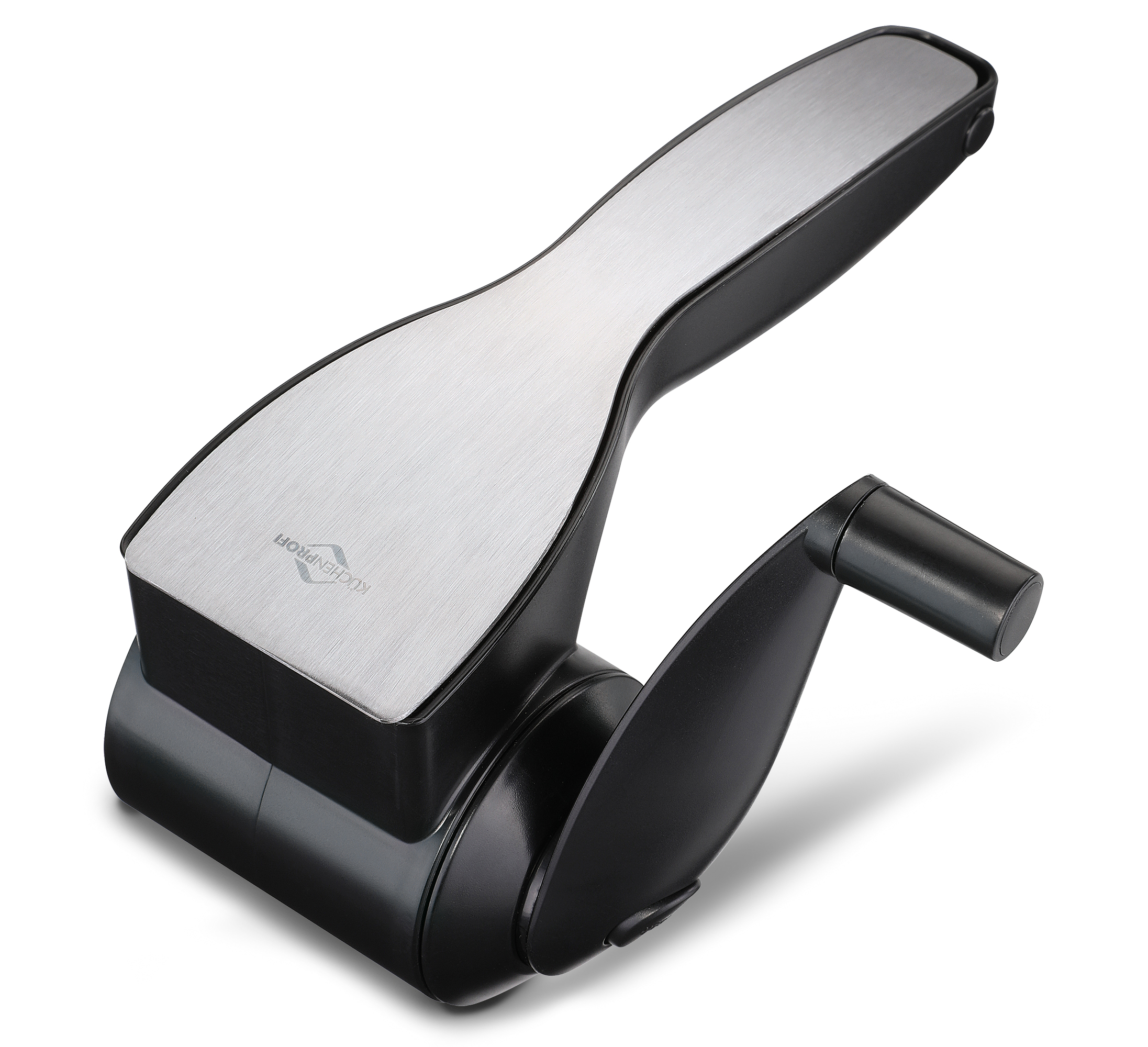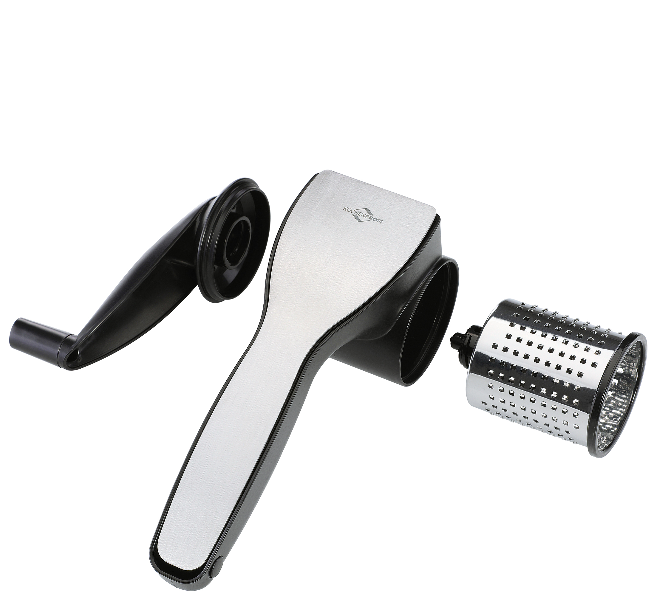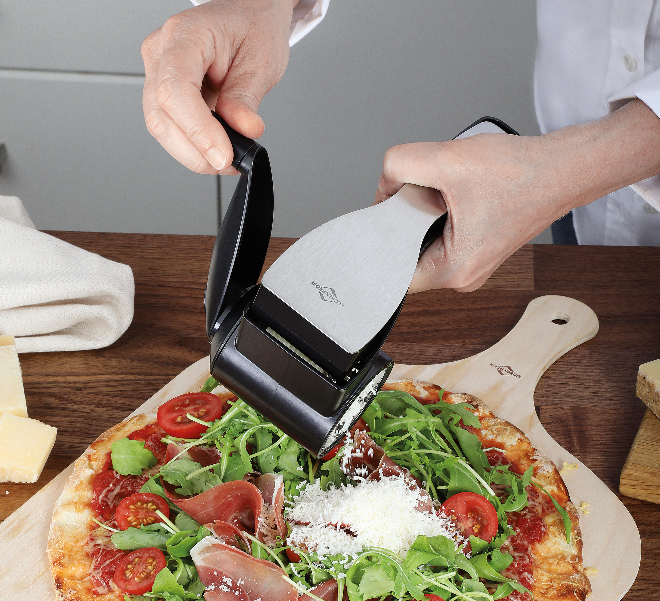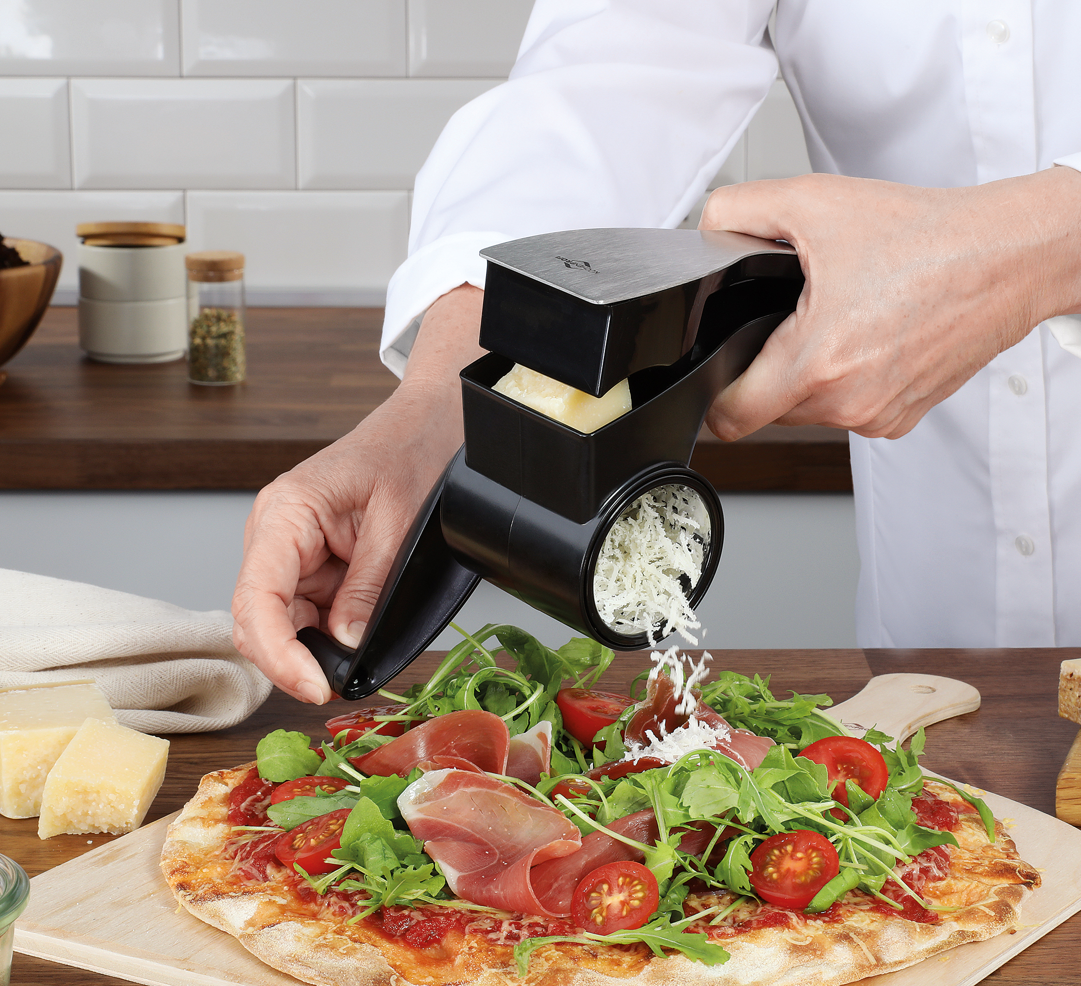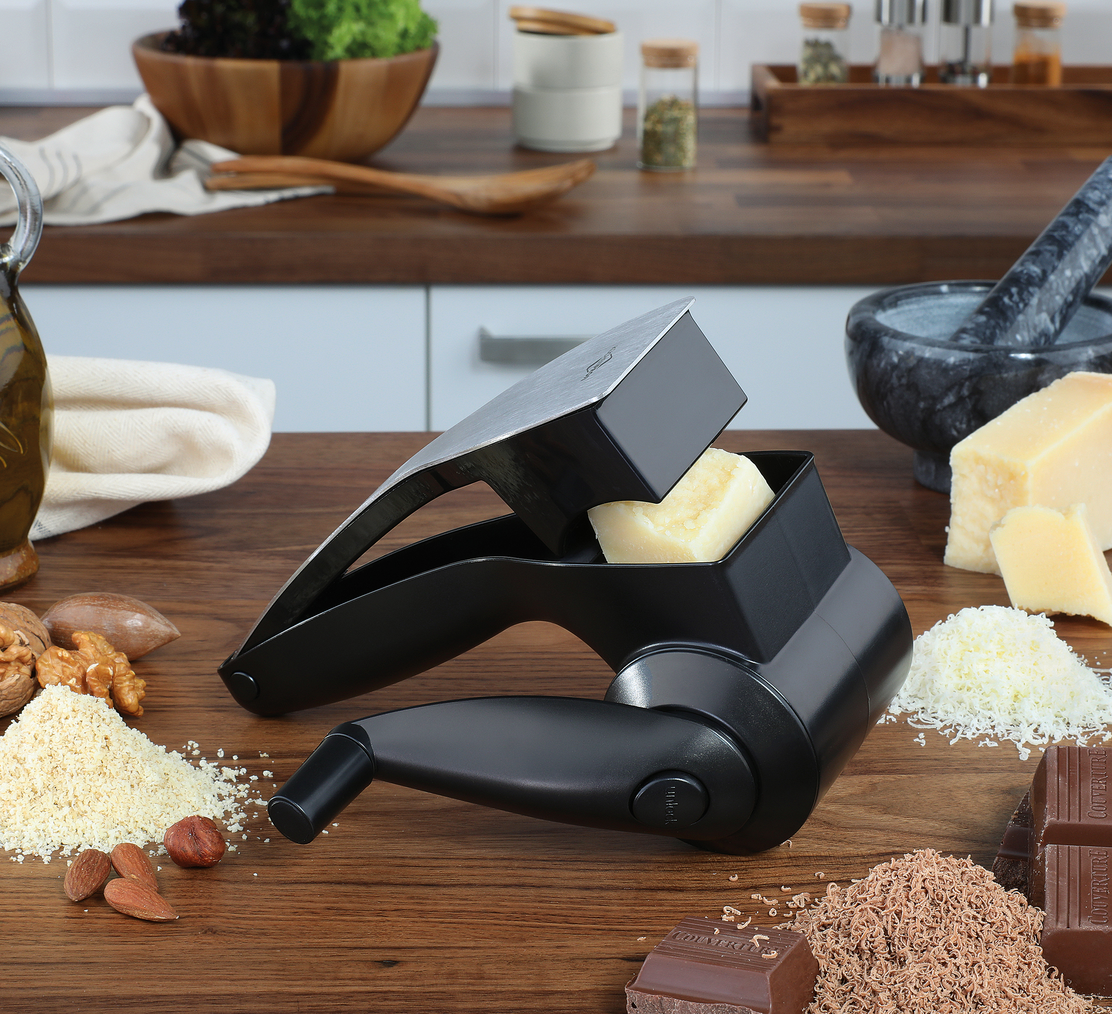 Gouda, Parmesan & Co. schmecken köstlich. Gerieben verfeinern sie Salate und Pasta, beim Überbacken bilden sie die begehrte goldbraune Kruste auf Pizza und Gratin. Mit der Käsereibe DELIA von KÜCHENPROFI haben Sie im Nu frisch geriebenen Hartkäse zur Hand. Füllen Sie einfach das Käsestück in das Reibefach und schließen Sie den Niederhalter. Durch Drehen der leichtgängigen Kurbel wird der Käse fein gerieben. Die rasiermesserscharfe Reibtrommel aus rostfreiem Edelstahl arbeitet präzise und gleichmäßig, sodass Hartkäse aber auch Nüsse oder Schokolade mühelos gerieben werden − ideal zum Verfeinern von Desserts und für feine Toppings. Dank der wechselbaren Kurbel liegt die Käsereibe sowohl Rechts- als auch Linkshändern angenehm in der Hand und lässt sich kontrolliert bedienen. Zum Reinigen einfach die Reibe in die Spülmaschine geben.