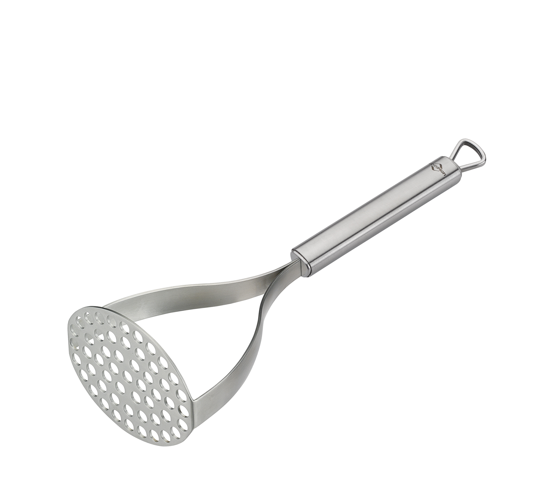 Trifft den Geschmack anspruchsvoller Köche. Die Serie PARMA von KÜCHENPROFI verbindet Funktion und Design perfekt. Die Basics für den täglichen Einsatz an Herd und Backofen sind aus robustem Edelstahl gefertigt und geeignet für die Spülmaschine. Ihre langen Griffe liegen gut in der Hand, das Design macht sie zum Hingucker an der Küchenleiste. Dort haben Sie von der Vorspeise bis zum Dessert für jede Gelegenheit den passenden Helfer am Start. Ein Klassiker mit großer Reichweite ist der Kartoffelstampfer. Neben der beliebten Knolle zerkleinert er Möhren, Zucchini und Brokkoli für den angesagten Gemüsestampf sowie die Bananen für den Babybrei. Die großzügige Lochung reduziert den Kraftaufwand.