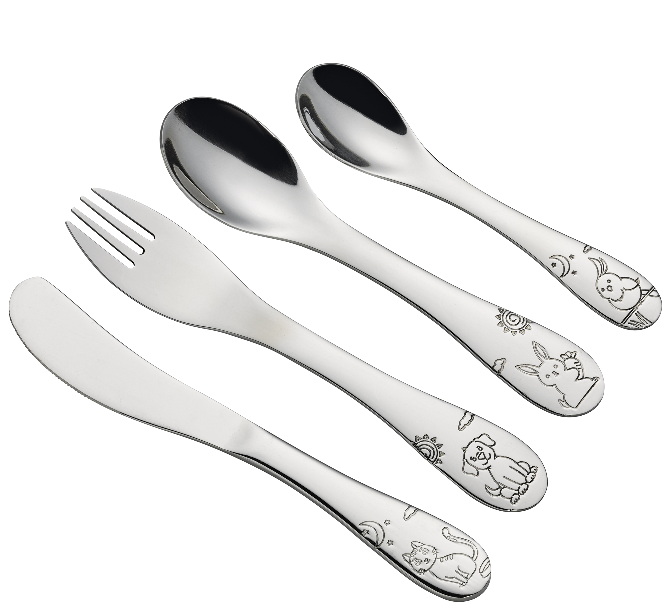 Messer, Gabel und den Löffeln des 4-teiligen Sets ermuntern den Nachwuchs, das