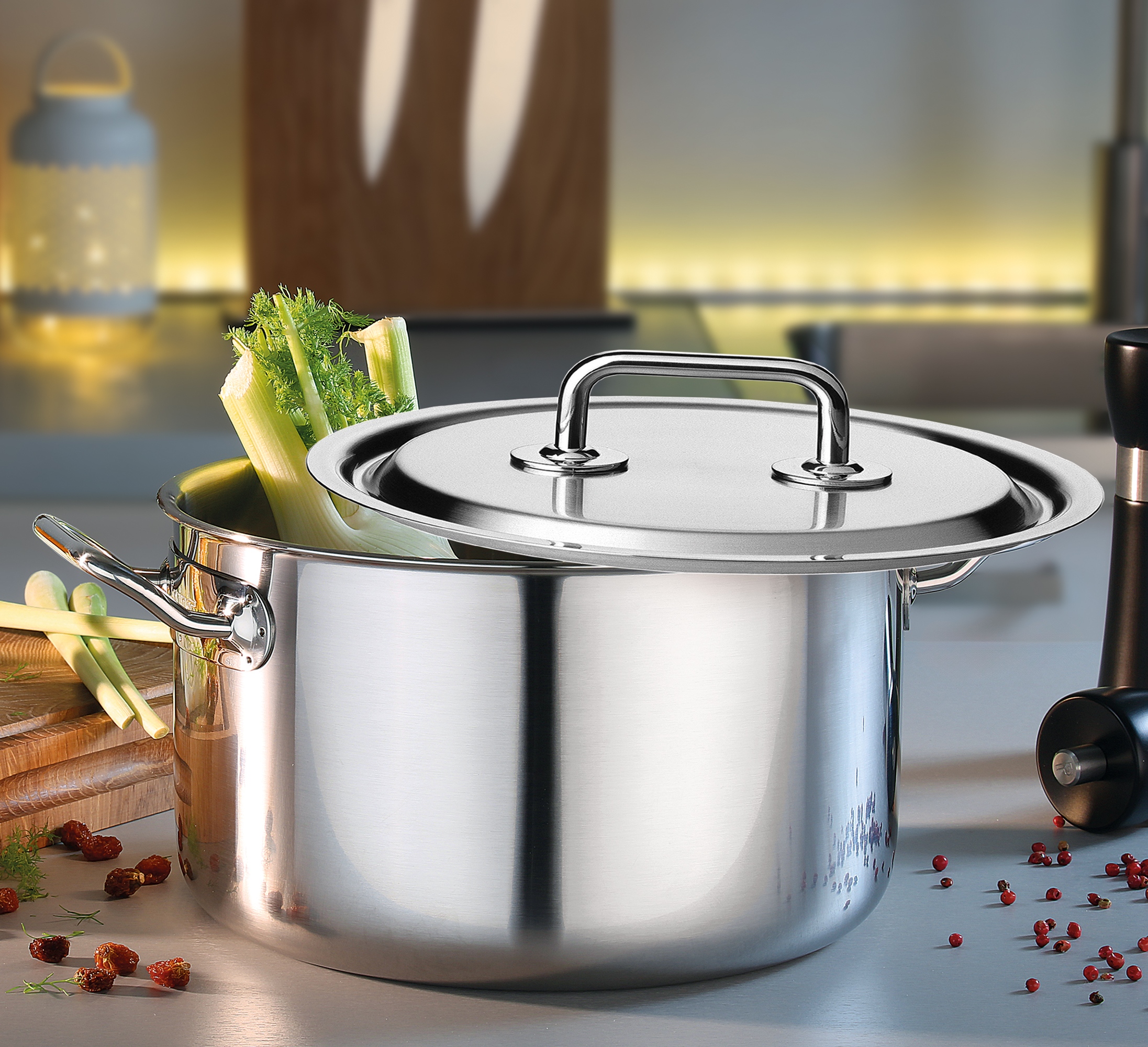 Eine perfekte Mahlzeit beginnt mit dem richtigen Equipment. Die Topf-Serie BRIGADE PREMIUM von SPRING ist da die ideale Wahl. Mit der cleveren Kombination von Funktion und Design sind Profis und ambitionierte Hobbyköche gut aufgestellt. Das 5-Lagen-Mehrschichtmaterial leitet die Wärme schnell und gleichmäßig bis zum Topfrand weiter. Sie sparen Zeit und Nerven – da Sie sich auf ein überzeugendes Ergebnis verlassen können. Der Topfdeckel mit dem stabilen Griff sitzt passgenau und ermöglicht ein wasserarmes, schonendes Garen, so dass Brokkoli, Zuckerschoten & Co. ihre Vitamine und die frische Farbe behalten. Auch mit den weiteren Eigenschaften punktet die Serie – der geschlossene Topfrand lässt Korrosion keine Chance, die handlichen Griffe sind wärmeisoliert und bleiben daher ganz cool, und die Innenskalierung ermöglicht das Abmessen direkt im Topf. Die gesamte Kochbrigade ist für alle Herdarten inklusive Induktion geeignet und spülmaschinenfest.
