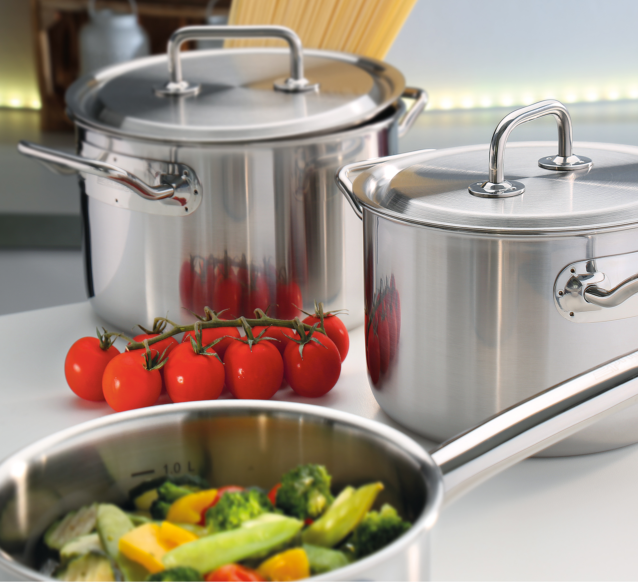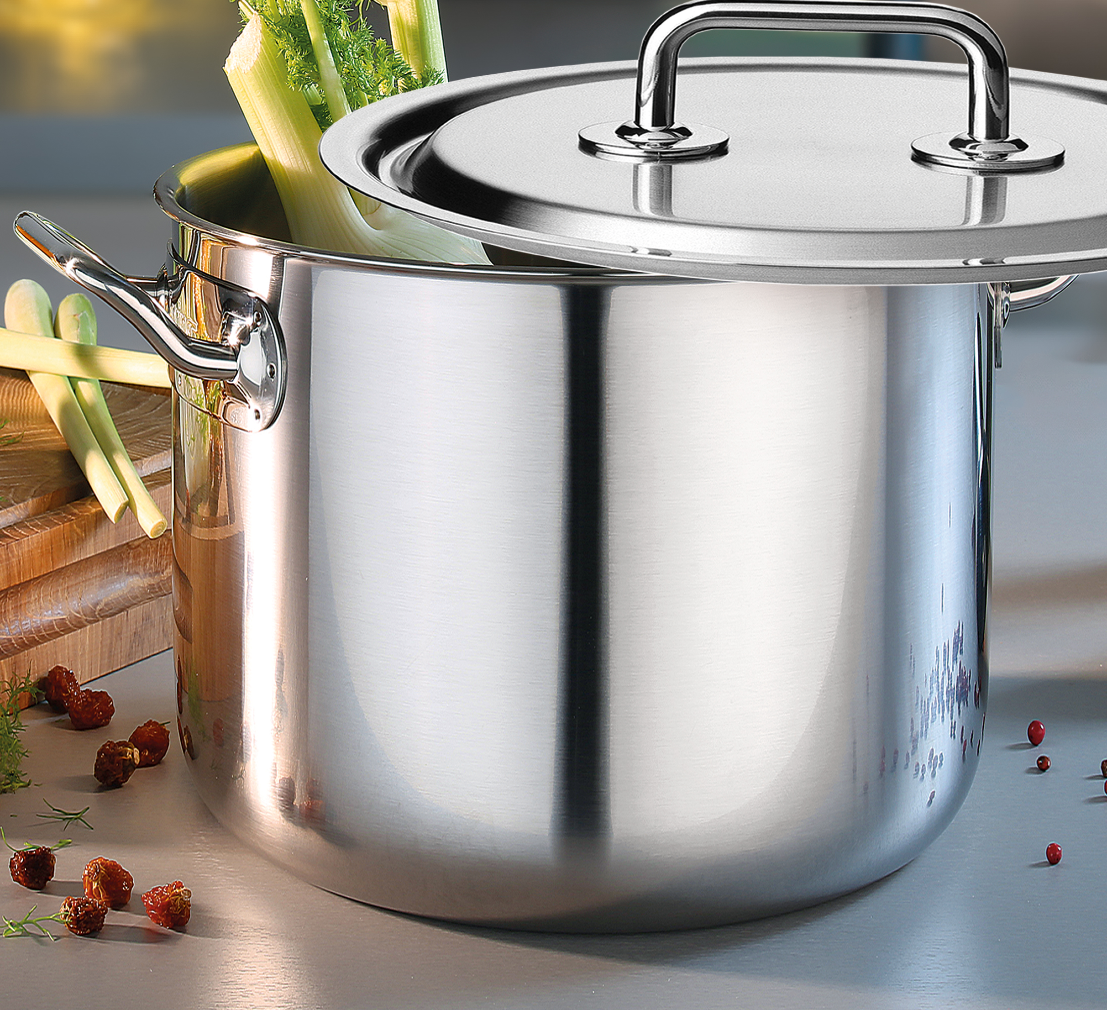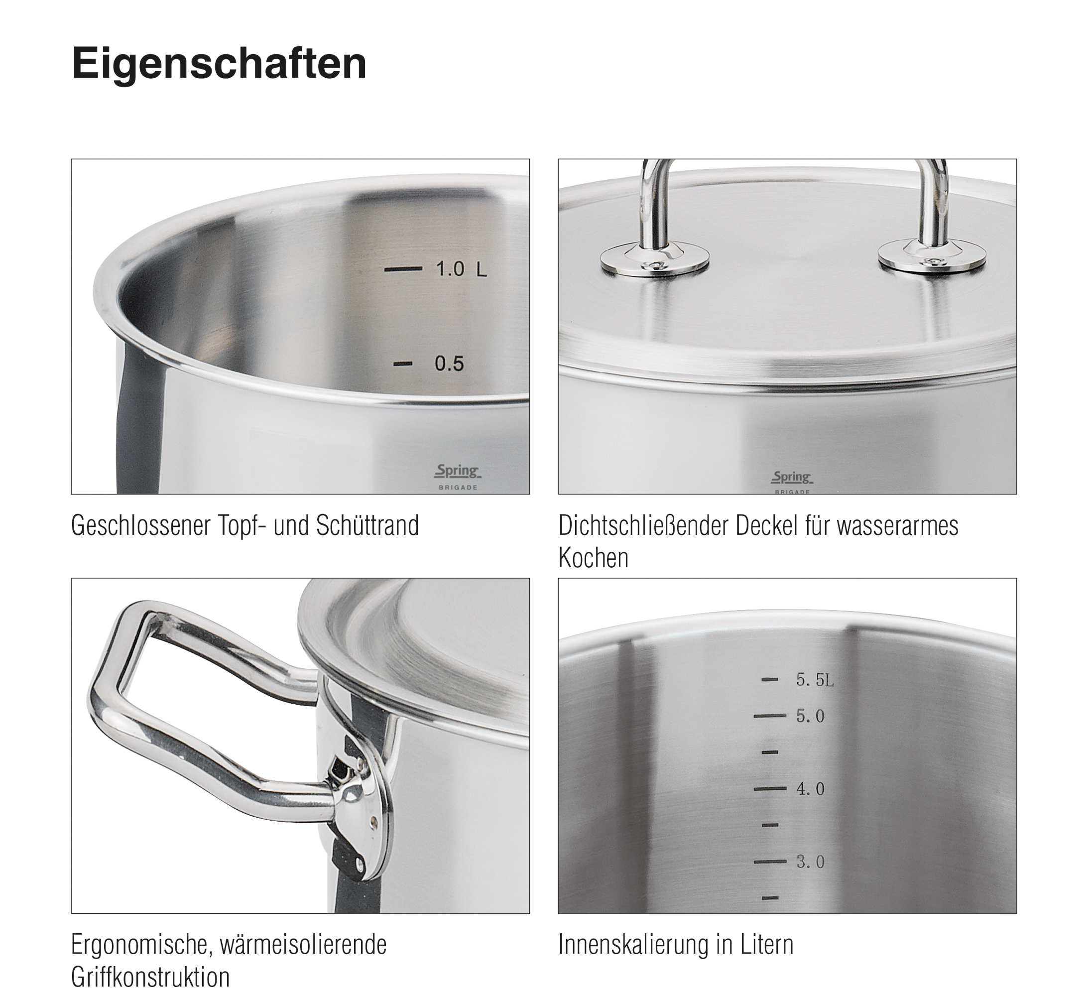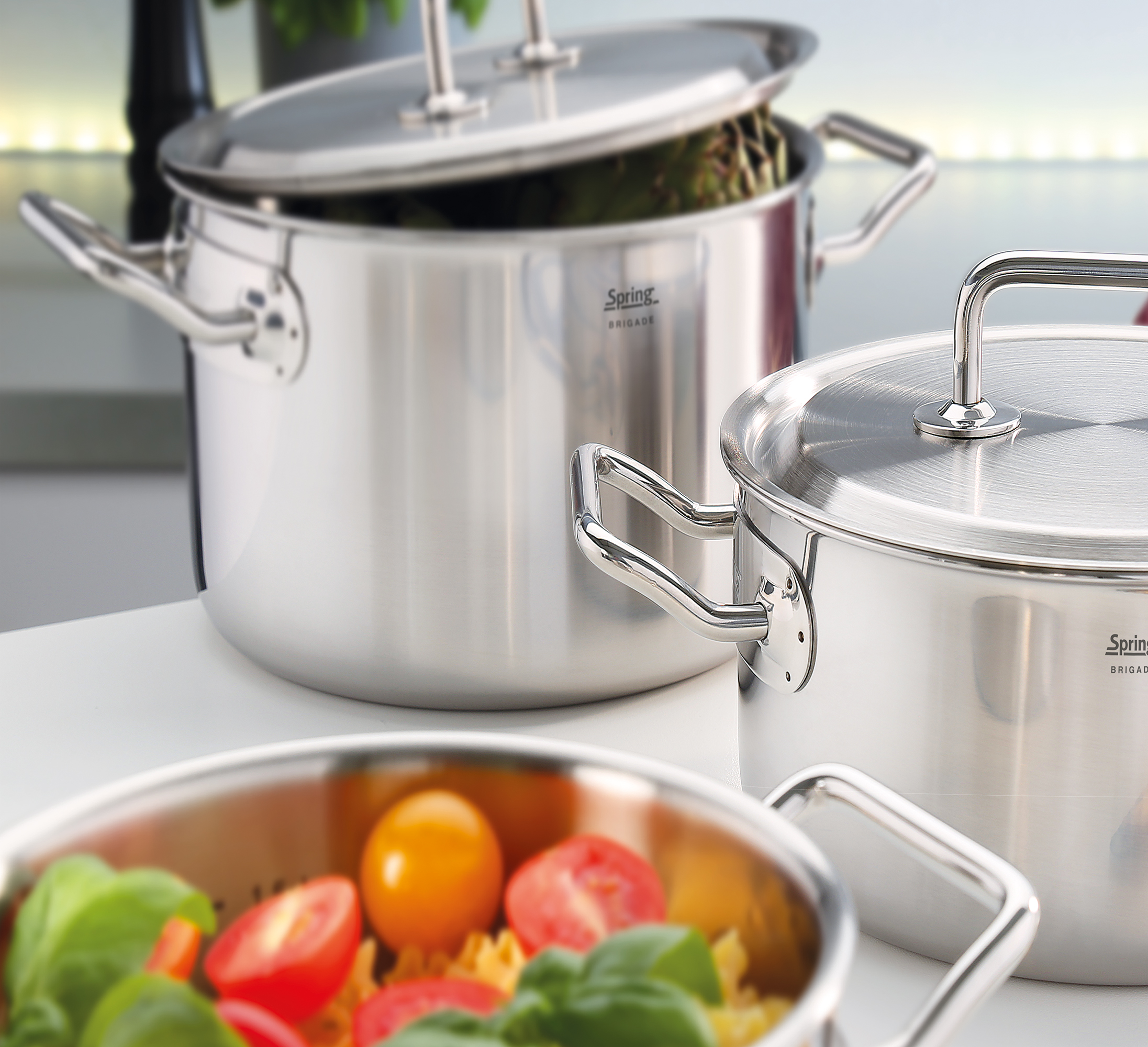 Eine perfekte Mahlzeit beginnt mit dem richtigen Equipment. Die Topf-Serie BRIGADE PREMIUM von SPRING ist da die ideale Wahl. Mit der cleveren Kombination von Funktion und Design sind Profis und ambitionierte Hobbyköche gut aufgestellt. Das 5-Lagen-Mehrschichtmaterial leitet die Wärme schnell und gleichmäßig bis zum Topfrand weiter. Sie sparen Zeit und Nerven – da Sie sich auf ein überzeugendes Ergebnis verlassen können. Der Topfdeckel mit dem stabilen Griff sitzt passgenau und ermöglicht ein wasserarmes, schonendes Garen, so dass Brokkoli, Zuckerschoten & Co. ihre Vitamine und die frische Farbe behalten. Auch mit den weiteren Eigenschaften punktet die Serie – der geschlossene Topfrand lässt Korrosion keine Chance, die handlichen Griffe sind wärmeisoliert und bleiben daher ganz cool, und die Innenskalierung ermöglicht das Abmessen direkt im Topf. Die gesamte Kochbrigade ist für alle Herdarten inklusive Induktion geeignet und spülmaschinenfest.
