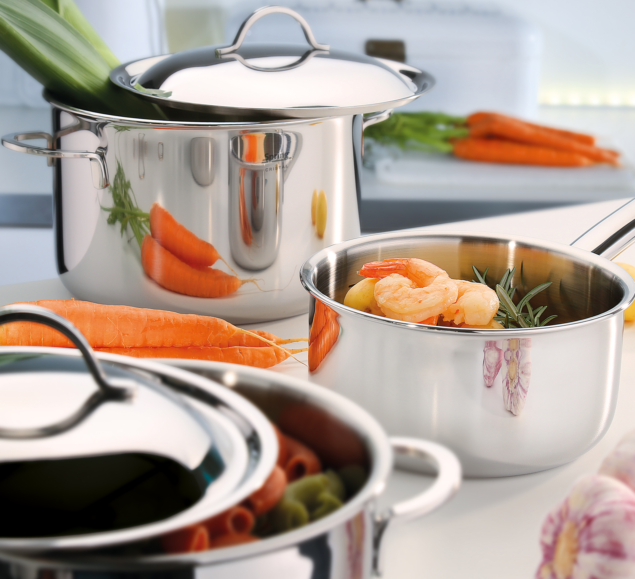 Der Edelstein unserer Topf-Serien. Klar in der Form, unabhängig von Modetrends setzt CRISTAL von SPRING Maßstäbe in der Küche. Die Oberfläche aus hochglanzpoliertem Edelstahl fällt sofort angenehm ins Auge. Innen kommen nochmals Edelstahl und ein dreifacher Aluminiumkern zum Einsatz. Diese 5 Schichten ermöglichen einen Rundum-Kocheffekt, die Wärme verteilt sich optimal im ganzen Topf und die Zutaten werden schonend gegart. So bleiben die Vitamine und der Geschmack erhalten. Darüber freuen sich Ihre Gäste, wenn Sie zarten Rinderbraten, eine mediterrane Gemüse-Kasserolle mit Basilikum und Thymian oder gedämpften Fisch mit Chili, Ingwer und Sherry servieren. Der geschlossene Topfrand schützt vor Korrosion, damit Sie noch viele Rezepte ausprobieren können. Die Serie Cristal ist für alle Herdarten geeignet, inklusive Induktion.
