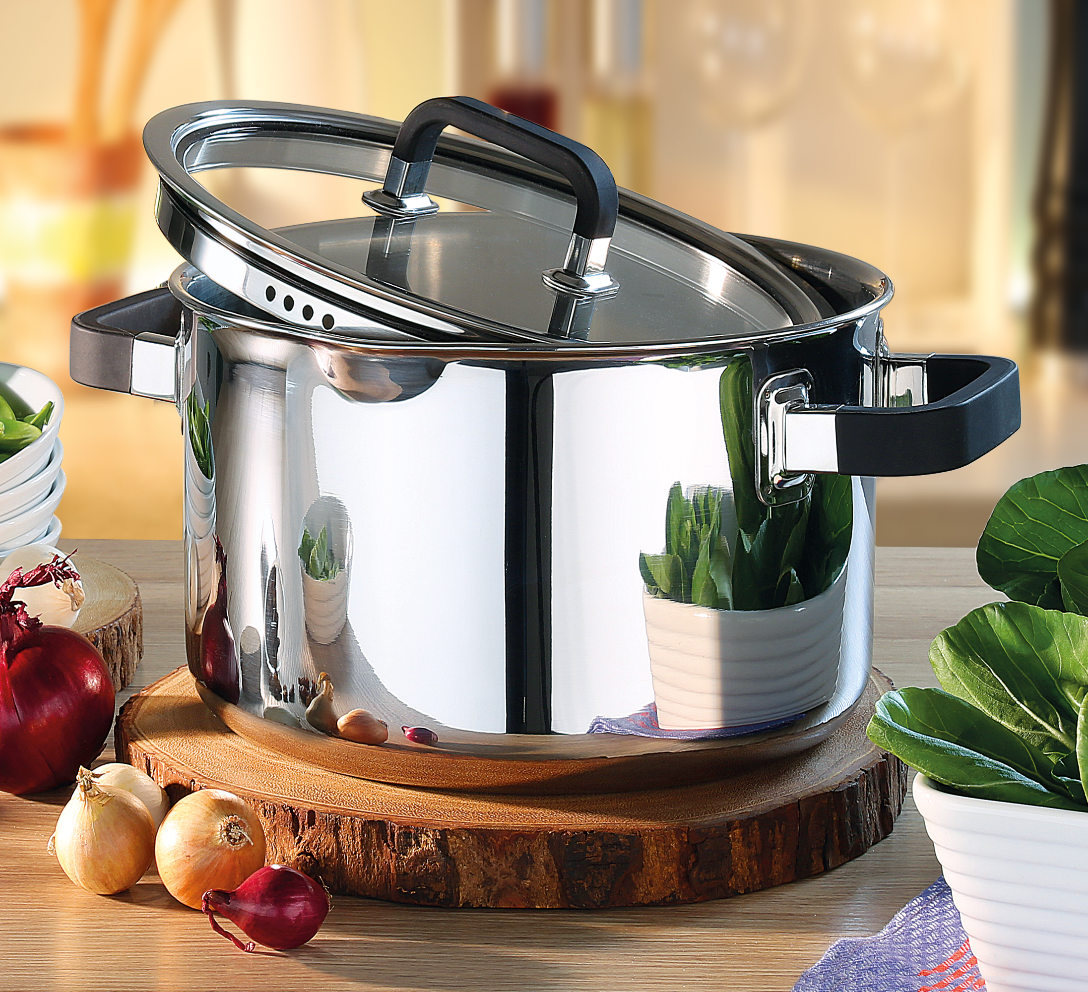 Edelstahl trifft Silikon. Die Griffe der Topfserie FUSION2+ von SPRING sind silikonummantelt. Das unterscheidet sie von den übrigen Serien des Traditionsunternehmens mit Schweizer Wurzeln. Bekannt und bewährt ist das 5-Lagen-Mehrschichtmaterial. Es leitet die Wärme schnell und gleichmäßig vom Boden bis in die Topfwand. Küchenchefs der Spitzengastronomie und ambitionierte Hobbyköche schätzen diese zeitsparende Art des Kochens. Weiterer Pluspunkt: Geschmack und Biss der Lebensmittel bleiben voll erhalten. Die Innenskalierung in Litern hilft bei der Zubereitung von Nudeln, Reis oder Gemüse, der Glasdeckel gewährt Ihnen beim wasserarmen Garen den Durchblick. Der speziell geformte, geschlossene Schüttrand ermöglicht das punktgenaue und kleckerfreie Abgießen von Flüssigkeiten und das Abdampfen gekochter Lebensmittel.