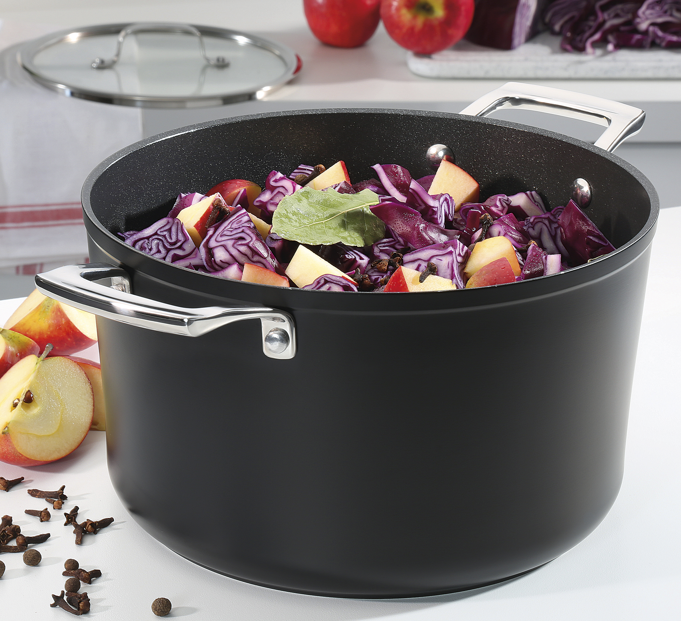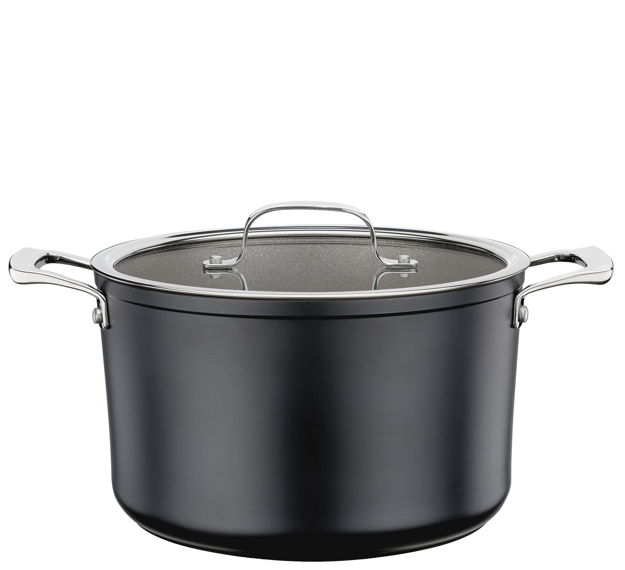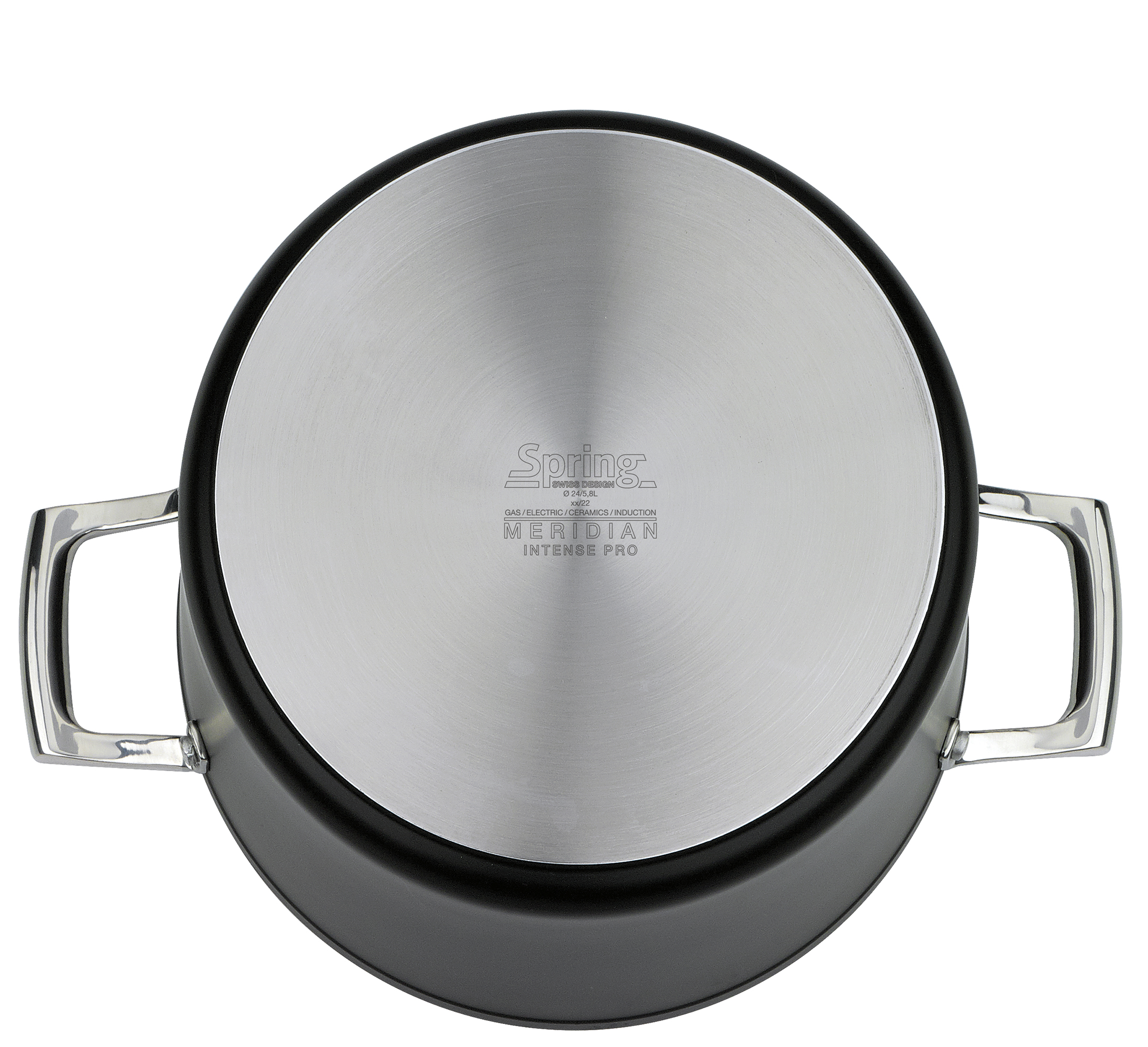 Ganz auf Ideallinie. Das Design der Serie MERIDIAN INTENSE PRO von SPRING ist klar, die Verbindung aus schwarz mattem Aluminium und glänzendem Edelstahl ein Hingucker bei Tisch. Die Funktionalität orientiert sich an den Bedürfnissen von Spitzen- und Hobbyköchen rund um den Globus. Der Topfkörper aus 100% recyceltem Aluminium gibt die Wärme schnell und gleichmäßig weiter, der Vollflächen-Induktionsboden reagiert im Nu auf die ausgewählte Temperatur. Der Deckel aus hitzebeständigem Glas ermöglicht ein energiesparendes Sichtgaren: wenig Wasser, voller Geschmack. Dank der kratzfesten, hitzebeständigen Antihaftversiegelung mit Partikeln aus echten Schweizer Bergkristallen bleibt in dem Kochgeschirr mit den ergonomisch geformten Griffen nichts kleben. Geeignet für alle Herdarten, inklusive Induktion. Der robuste Kochtopf ist der Allrounder für jeden Tag: vom Apfelrotkohl bis zur Zwiebelsuppe.
