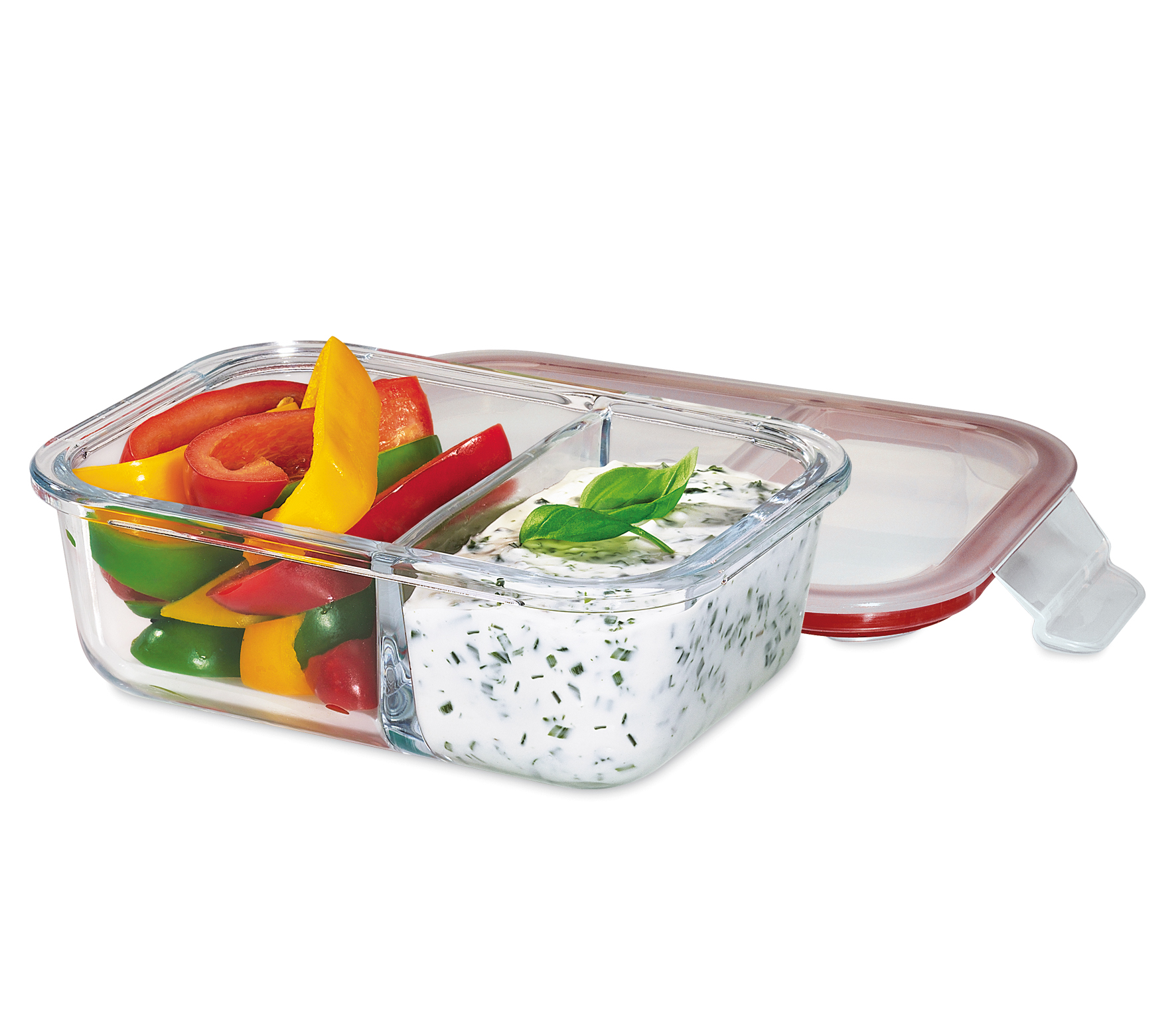Material: Glas, hochwertiger Kunststoff. Deckel mit Silikondichtung. 2 Kammern.