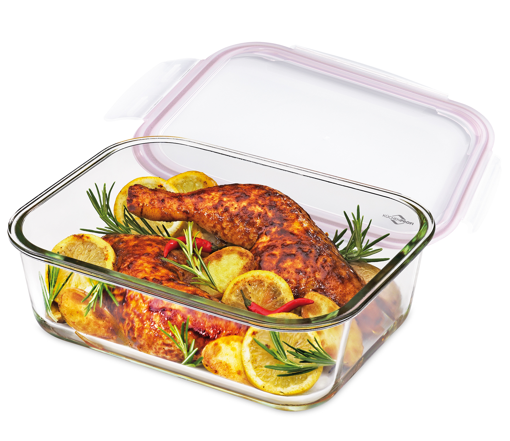 Sie haben bei Ihrer Ernährung den Durchblick und bestimmen gerne selbst, was auf dem Teller landet? Da kommt die Lunchbox/Vorratsdose von KÜCHENPROFI genau richtig. Sie ist aus Glas gefertigt und zeigt auf einen Blick, was in ihr steckt. Mit dem fest sitzenden Deckel samt Silikondichtung gehen Sie auf Nummer sicher, wenn Sie den Behälter mit ins Büro oder auf die Urlaubsreise nehmen. Die praktische Box ist zudem mikrowellenfest, darf in den Tiefkühler und ohne Deckel auch in den Backofen.