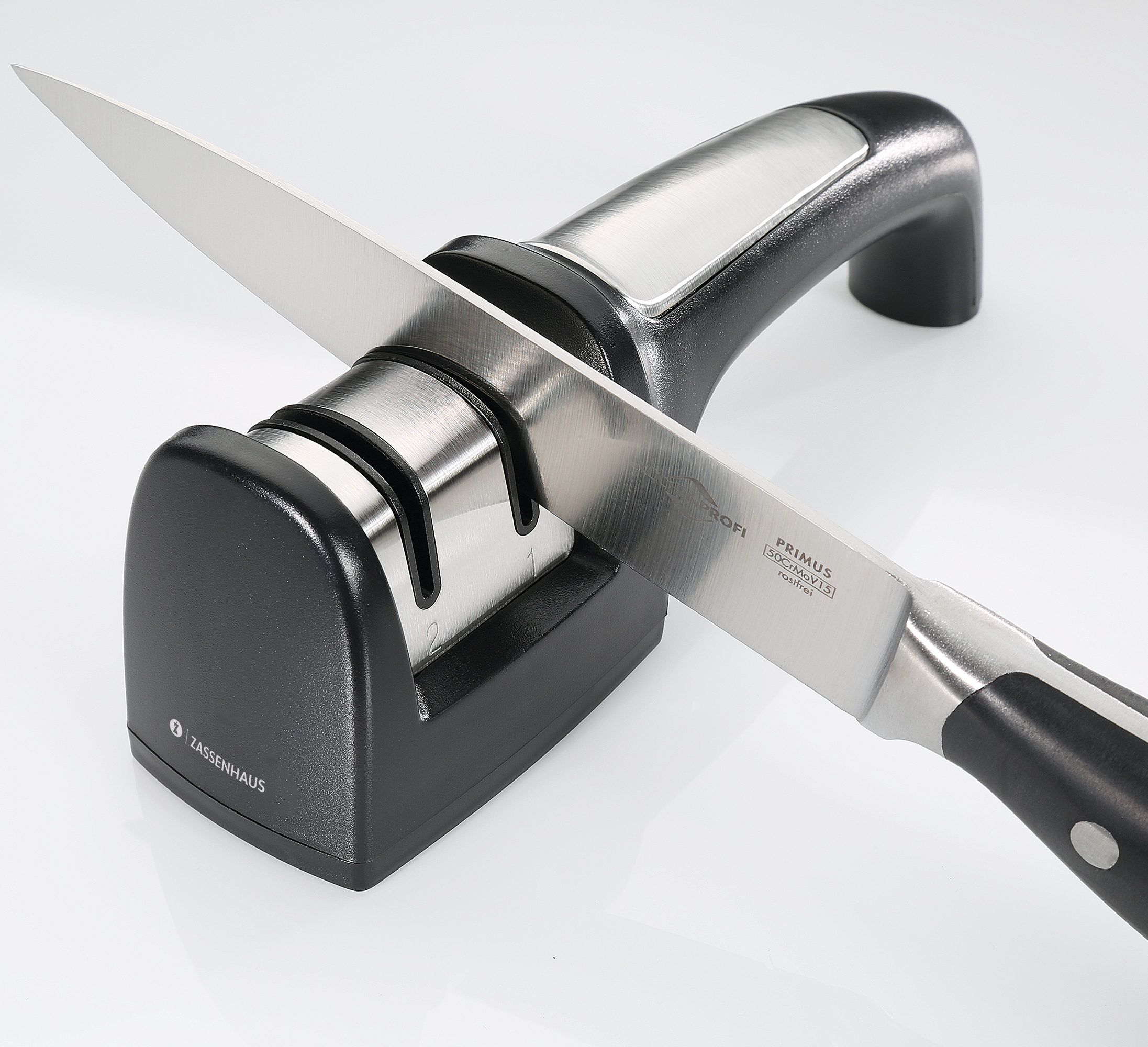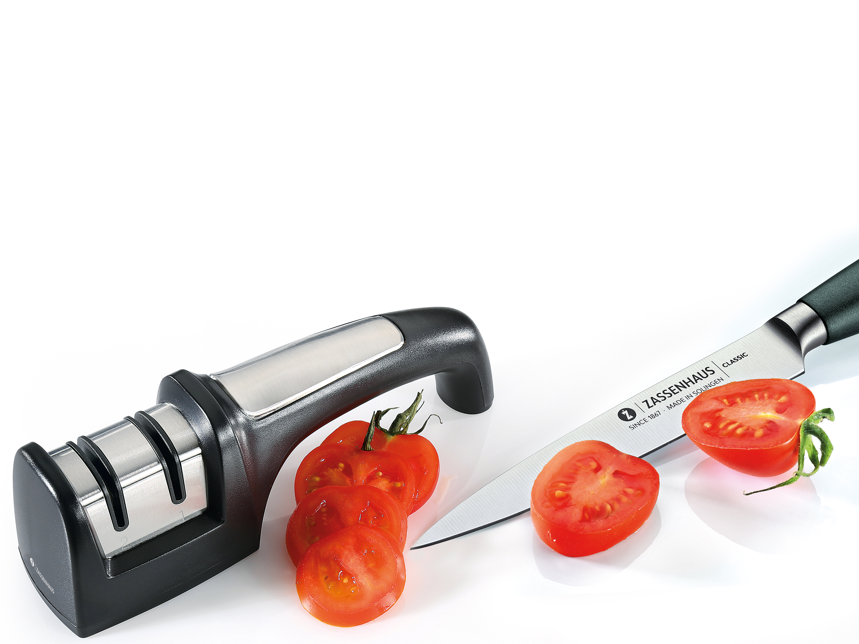 Das Fleisch ist zerfasert, die Tomate zerquetscht – stumpfe Messer sind ein Ärgernis. Der 2-Stufen Diamant-Messerschärfer von ZASSENHAUS schafft hier Abhilfe. Er verfügt über zwei Stufen für Grob- und Feinschliff. Die rutschfeste Gummierung gewährt verlässlichen Halt. Beim Messerschärfer kommt bei beiden Stufen ein Diamantstein zum Einsatz. Das Ergebnis überzeugt Profi- und Hobbyköche gleichermaßen. Praktisch: Der Schleifwinkel ist vorgegeben, das erleichtert die Arbeit. Dank des ergonomischen Griffs liegt das Gerät gut und sicher in der Hand.
