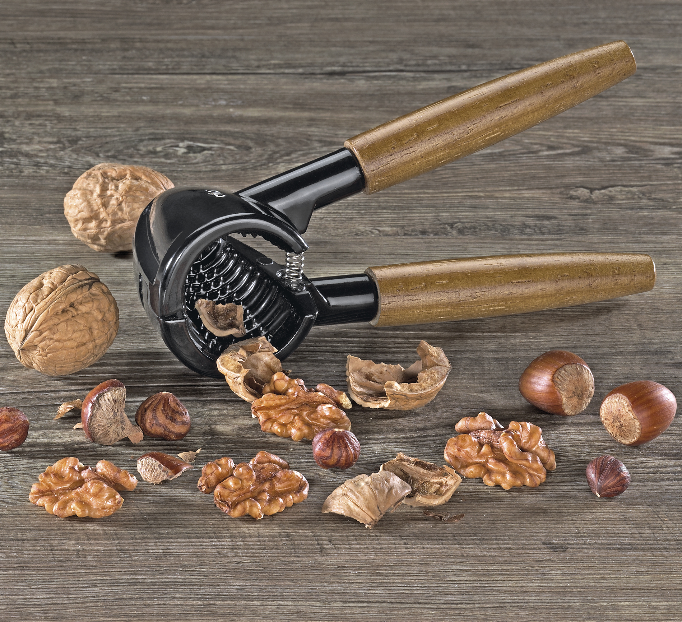 Ob als Backzutat, Salatkrönung oder gesunder Snack – Nüsse sind köstlich. Mit dem Nussknacker KNACKI LEGNO von cilio öffnen Sie Hasel-, Walnuss & Co. mühelos und sauber. Das solide Metall liegt gut in der Hand, die langen Griffe aus edlem Holz nutzen die Hebelwirkung optimal. Die Nüsse werden unversehrt geknackt, es fliegen keine Stücke der Schale umher. Der Nussknacker lässt sich außerdem zum bequemen Öffnen von Schraubverschlüssen und Champagnerkorken einsetzen.