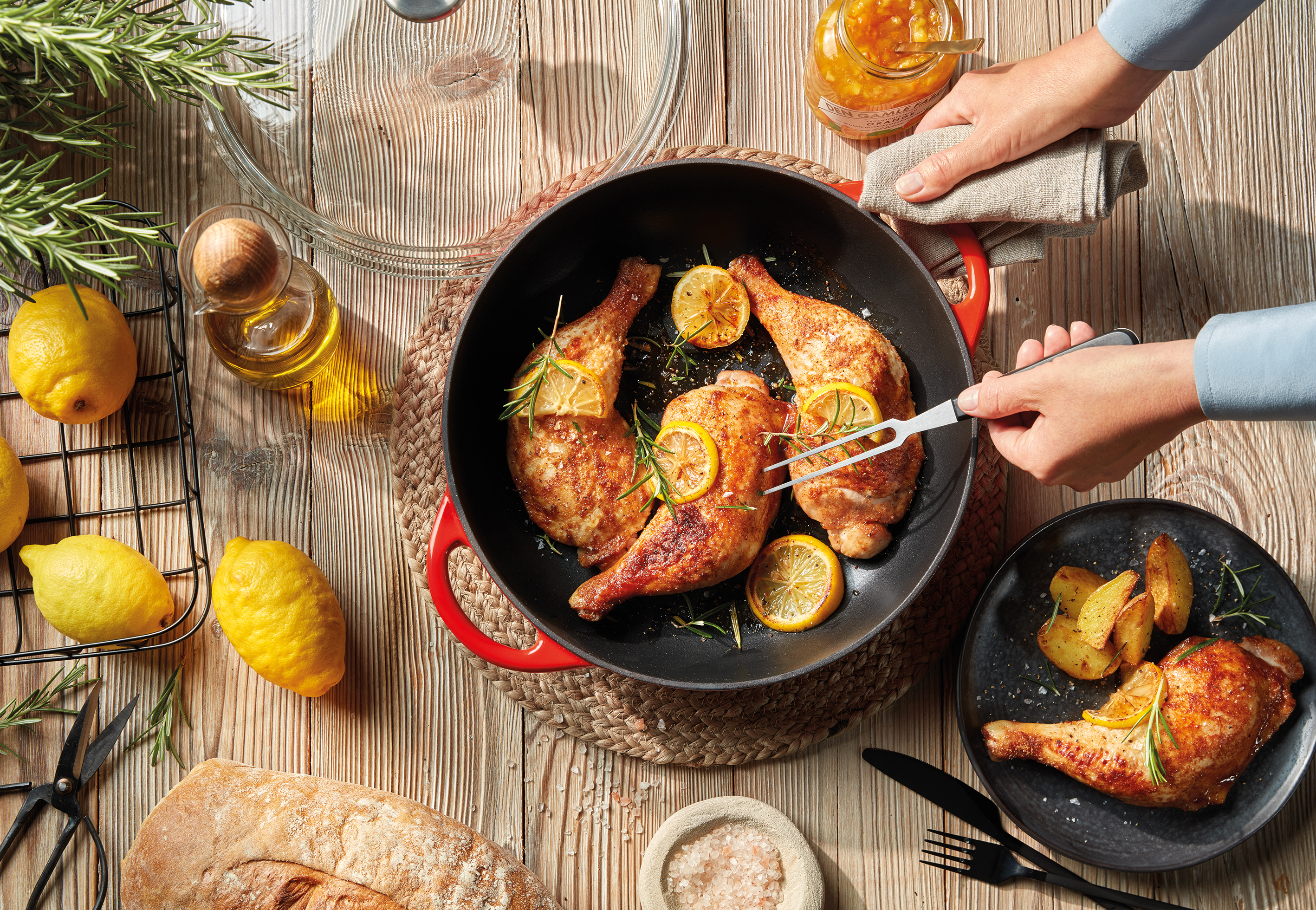 Von der Sonne verwöhntes Gemüse, Lammfleisch aus dem Hochland, Fisch und Meeresfrüchte – das alles bietet die Provence. Vielseitig, leicht und gesund ist die Küche dieser südfranzösischen Region. In dieser Tradition steht die KÜCHENPROFI Guss-Kollektion PROVENCE. Die Serie ist ideal zum Schmoren, Köcheln, Kochen, Braten und Frittieren. Das Gusseisen nimmt die Hitze schnell auf und verteilt sie optimal. So können Sie nach kurzer Zeit die Energiezufuhr reduzieren – das spart Strom und erhält das Aroma Ihrer Lebensmittel. Die PROVENCE-Kochgeschirre sind für alle Herdarten inklusive Induktion geeignet, die Knöpfe bis 250 °C backofenfest. Beim stilvollen Servieren ist das Kochgeschirr der Frische-Kick auf Ihrer Tafel. Das ebenso zeitlose wie durchdachte Design mit den handlichen Knöpfen und ergonomischen Griffen ist ein echter Blickfang. Und jetzt ist Ihre Fantasie gefragt. Wie wäre es mit einem Miesmuscheleintopf mit Seelachs, Lauch, Kartoffeln und einem Schuss Wermut? Bon appétit!