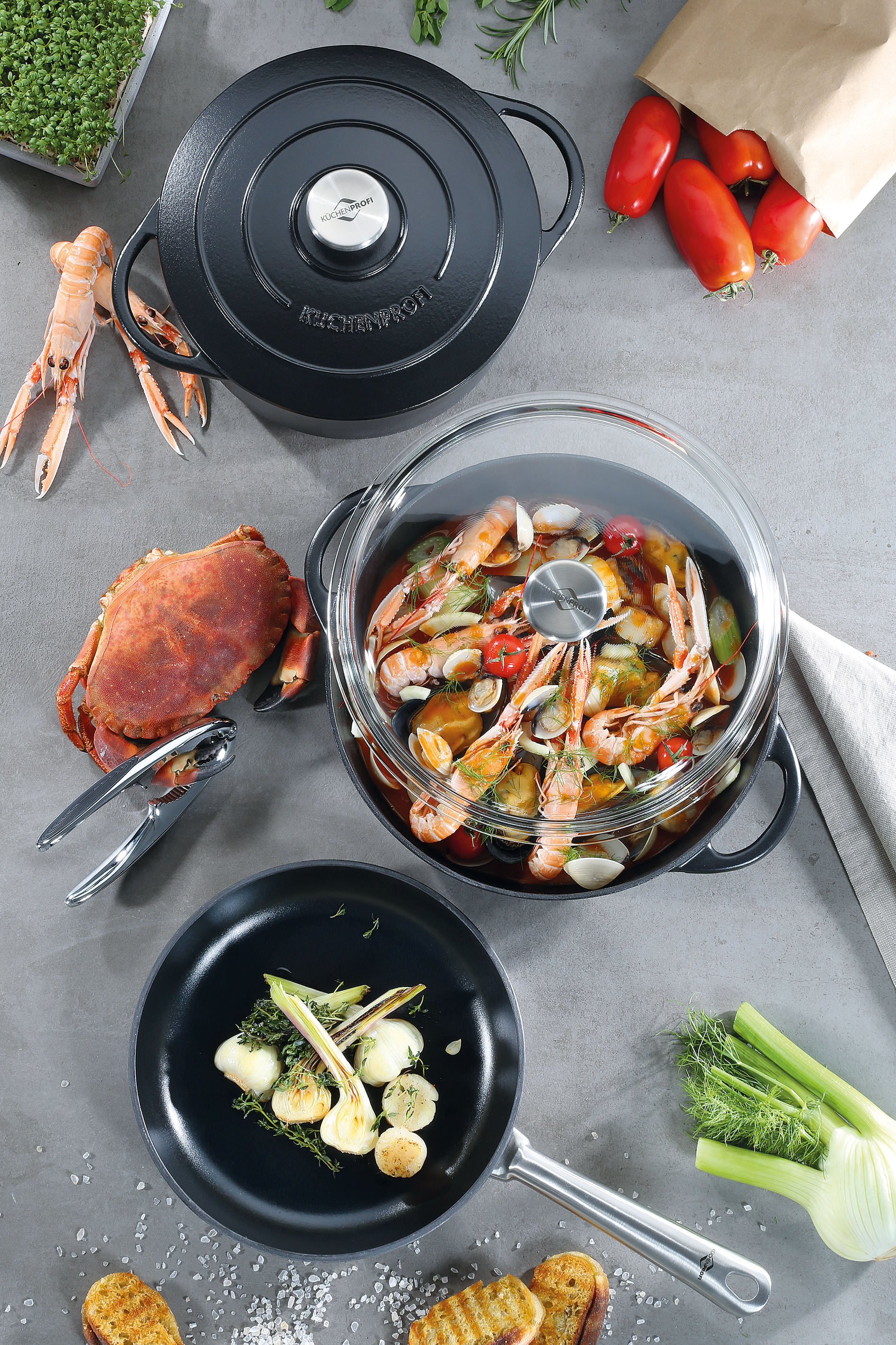 Von der Sonne verwöhntes Gemüse, Lammfleisch aus dem Hochland, Fisch und Meeresfrüchte – das alles bietet die Provence. Vielseitig, leicht und gesund ist die Küche dieser südfranzösischen Region. In dieser Tradition steht die KÜCHENPROFI Guss-Kollektion PROVENCE. Die Serie ist ideal zum Schmoren, Köcheln, Kochen, Braten und Frittieren. Das Gusseisen nimmt die Hitze schnell auf und verteilt sie optimal. So können Sie nach kurzer Zeit die Energiezufuhr reduzieren – das spart Strom und erhält das Aroma Ihrer Lebensmittel. Die PROVENCE-Kochgeschirre sind für alle Herdarten inklusive Induktion geeignet, die Knöpfe bis 250 °C backofenfest. Beim stilvollen Servieren ist das Kochgeschirr der Frische-Kick auf Ihrer Tafel. Das ebenso zeitlose wie durchdachte Design mit den handlichen Knöpfen und ergonomischen Griffen ist ein echter Blickfang. Und jetzt ist Ihre Fantasie gefragt. Wie wäre es mit einem Miesmuscheleintopf mit Seelachs, Lauch, Kartoffeln und einem Schuss Wermut? Bon appétit!